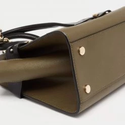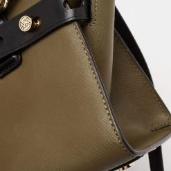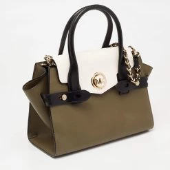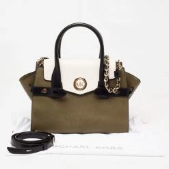 This Carmen satchel from Michael Kors is designed to offer function and style at the same time. It is made of tricolor leather and decorated with gold-tone hardware for an elegant look. The spacious shape is held by dual top handles and a shoulder strap.