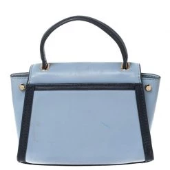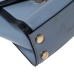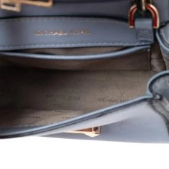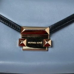 From Michael Kors, this Whitney bag is a grand fusion of brilliance and timeless style. It is fashioned in two-tone blue leather, with an engraved logo accent perched on the front. It is decorated with gold-tone fittings, a fabric-lined interior, and a top handle. Invest today in this beautiful bag.