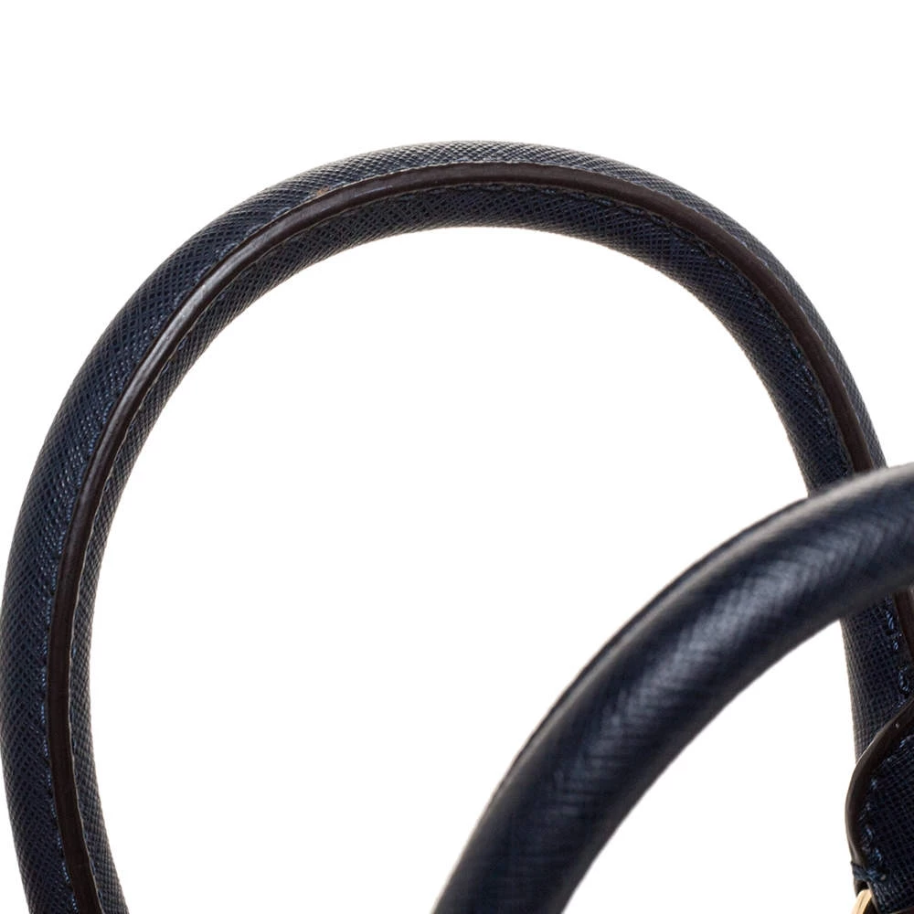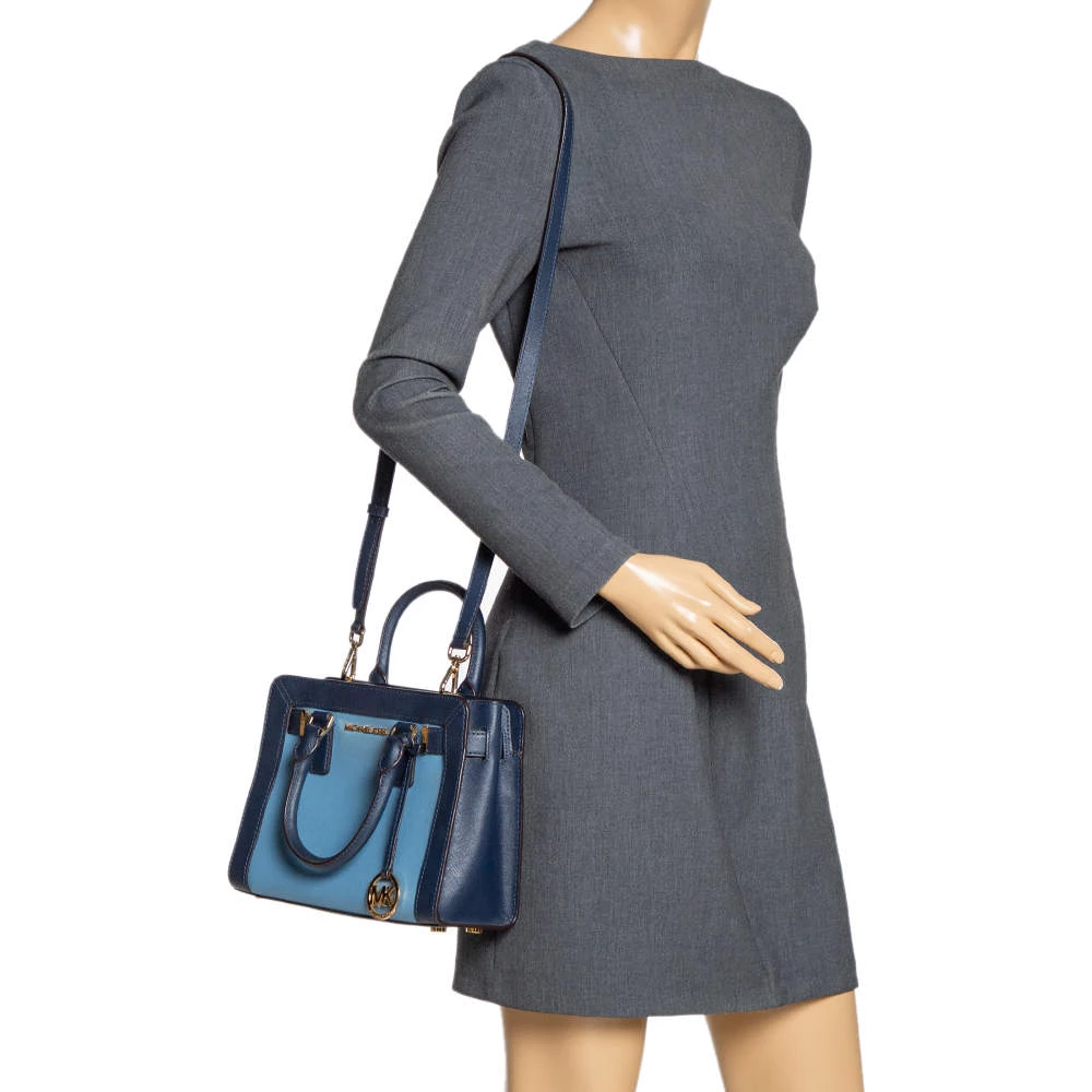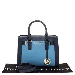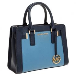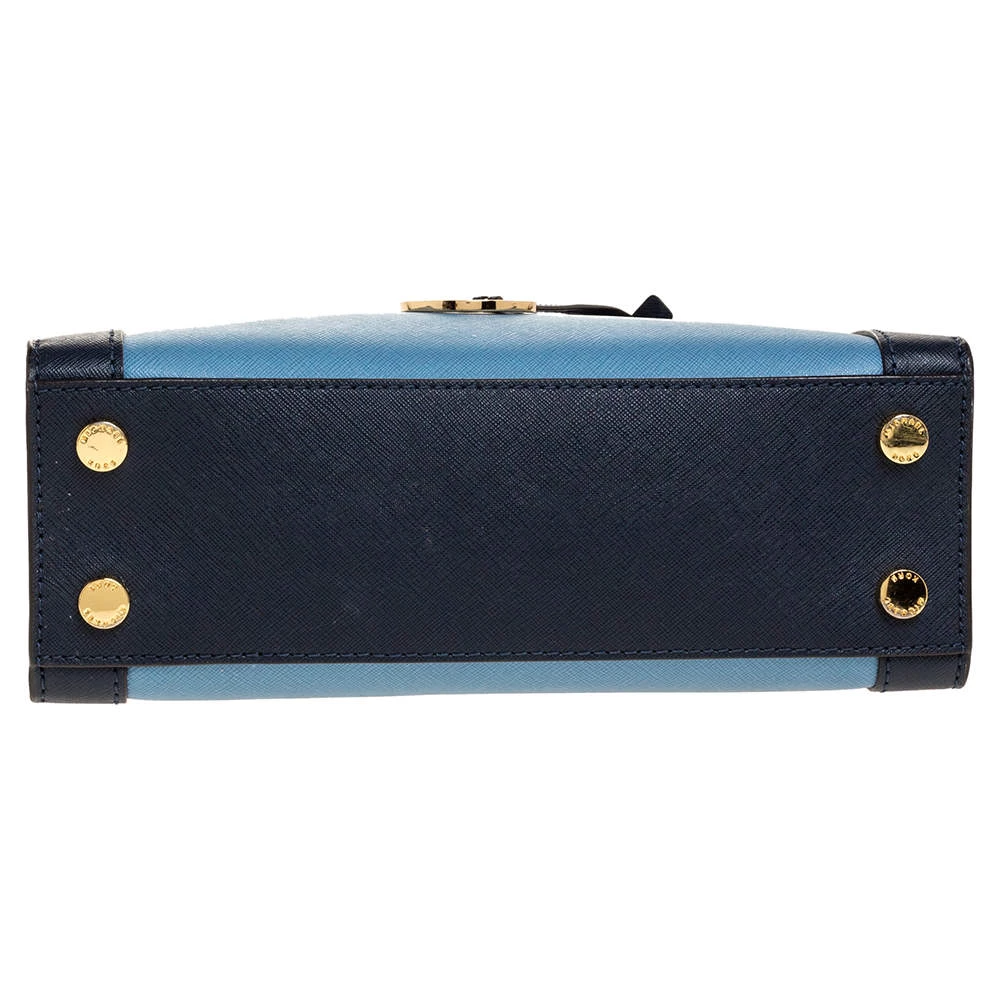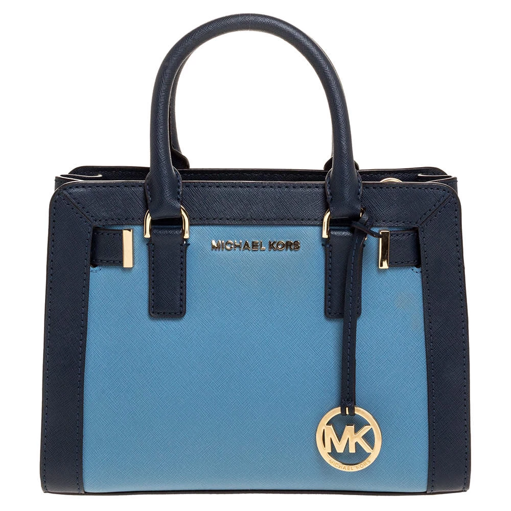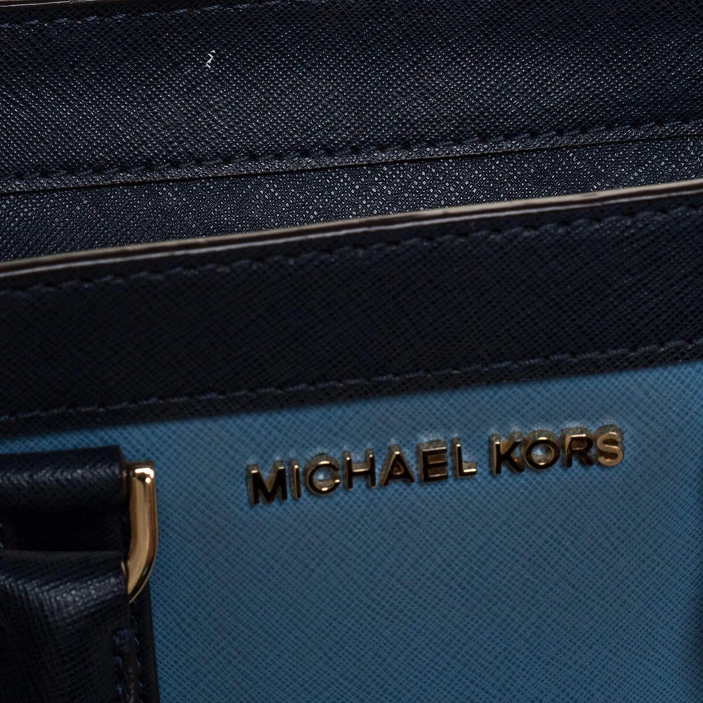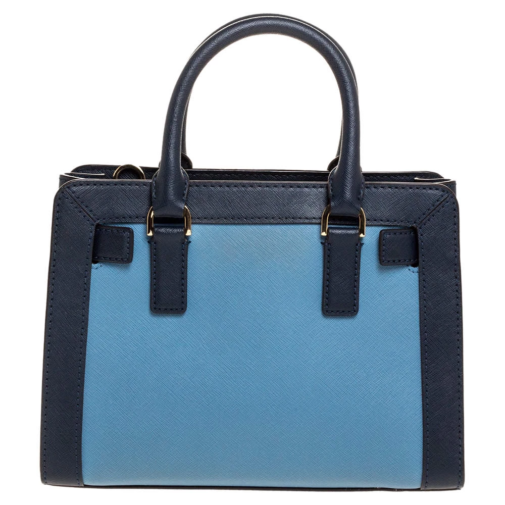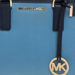 Deserving a very special place in your closet is this crossbody bag from Michael Kors! The two-tone blue bag is crafted from Saffiano leather and features dual top handles. It flaunts the brand logo on the front and opens to a spacious nylon-lined interior capable of holding all your daily essentials. It is complete with a detachable shoulder strap.