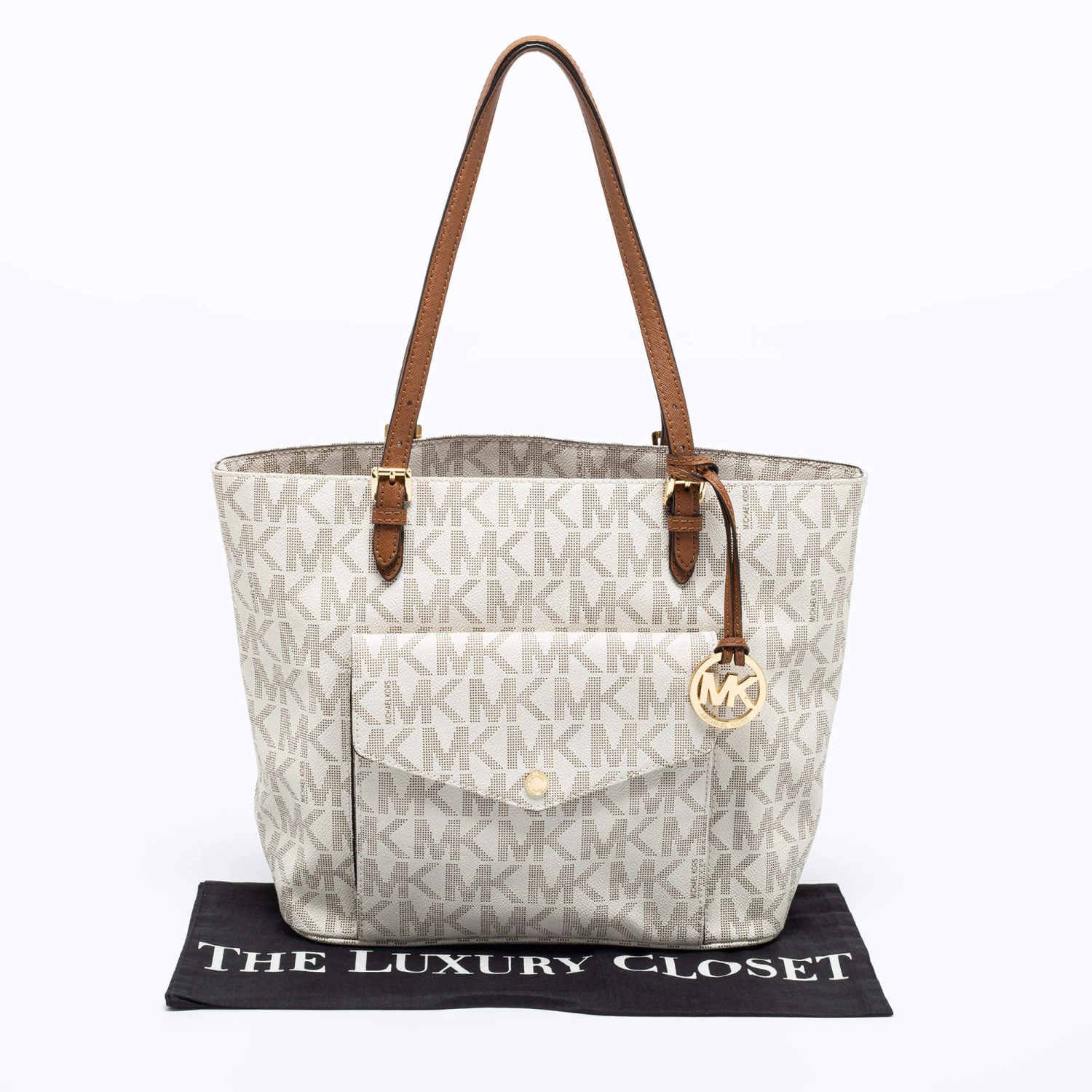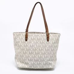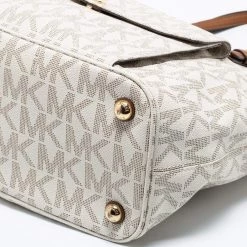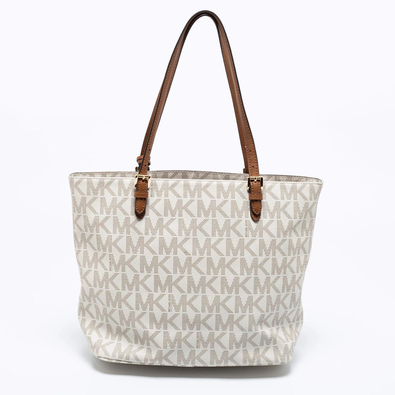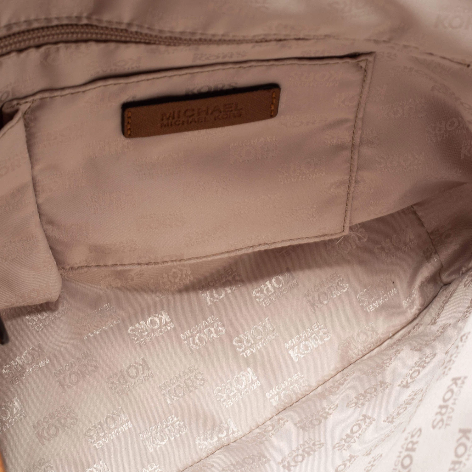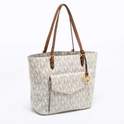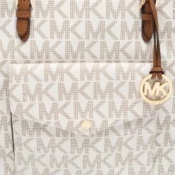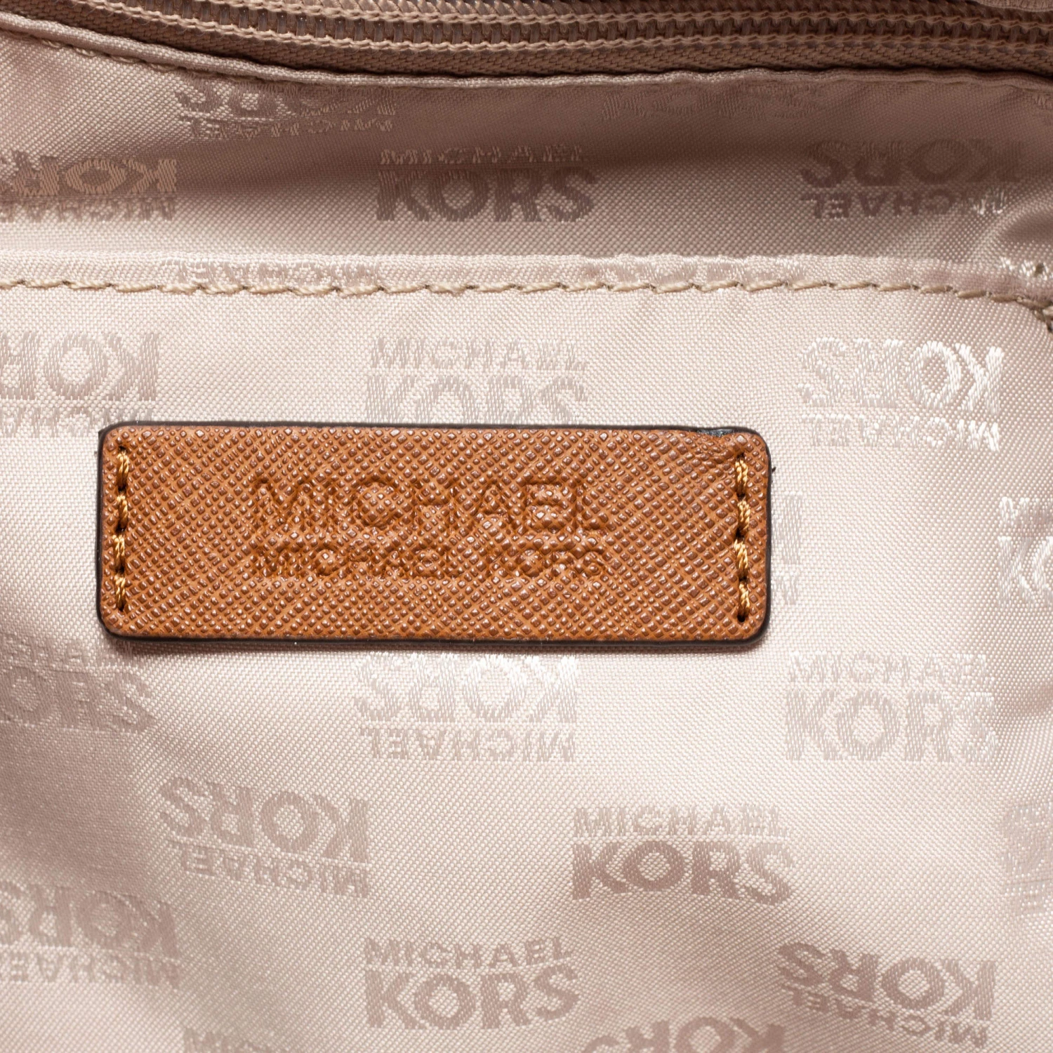 This Michael Kors Jet Set tote aims to provide you with practical ease. With a beautiful design and striking structure, this leather bag is filled with luxurious details. It exhibits dual handles for you to carry it in a chic way and a spacious fabric interior to hold all your essentials. The brand signature on the front makes it easily recognizable, and it is complete with a front button pocket.