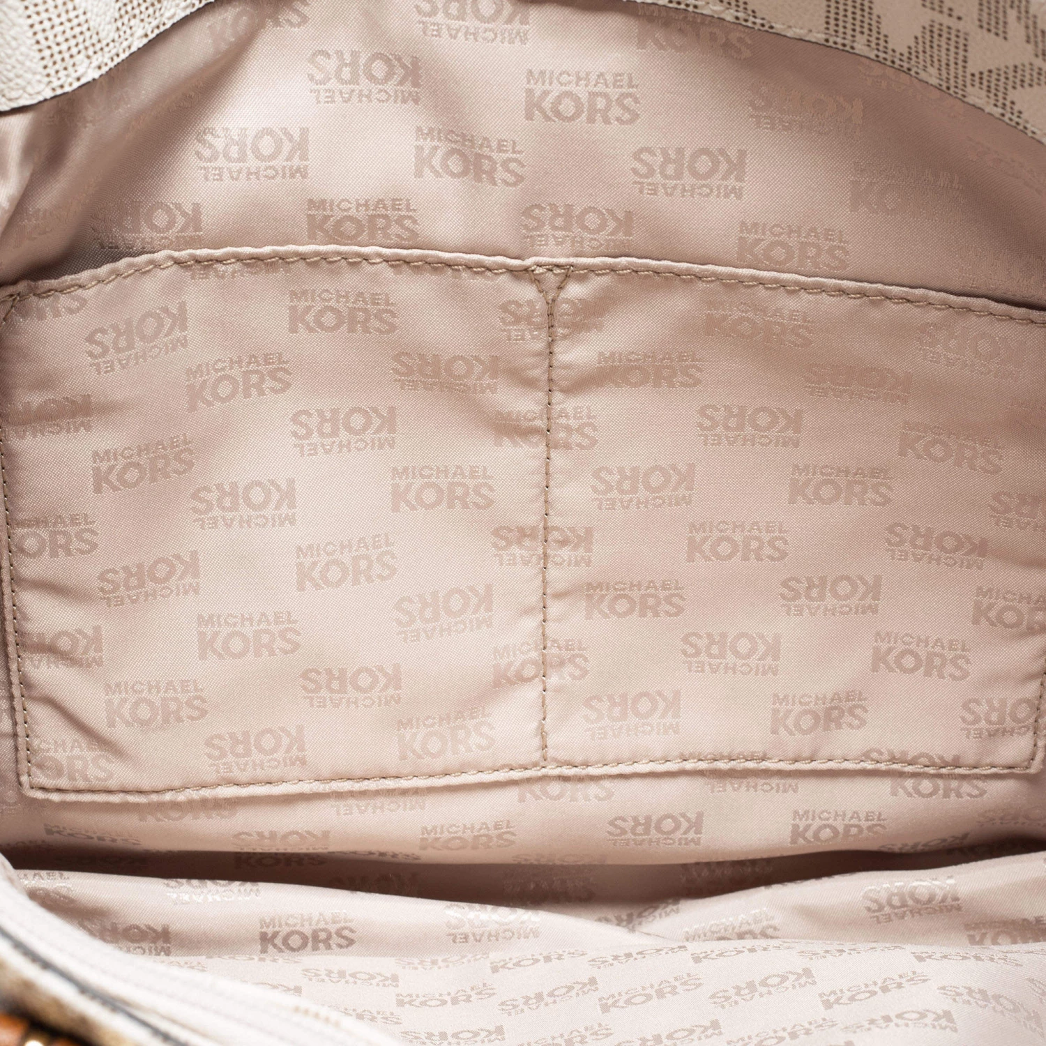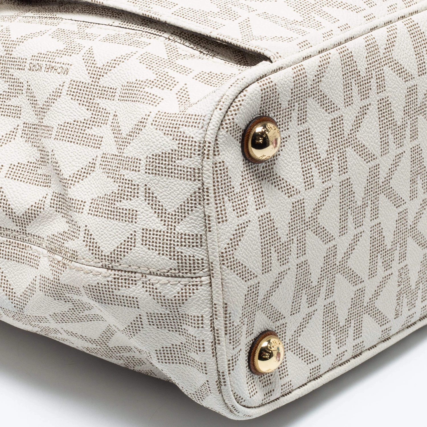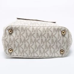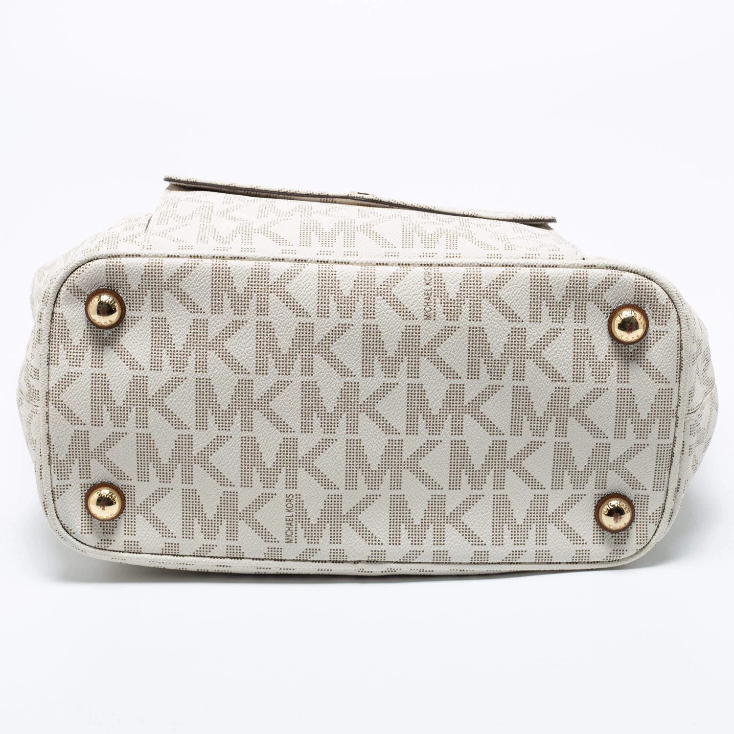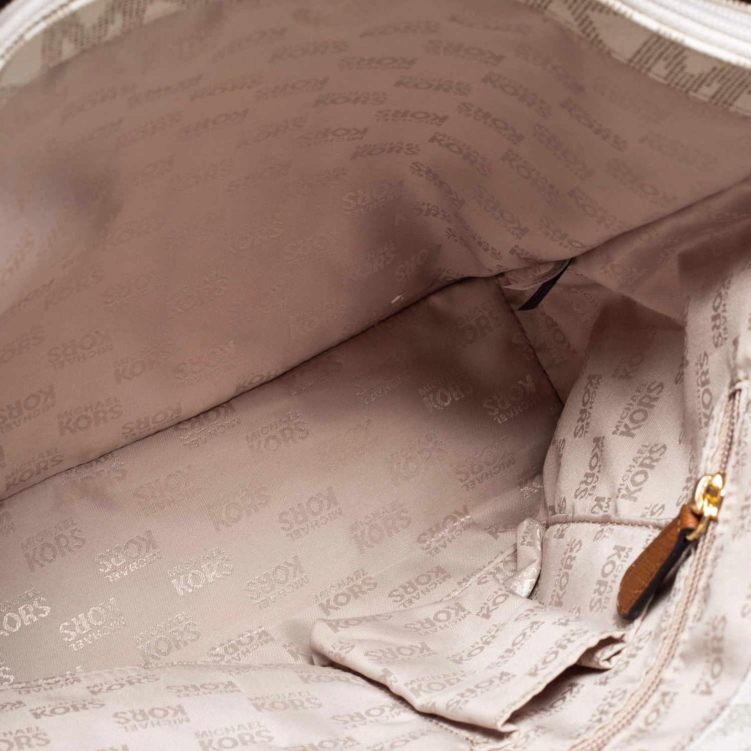 This Michael Kors Jet Set tote aims to provide you with practical ease. With a beautiful design and striking structure, this leather bag is filled with luxurious details. It exhibits dual handles for you to carry it in a chic way and a spacious fabric interior to hold all your essentials. The brand signature on the front makes it easily recognizable, and it is complete with a front button pocket.