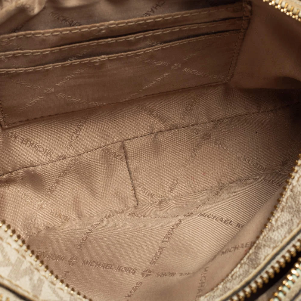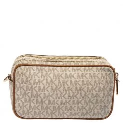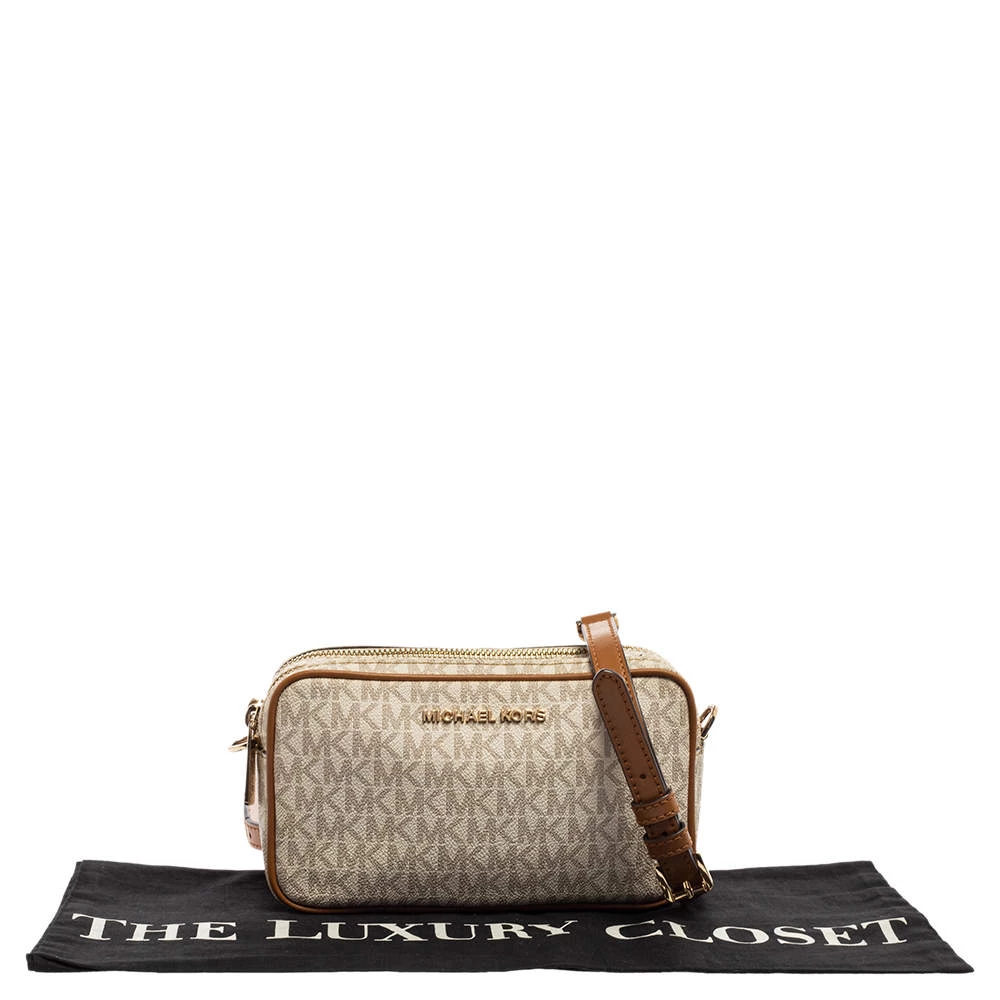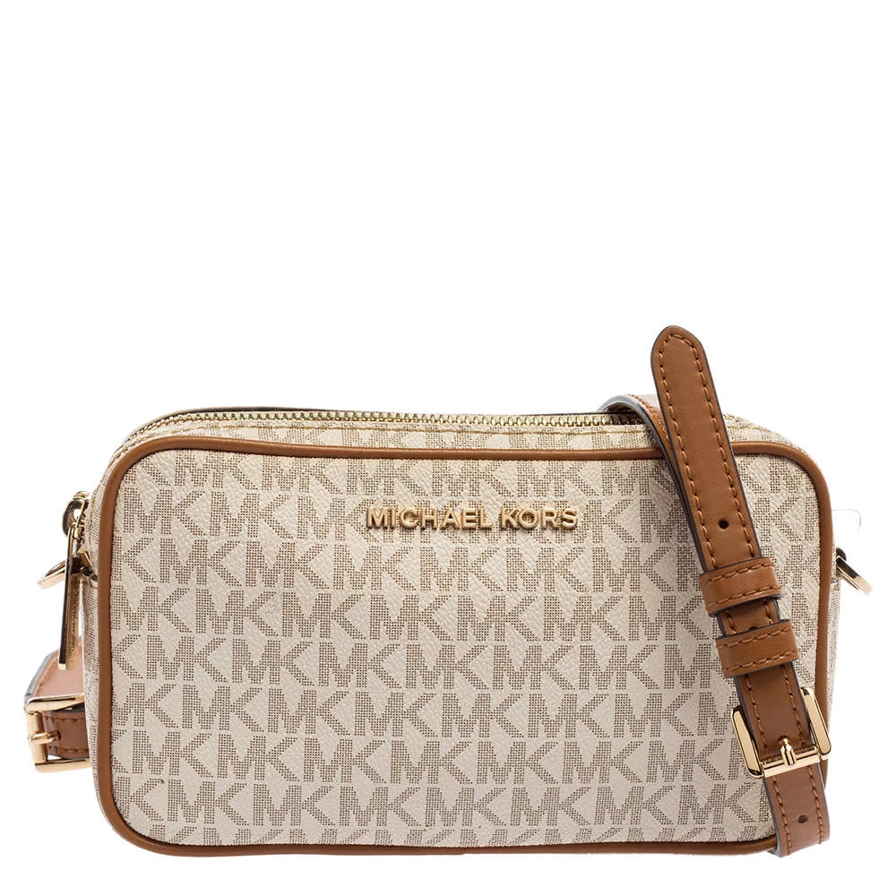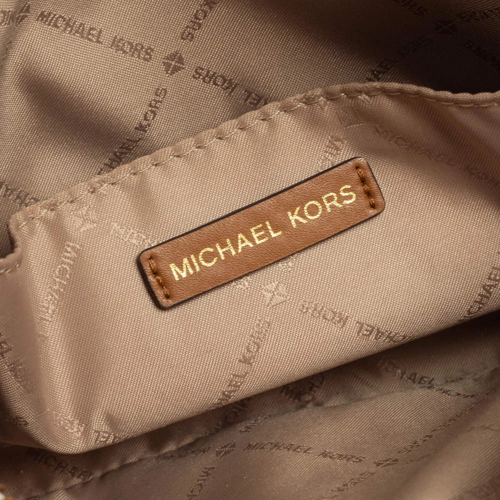 This Michael Kors Jet Set bag is a timeless piece that will last you season after season. This bag is made of signature canvas as well as leather. It has logo detailing, a long shoulder strap, a fabric-lined interior, and gold-tone hardware.
