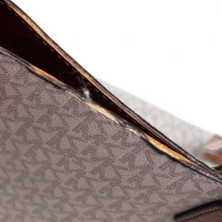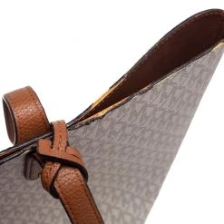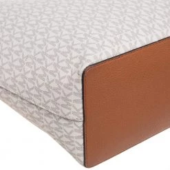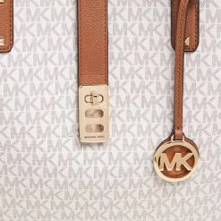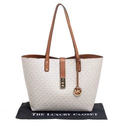 With a spacious leather-lined interior and dual handles, this Michael Kors tote is ideal for daily use. Covered in white signature canvas with leather trims on the exterior, it features a brand-detailed lock closure and an MK charm. The gold-tone accents add to the beauty of the bag.