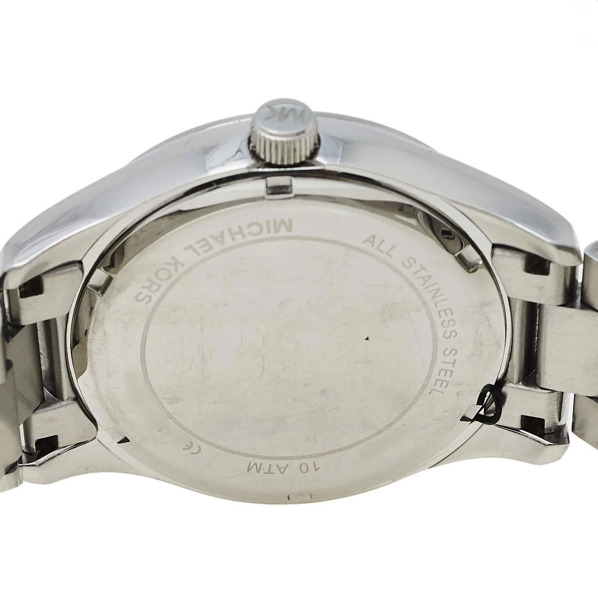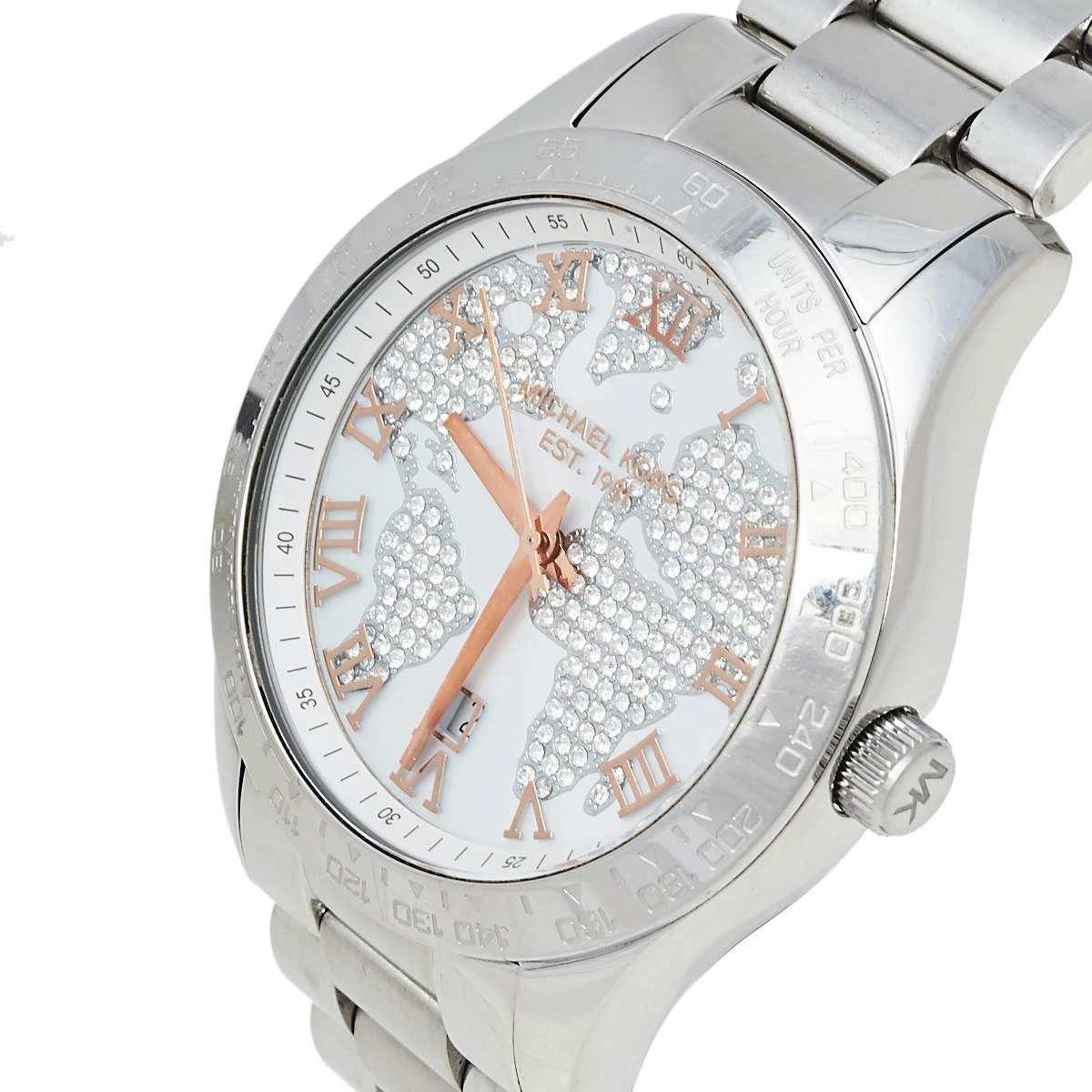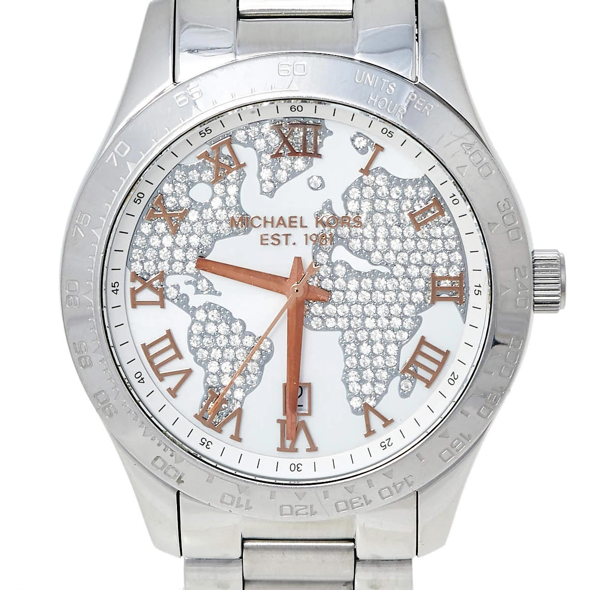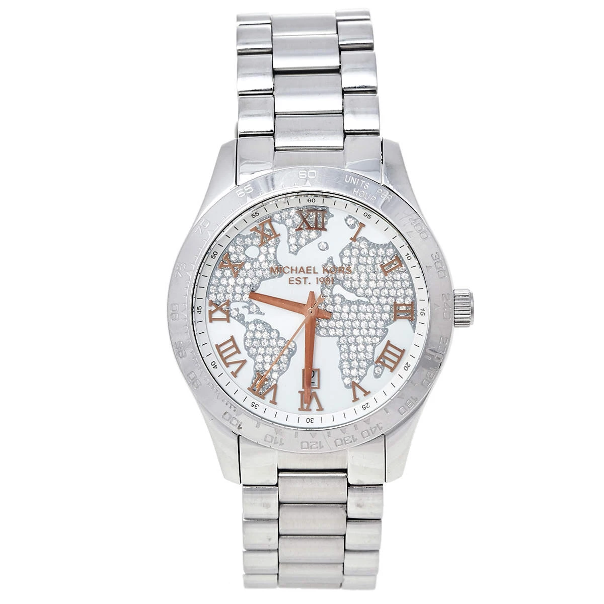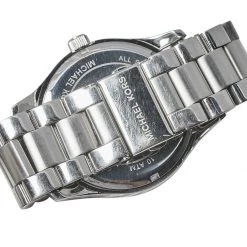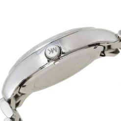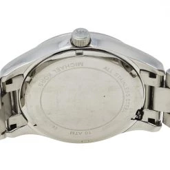 Designed with a fine blend of luxury and craftsmanship, this Layton watch from Michael Kors is sure to delight your style. Made from stainless steel, it has a white dial that is detailed with an embellished map, Roman numeral hour markers, three hands, a date window at the 6 o’clock position, and minute markers around the outer rim. The 100 meters water resistance and the bracelet’s push-button deployment clasp make this quartz timepiece ready to be yours.