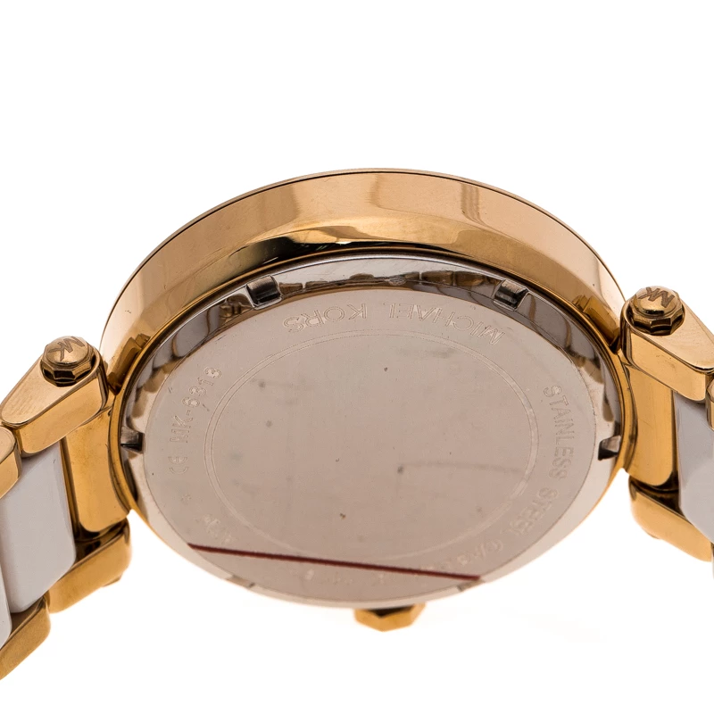 Set to shine on your wrist, this Michael Kors watch comes in a delighting gathering of the finest features. It has been wonderfully crafted from yellow gold-plated steel as well as acetate and designed with a bezel decorated with crystals. The scratch-resistant mineral glass protects a white dial that has a large gold-tone MK and three hands. Lastly, the creation is topped by a water resistance of 50 meters and held by a bracelet with a push-button release.