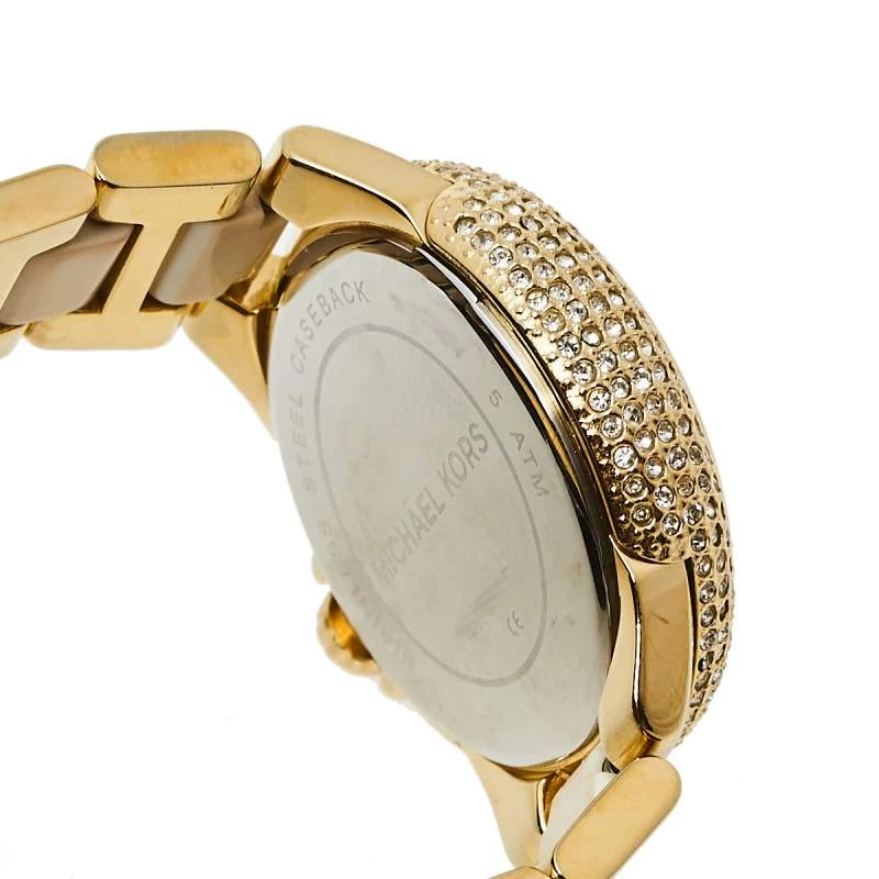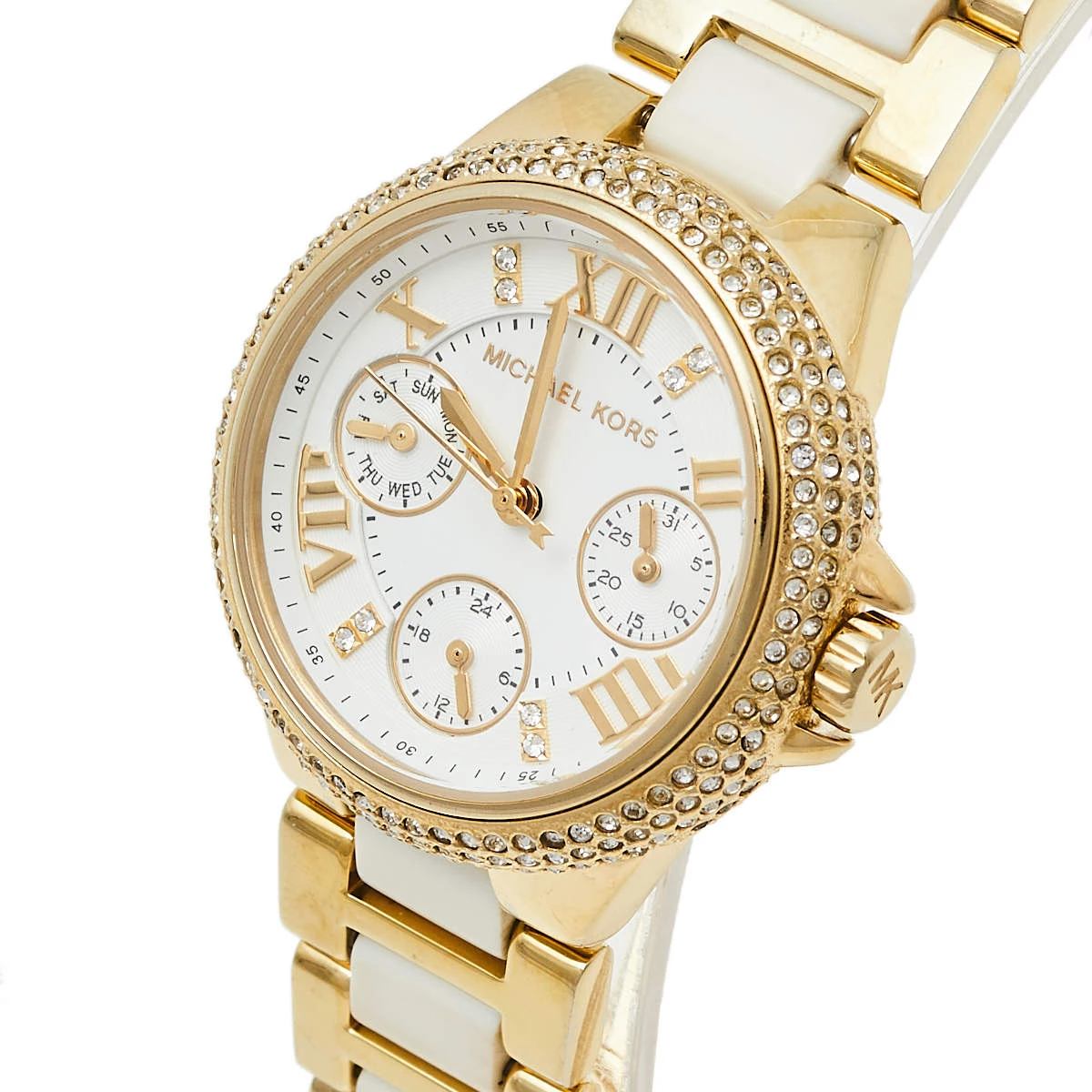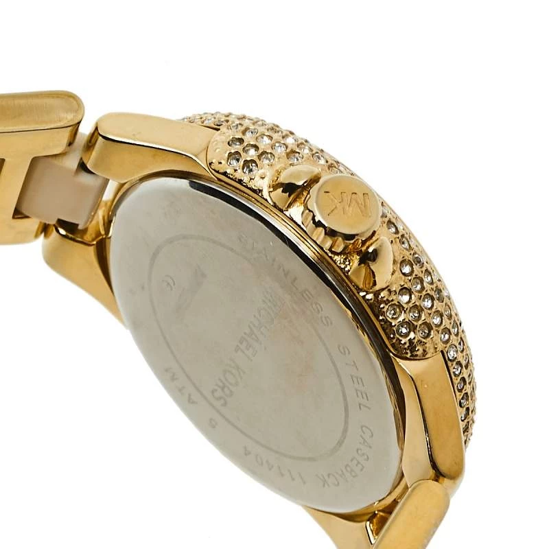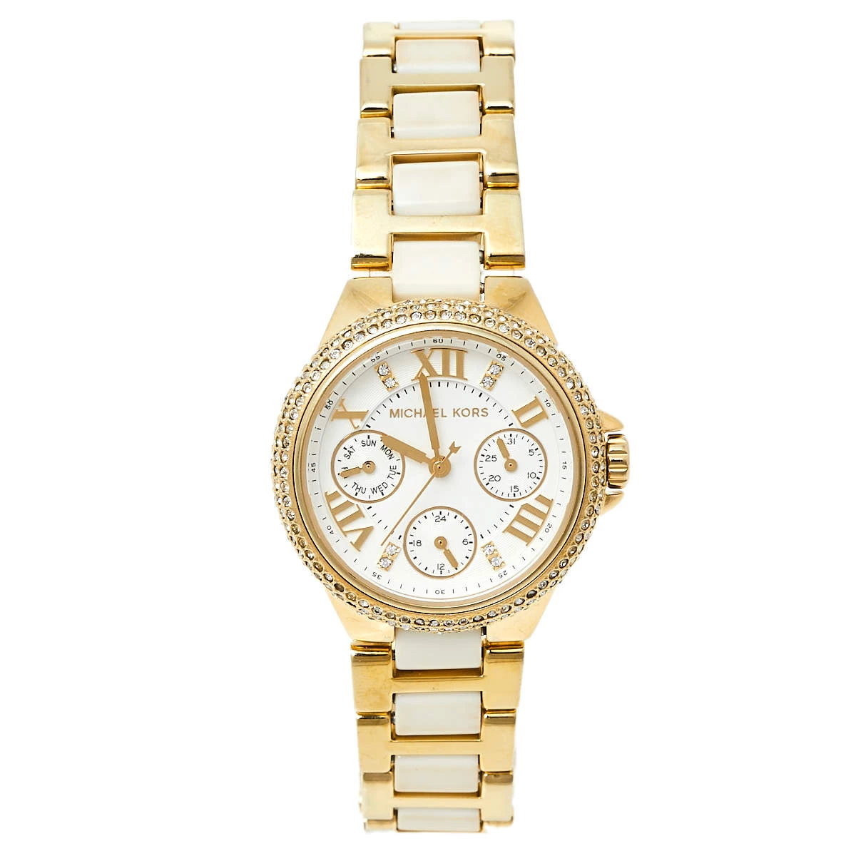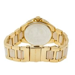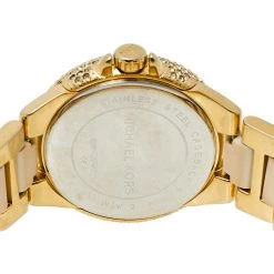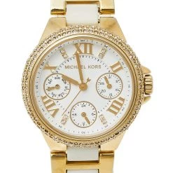 Designed with a fine blend of luxury and craftsmanship, this watch from Michael Kors is sure to delight your style. In a gold-tone stainless steel body, the watch has a white dial that houses Roman numeral markers, three hands, and three sub-dials. The watch is beautified with crystals and acrylic.