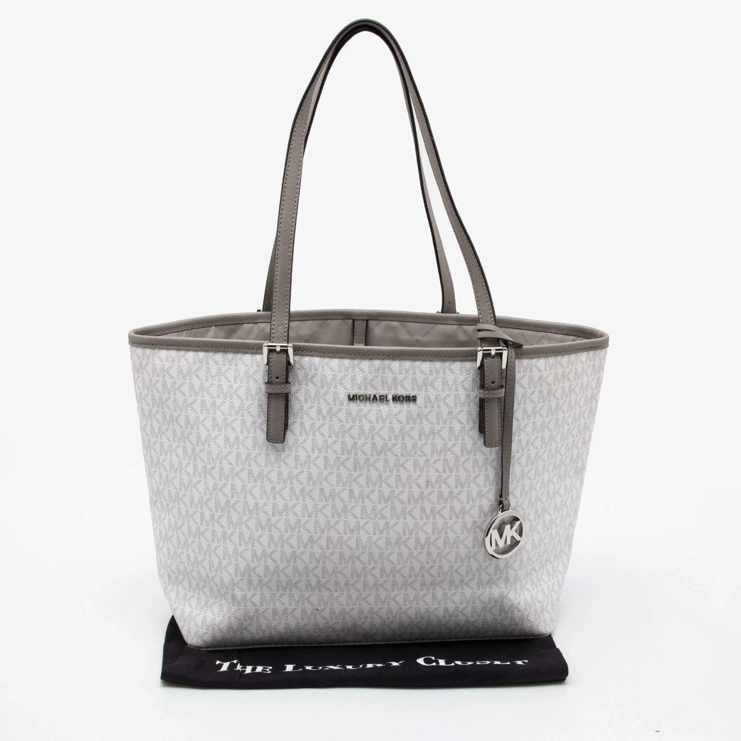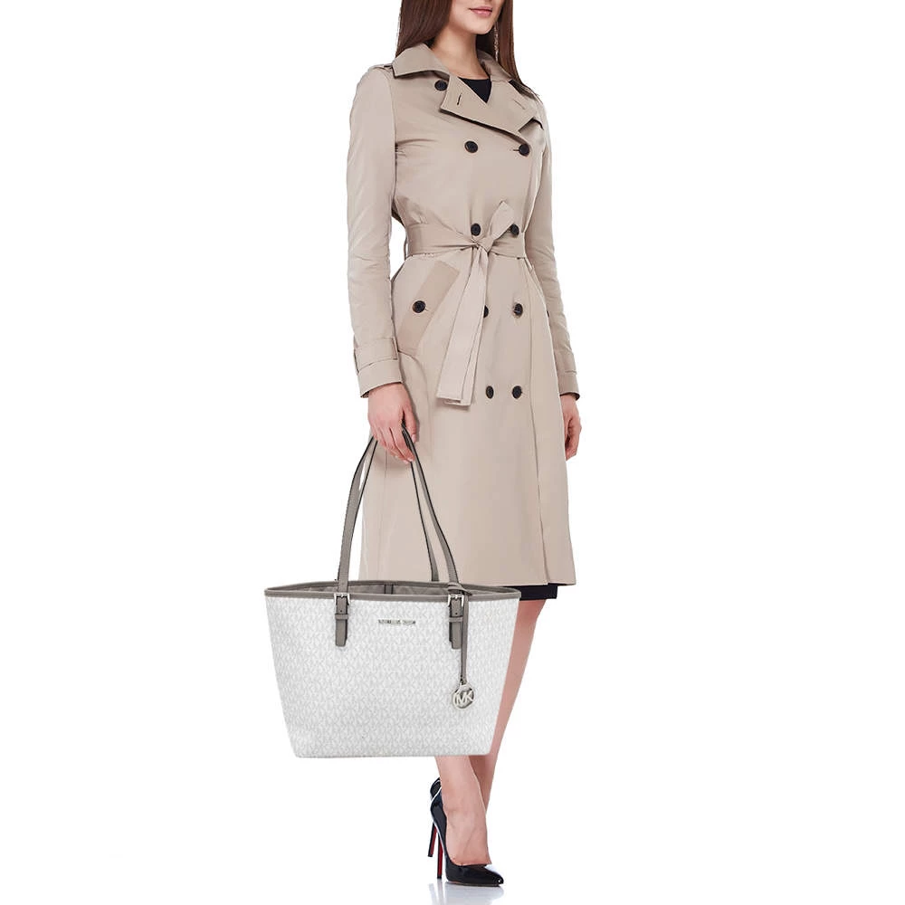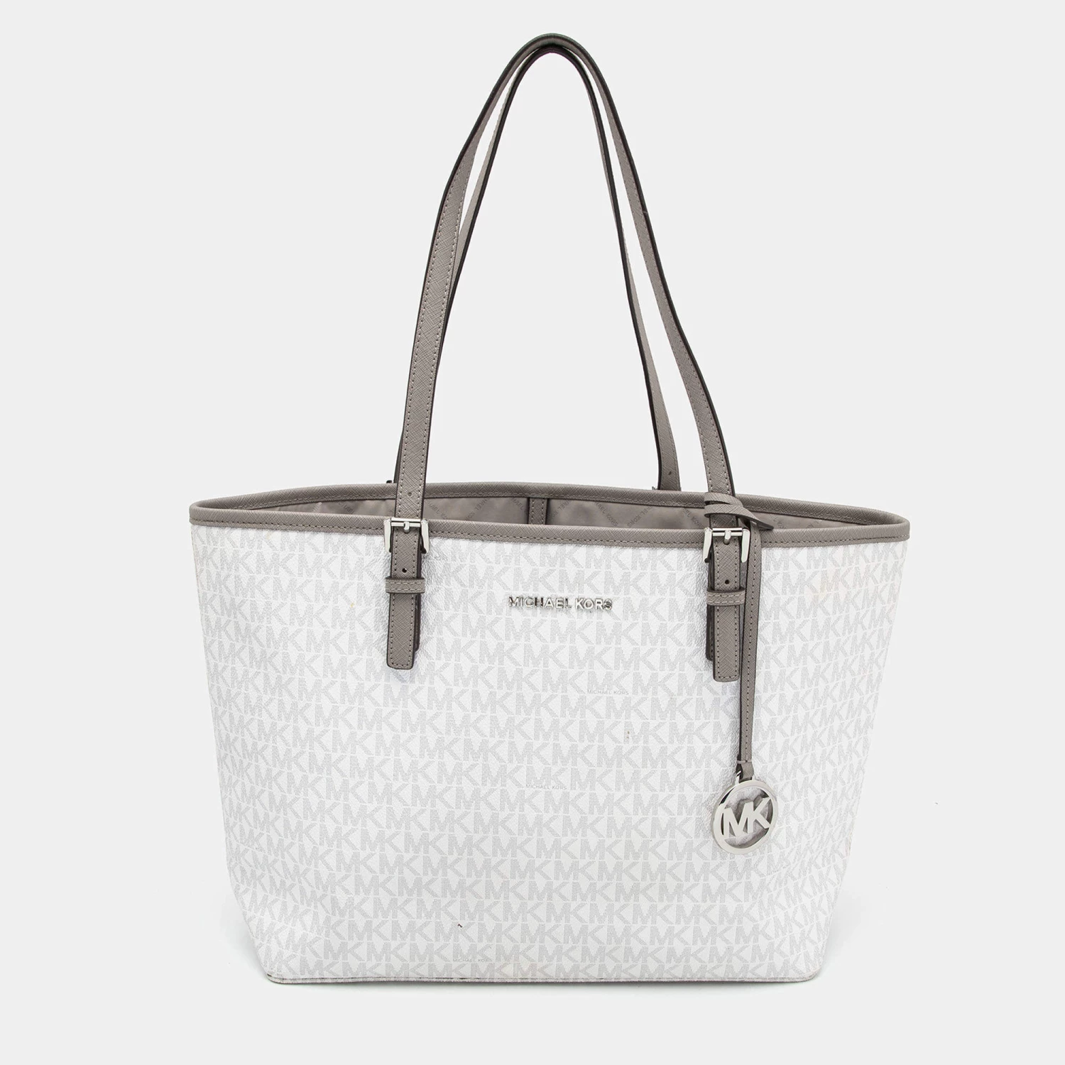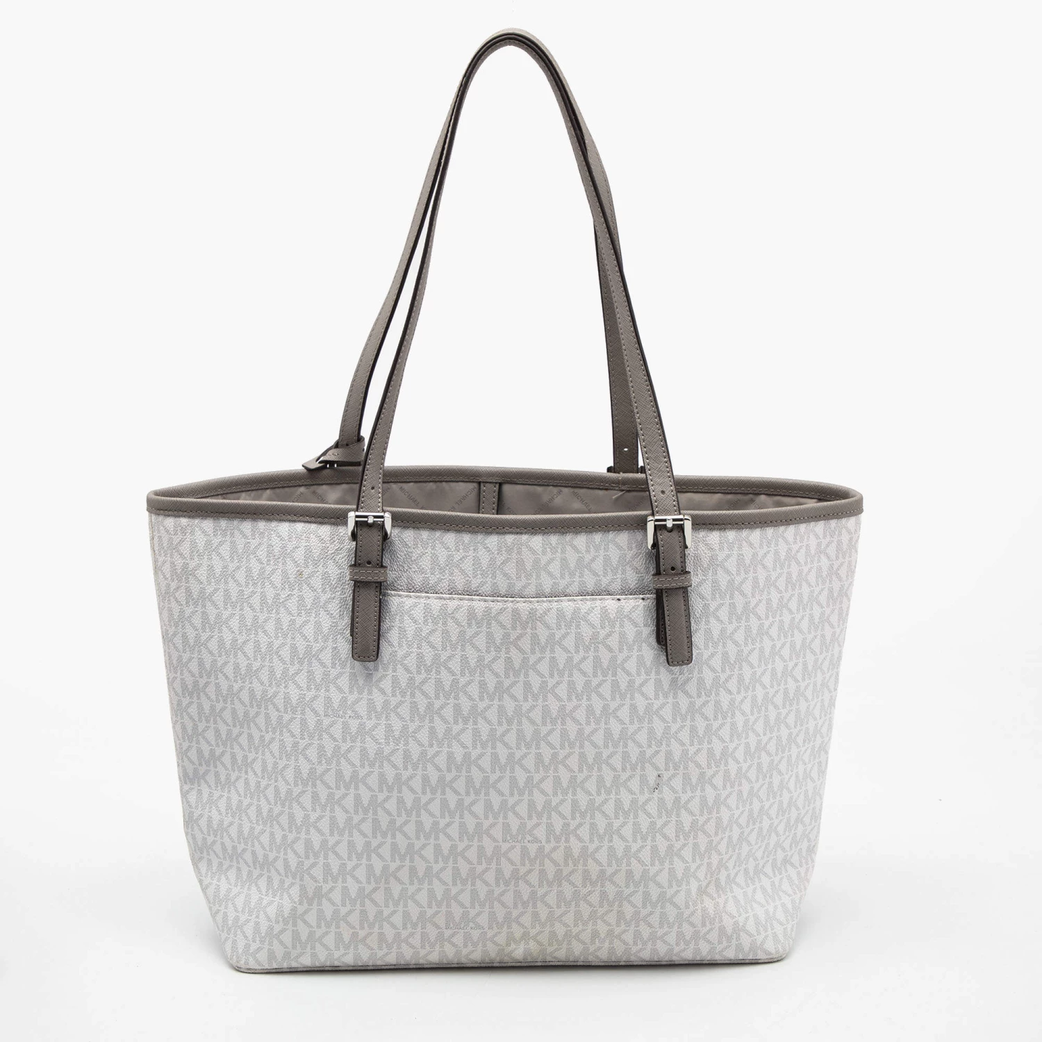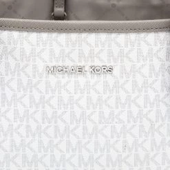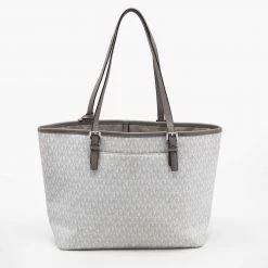 This Michael Kors Jet Set tote aims to provide you with practical ease. With a beautiful design and striking structure, this leather and signature coated canvas bag is filled with luxurious details. It exhibits dual handles for you to carry it in a chic way and a spacious nylon interior to hold all your essentials. The exterior slip pockets at the back enhance its functionality, and the brand signature on the front makes it easily recognizable.