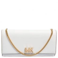 Carry this stunning Mott clutch from Michael Kors with you and fetch only praise! It is created using white leather with a gold-toned MK logo perched on the front. It is embellished with a sturdy chain strap and a fabric-lined interior.