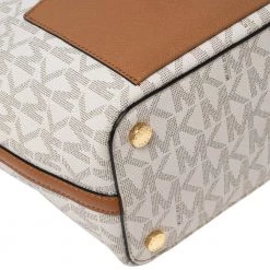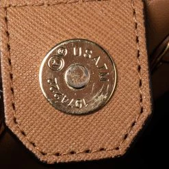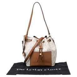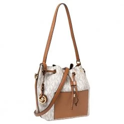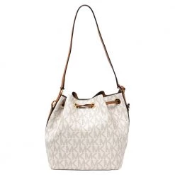 This lovely Michael Kors design has been crafted from coated canvas and is enhanced with leather. The bucket bag has a top handle, a shoulder strap, and a drawstring closure that opens to a capacious leather interior. It is complete with the famous gold-tone MK logo charm. The perfect day bag indeed!