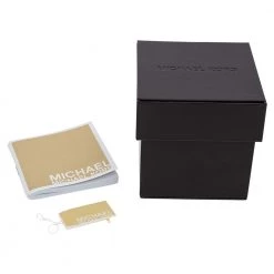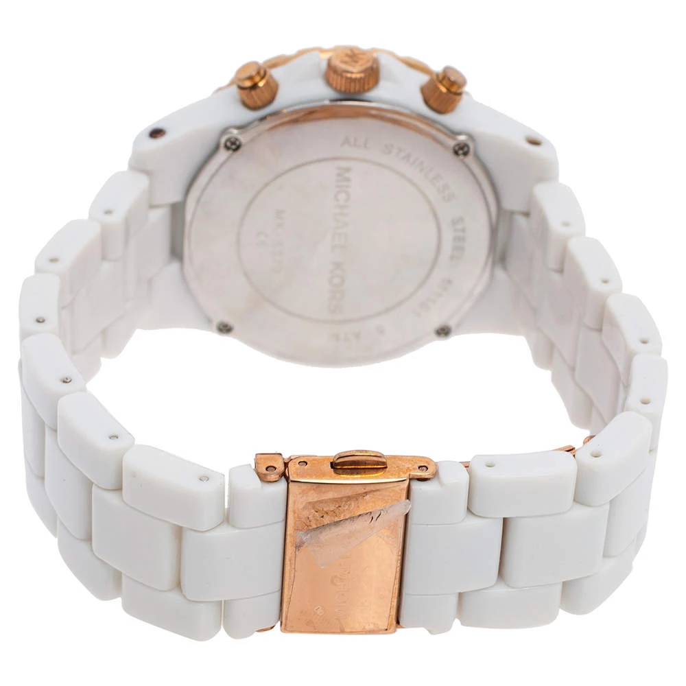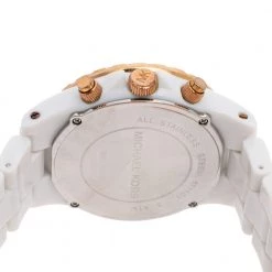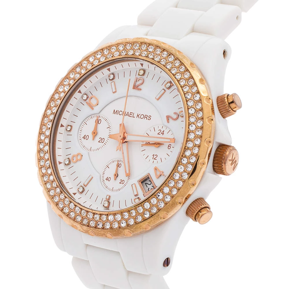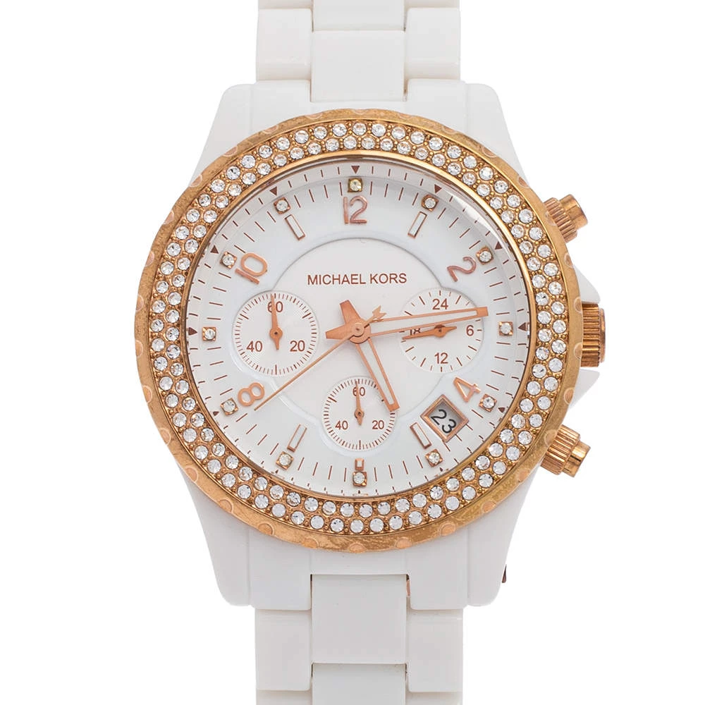 Designed with an embellished bezel, this Michael Kors Jet Set MK5379 wristwatch knows how to charm its way to your esteemed collection of elegant timepieces. The sophisticated rose gold-tone stainless steel and plastic case of this quartz watch is detailed with a white dial that flaunts crystal-studded hour markers, three hands, a date window, and three subdials for the chronograph function. The link bracelet is secured using a push-button deployment clasp and the watch is equipped with a water resistance of 50 meters.