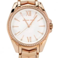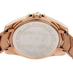 Built to assist you every day, this Michael Kors wristwatch comes made from gold-plated stainless steel. The quartz watch features elegant details on the bezel and on the white dial. It is water-resistant up to 50 meters and is secured by a push-button clasp.