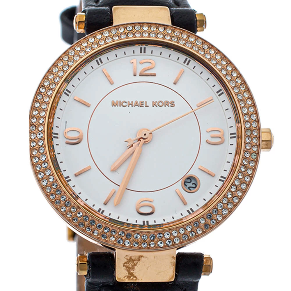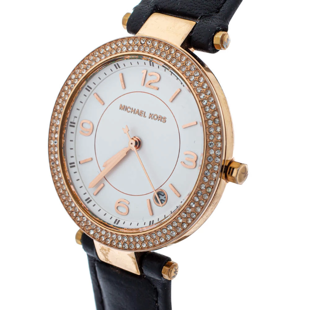 Set to shine on your wrist, this Michael Kors watch comes in a delighting gathering of the finest features. It has been wonderfully crafted from rose gold-tone stainless steel and designed with a bezel decorated with crystals. The scratch-resistant mineral glass protects a white dial that has gold-tone markers and a date window. Lastly, the creation is held by a bracelet with a buckle clasp.