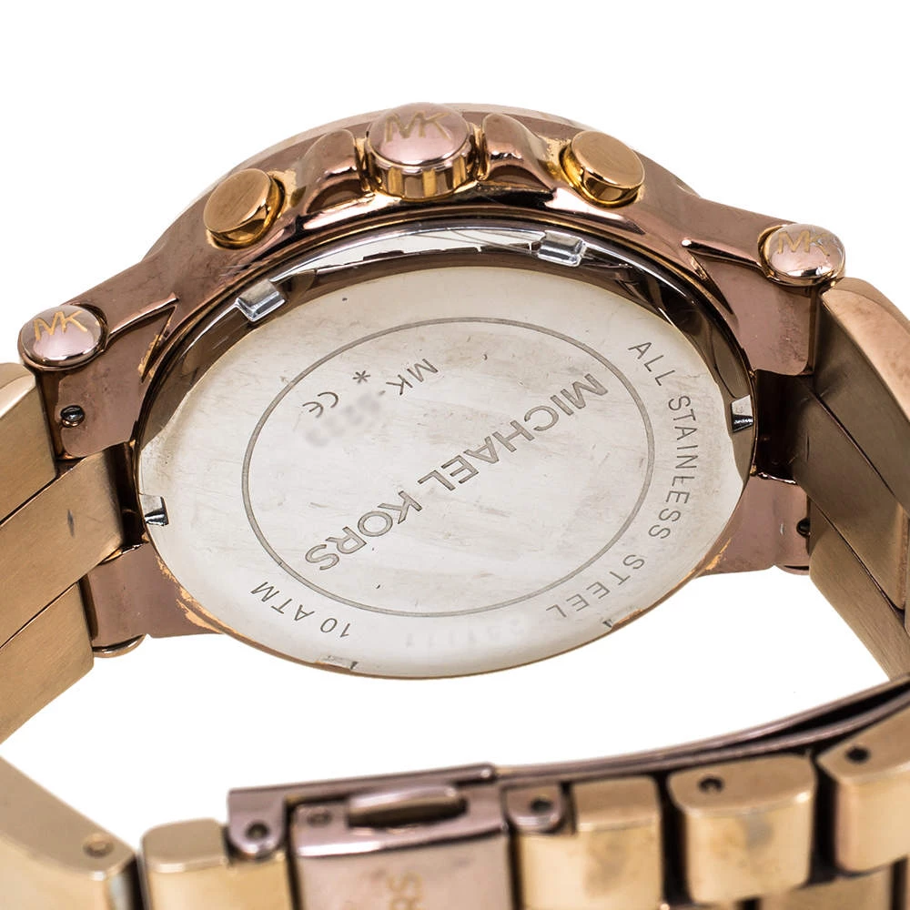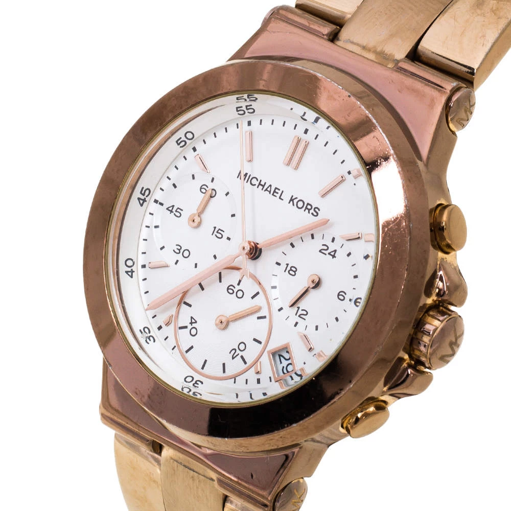 Created for watch lovers who go that extra mile in searching for stylish watches, this Michael Kors Runway MK5223 watch is a worthy buy.! The rose gold plated stainless steel case has a diameter of 38 mm and the white dial is protected by scratch-resistant mineral crystal. It exhibits index hour markers, minute markers around the outer rim, three subdials for the chronograph function, and a date window between the 4 and 5 o’clock positions. Equipped with a water resistance of 100 meters, the watch comes with a rose gold plated stainless steel bracelet that fastens with a fold-over push-button clasp.