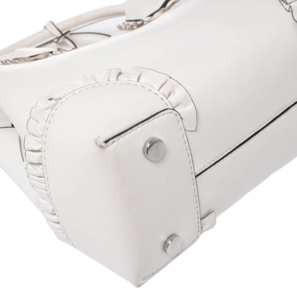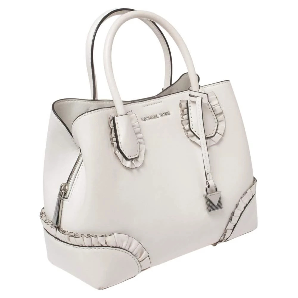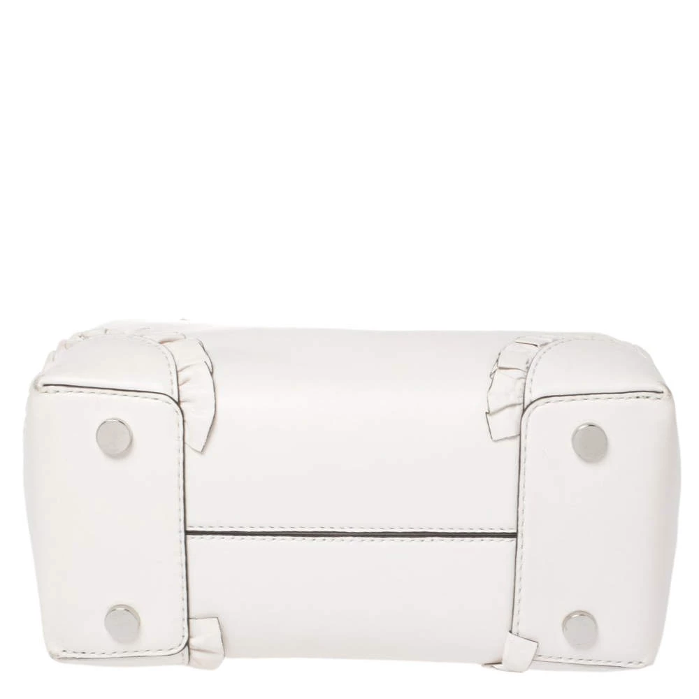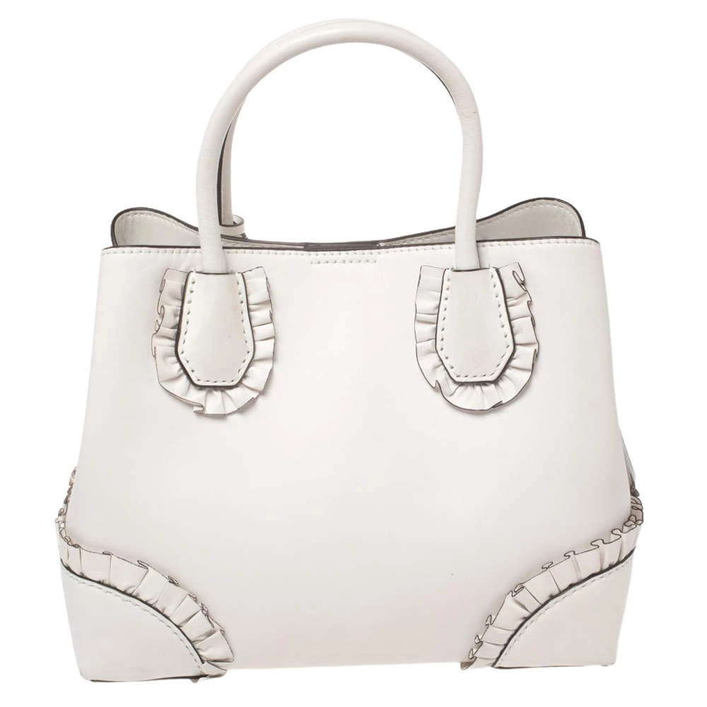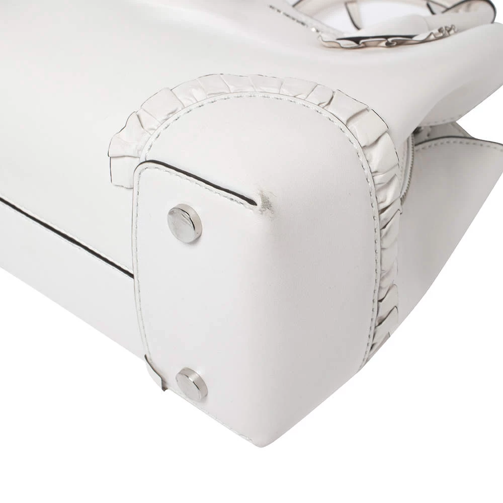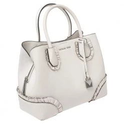 Featuring a chic and fabulous style, this Michael Kors tote is modern. Crafted from leather in stunning white, the tote features dual handles, ruffle trims, and a padlock. It opens to a spacious leather and nylon interior divided by a zipped compartment. The tote comes with protective metal feet and you are sure to love swinging this beauty.