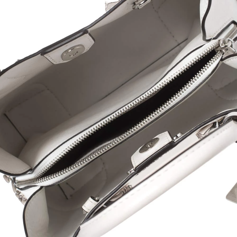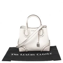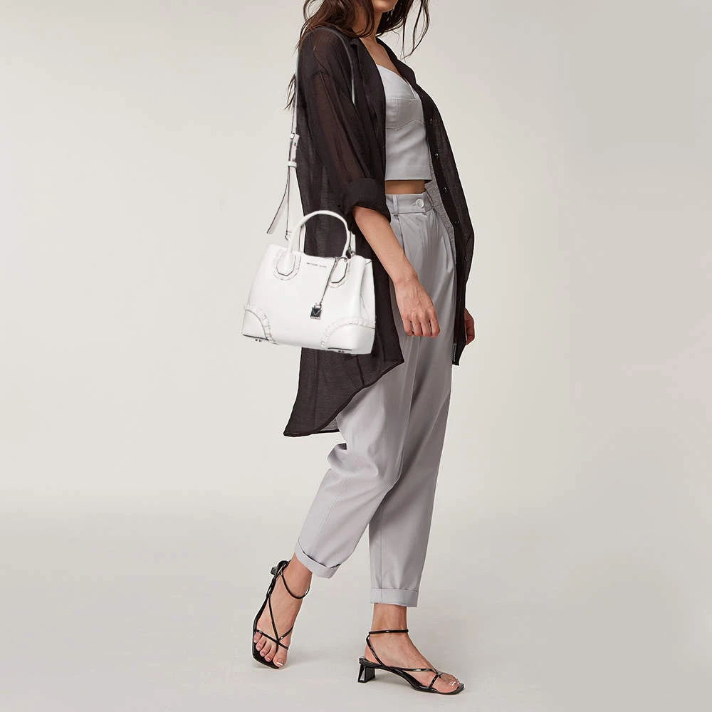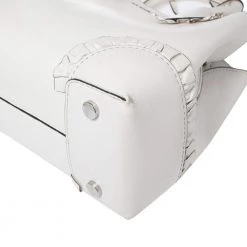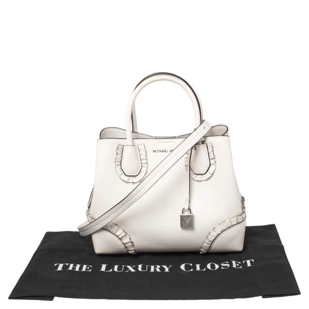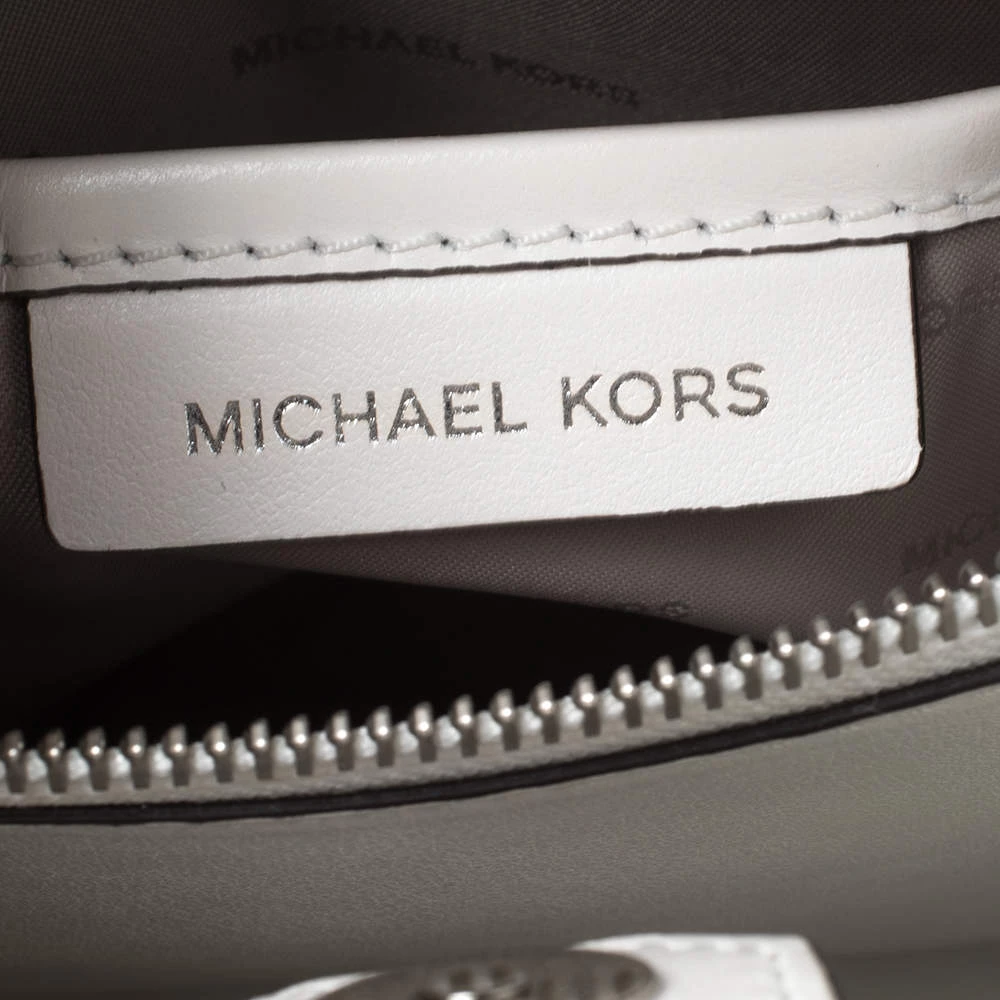 Featuring a chic and fabulous style, this Michael Kors tote is modern. Crafted from leather in stunning white, the tote features dual handles, ruffle trims, and a padlock. It opens to a spacious leather and nylon interior divided by a zipped compartment. The tote comes with protective metal feet and you are sure to love swinging this beauty.