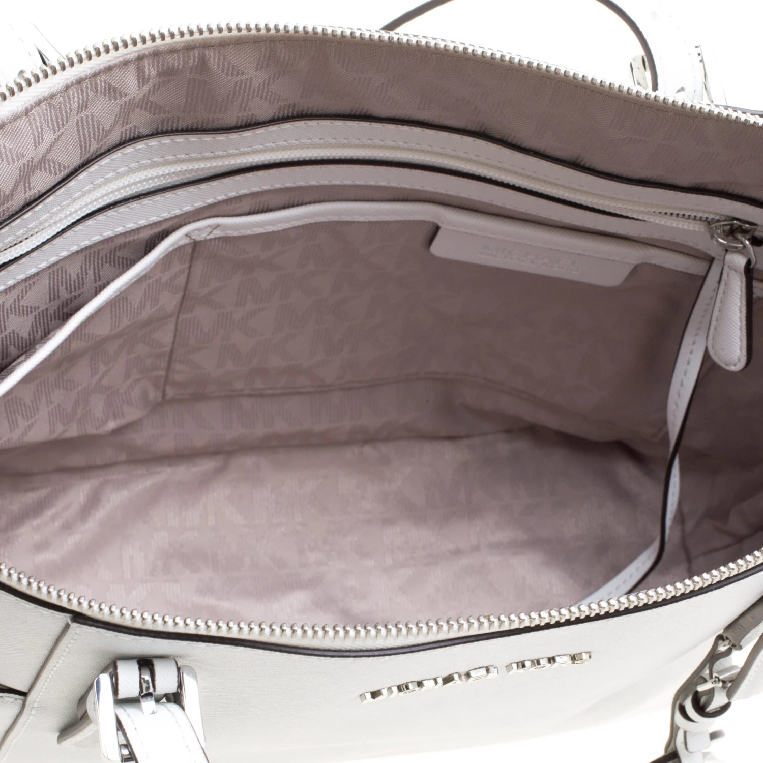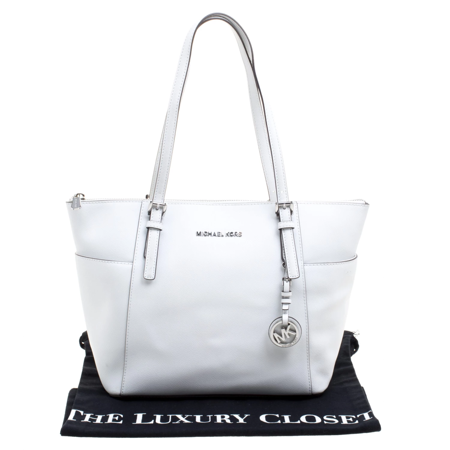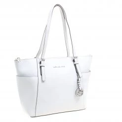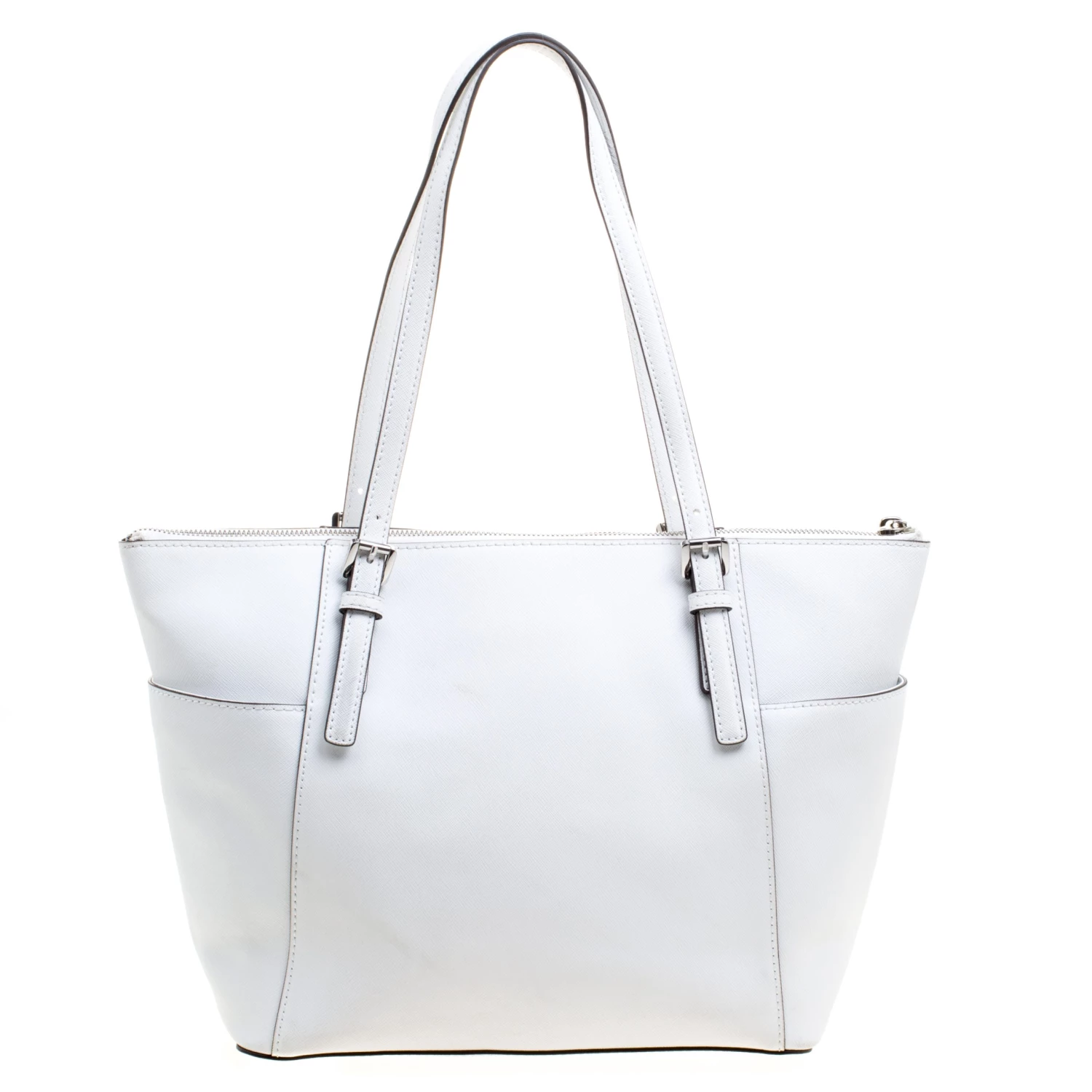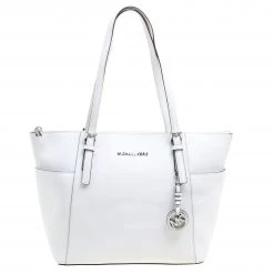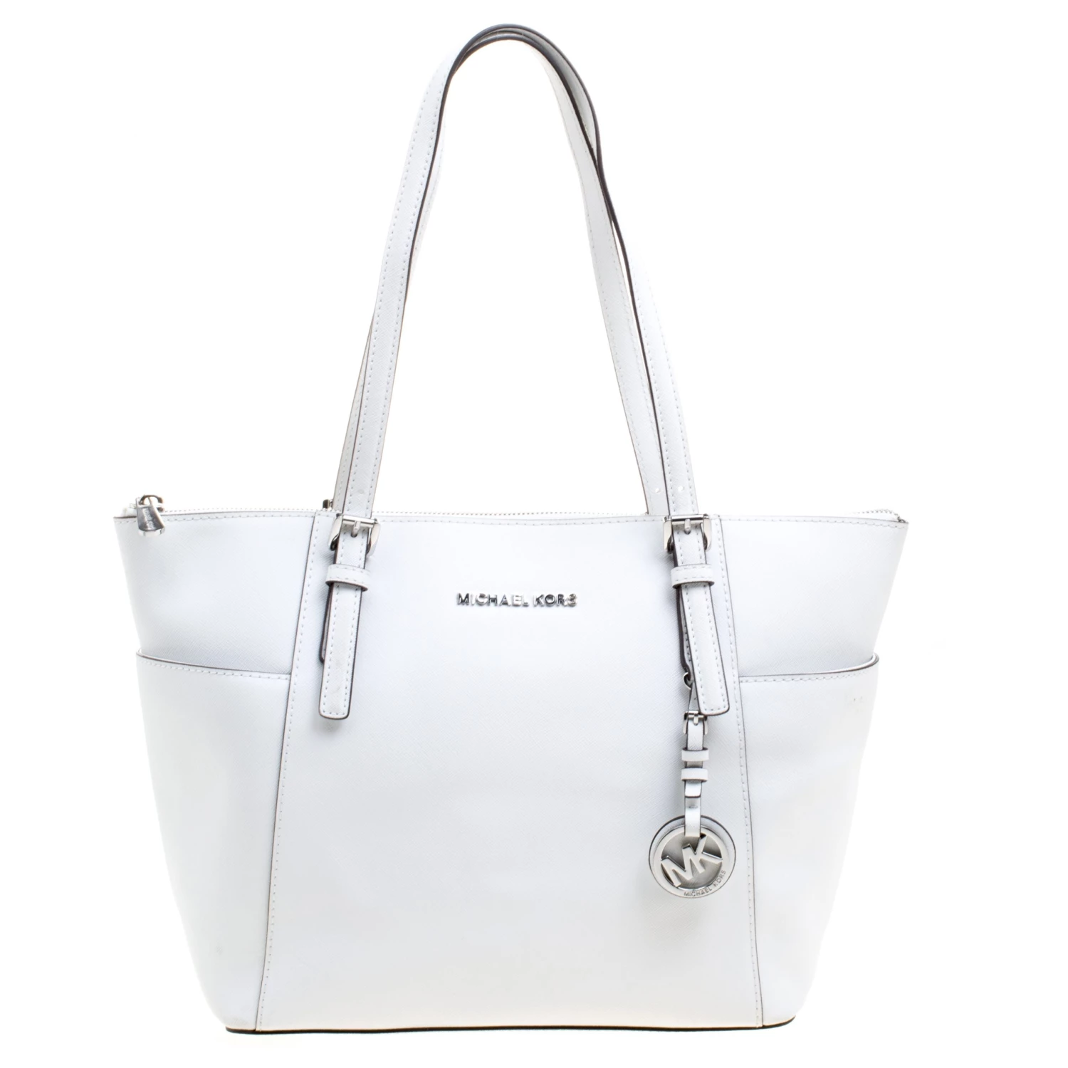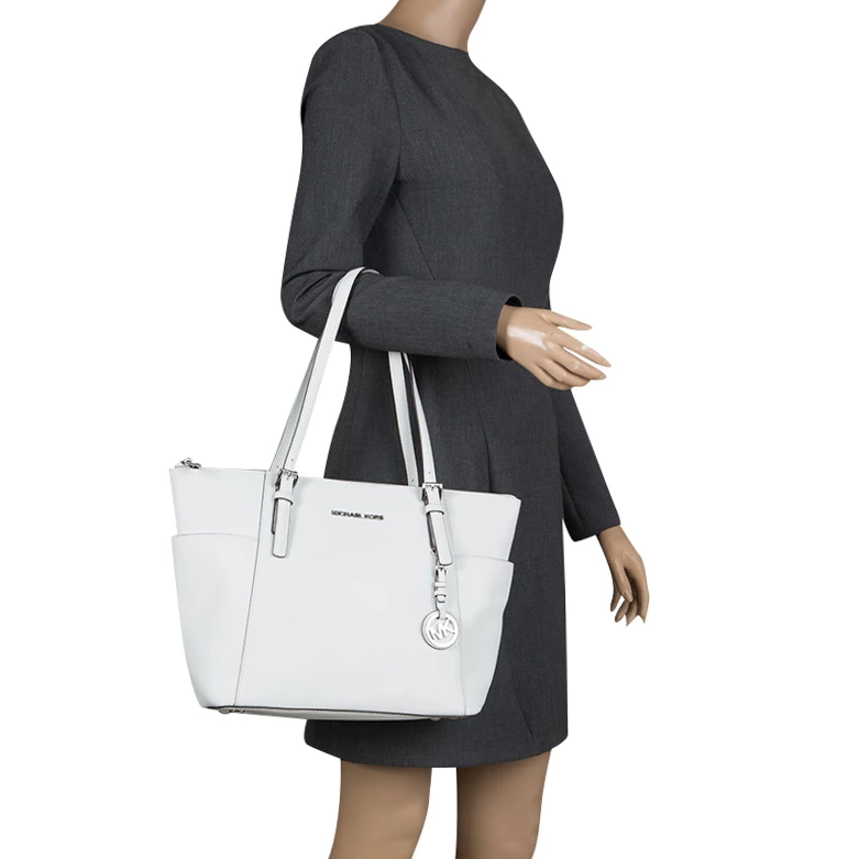 Elevate your style with this gorgeous Top Zip Jet Set tote from Michael Kors. Crafted from white saffiano leather, the bag features dual top handles, a Michael Kors charm and a slip pocket on each side. The top zip closure opens to a spacious fabric lined interior that will hold all your belongings. This beauty is totally worth the splurge!