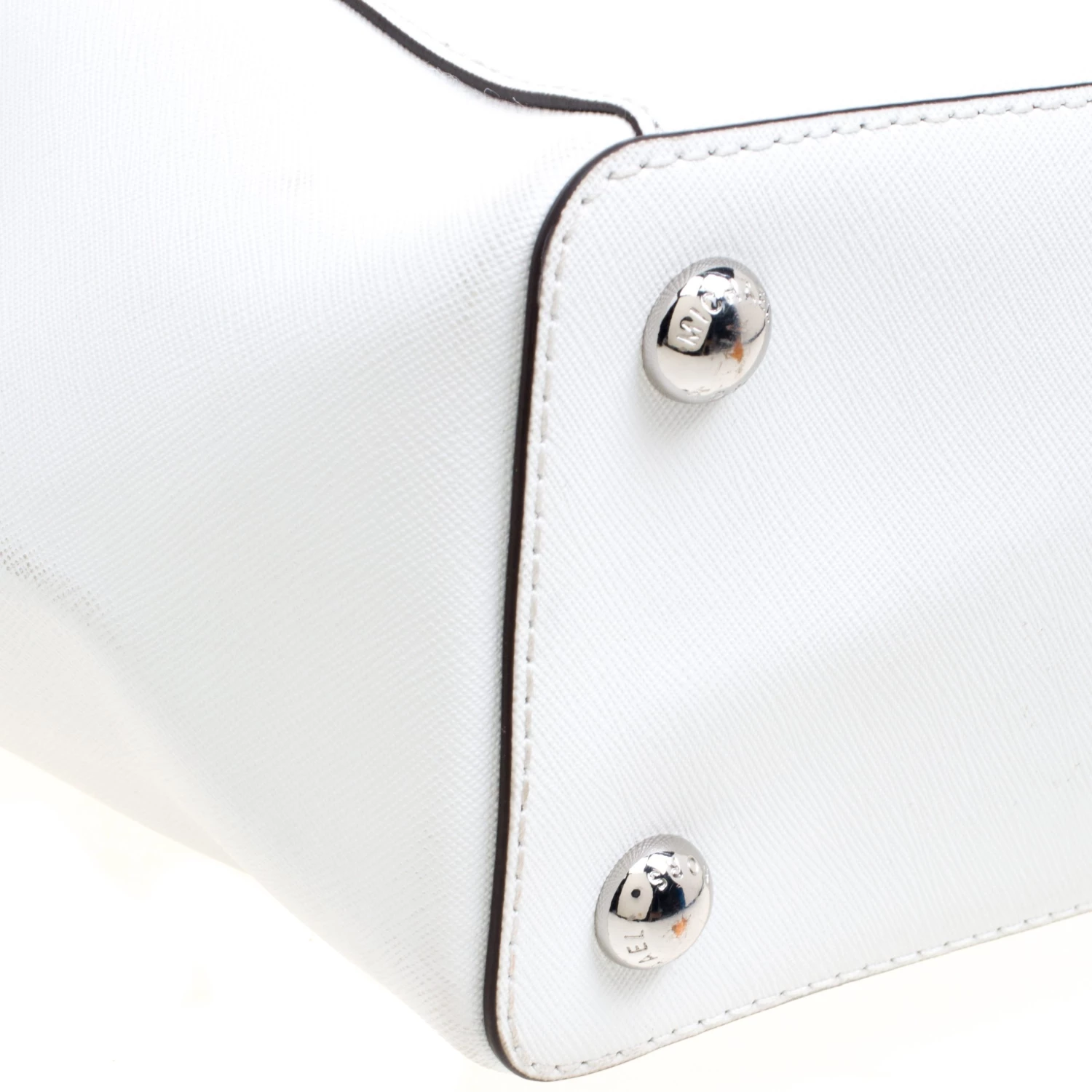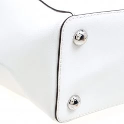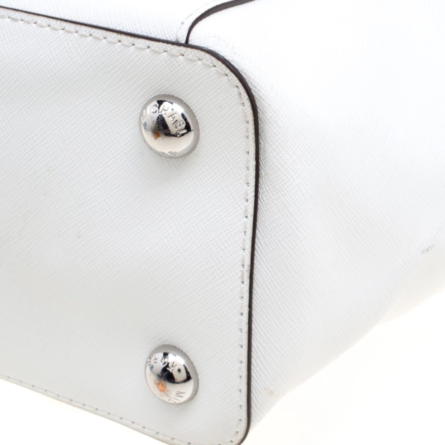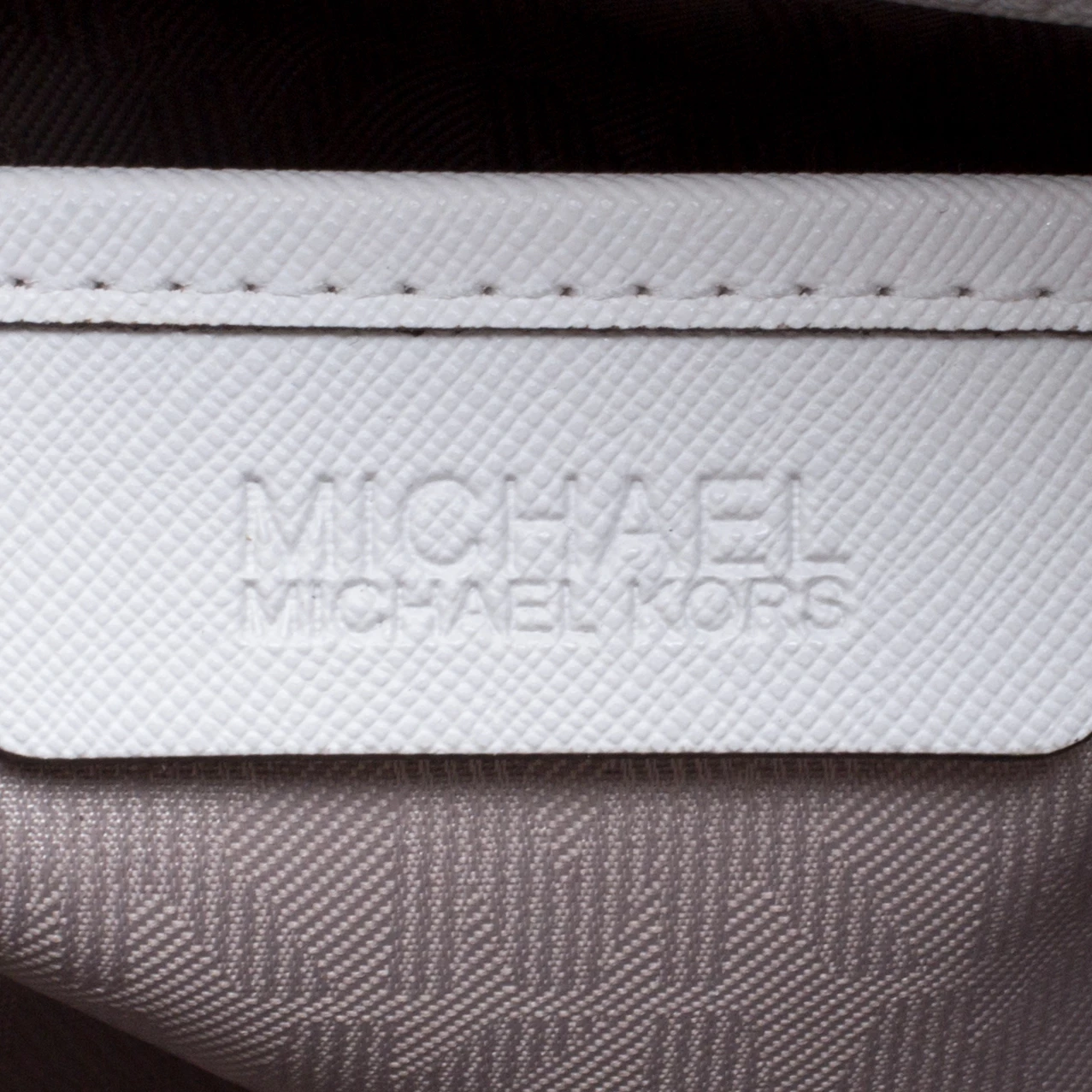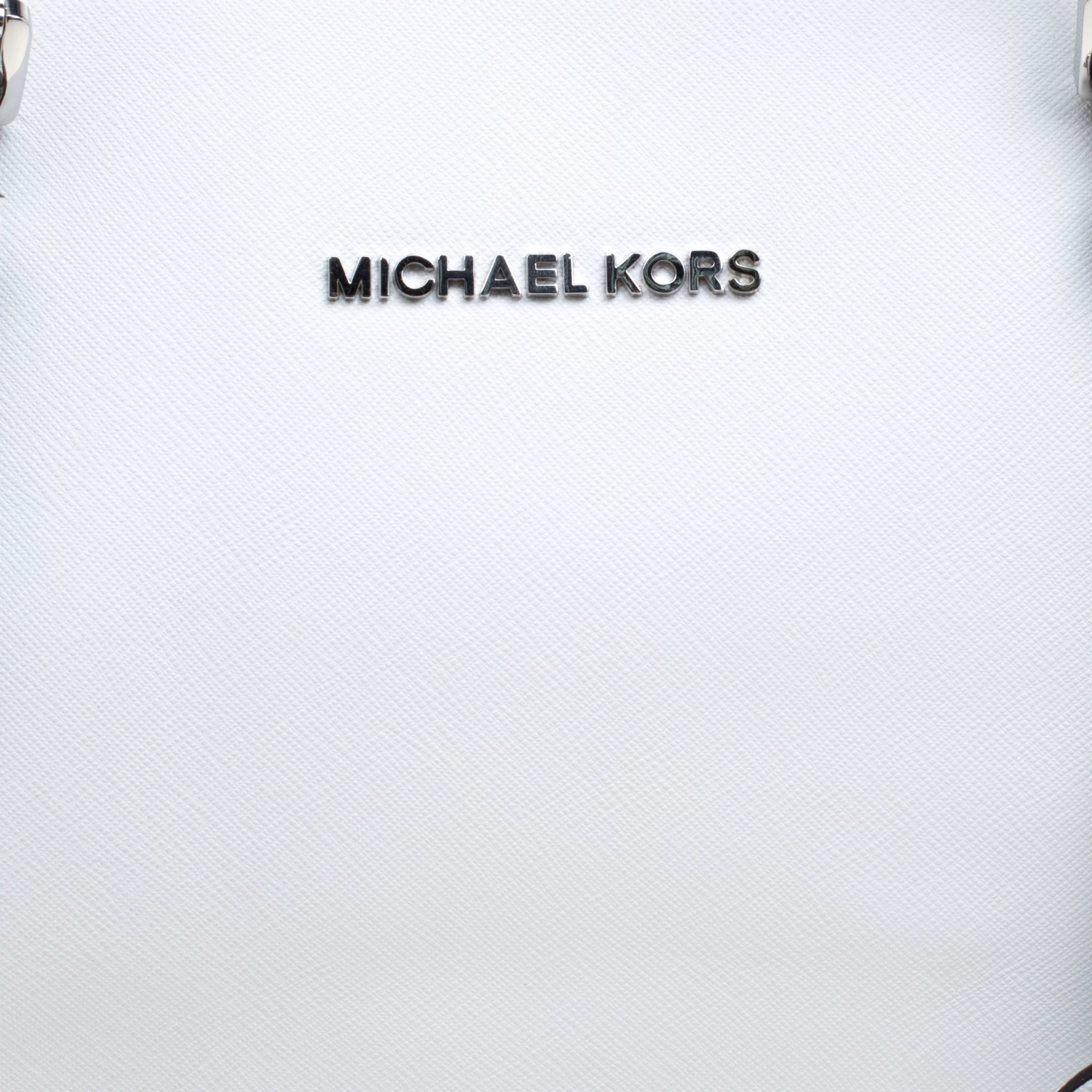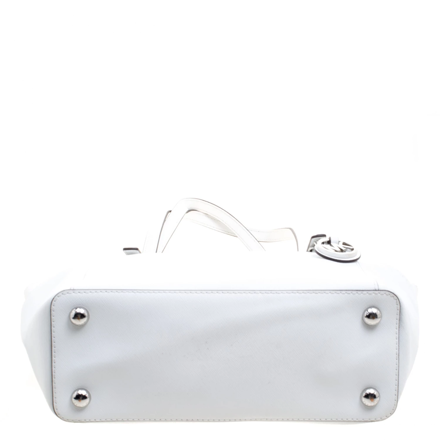 Elevate your style with this gorgeous Top Zip Jet Set tote from Michael Kors. Crafted from white saffiano leather, the bag features dual top handles, a Michael Kors charm and a slip pocket on each side. The top zip closure opens to a spacious fabric lined interior that will hold all your belongings. This beauty is totally worth the splurge!