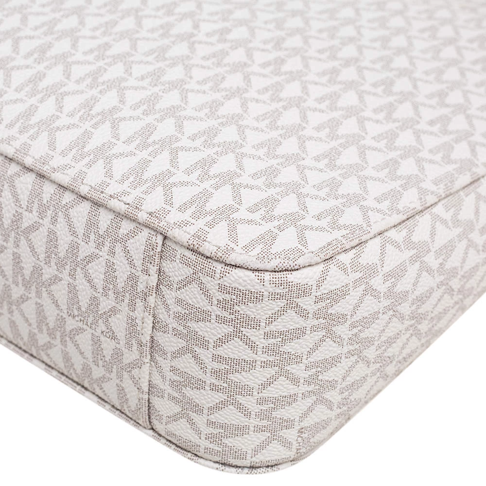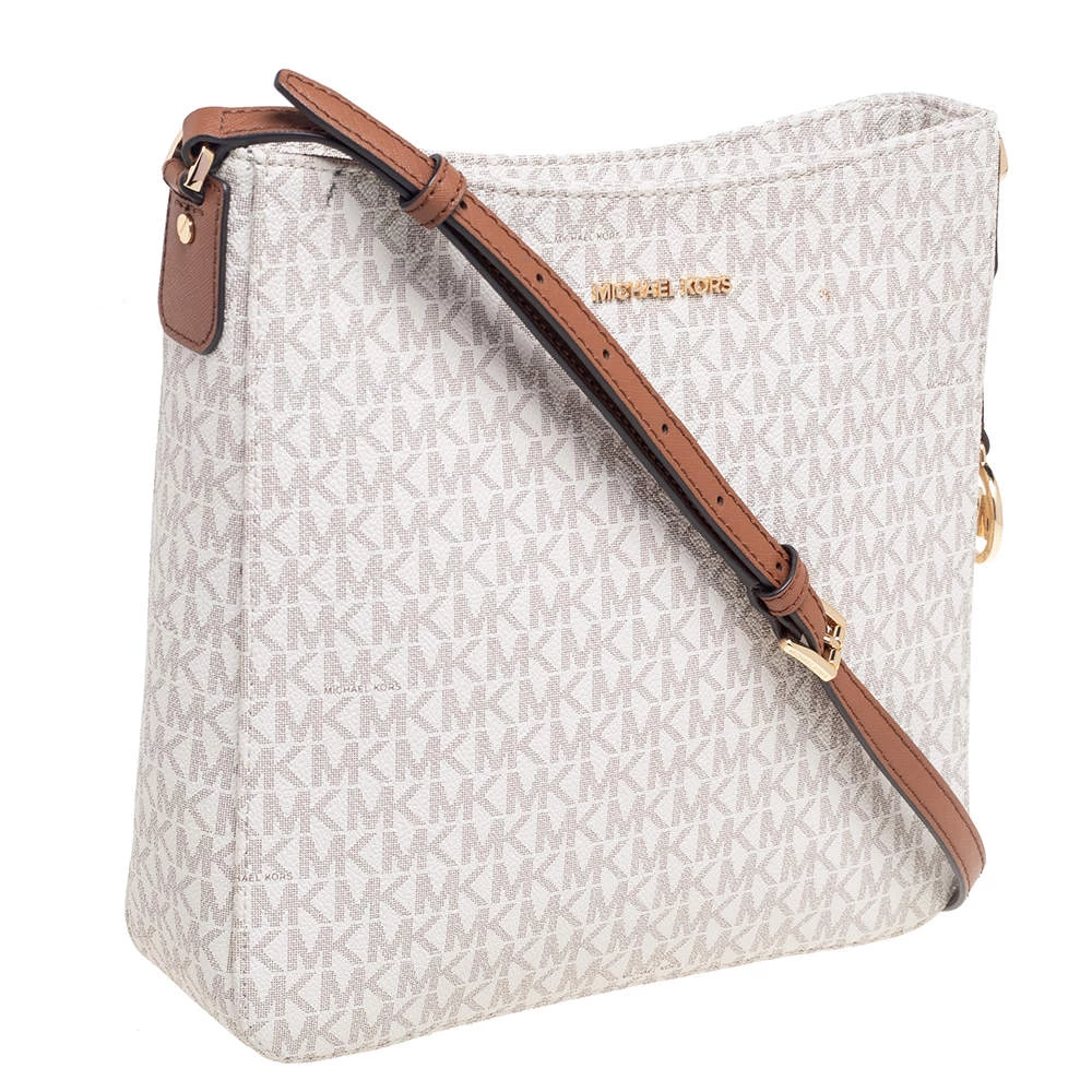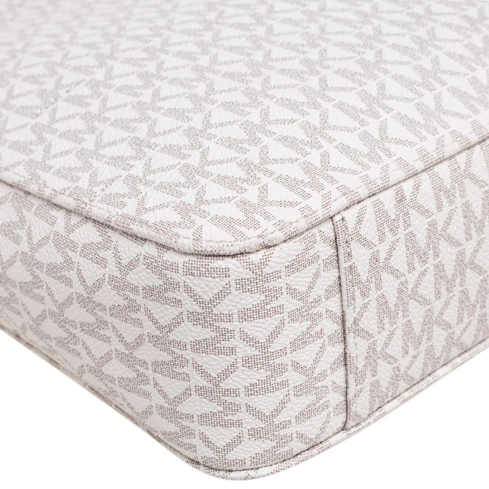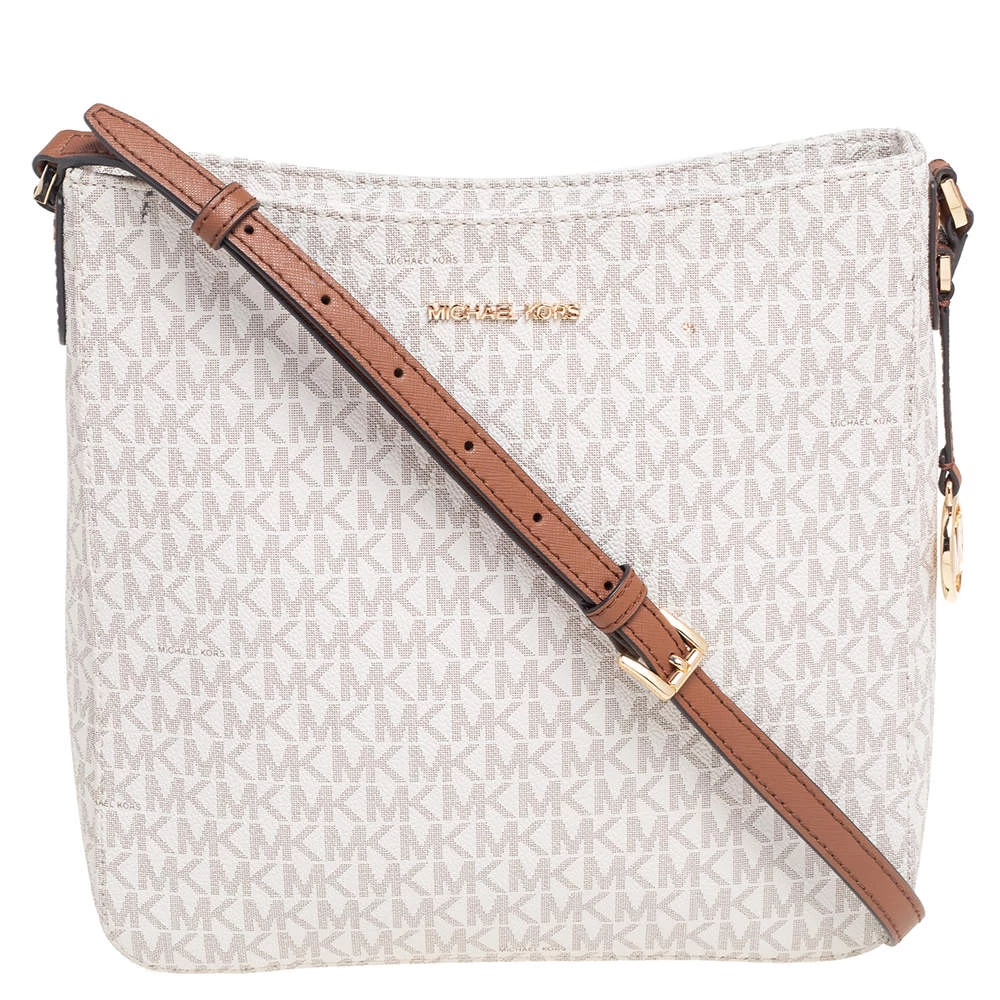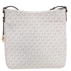 This Michael Kors messenger bag is a smart creation. From its design to its structure, this white signature-coated canvas Jet Set bag exudes charm and an ergonomic style. It flaunts a shoulder strap and a spacious interior to hold all your essentials.