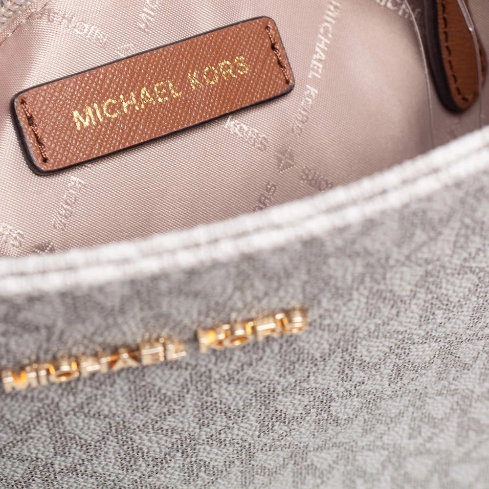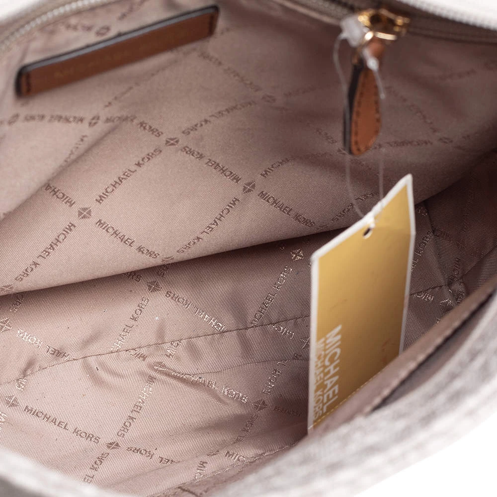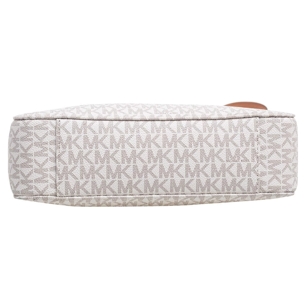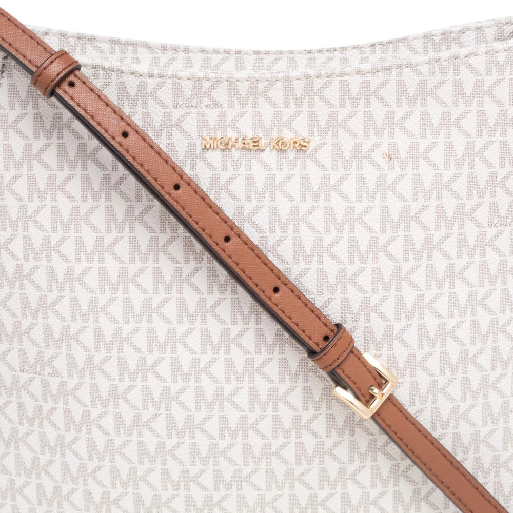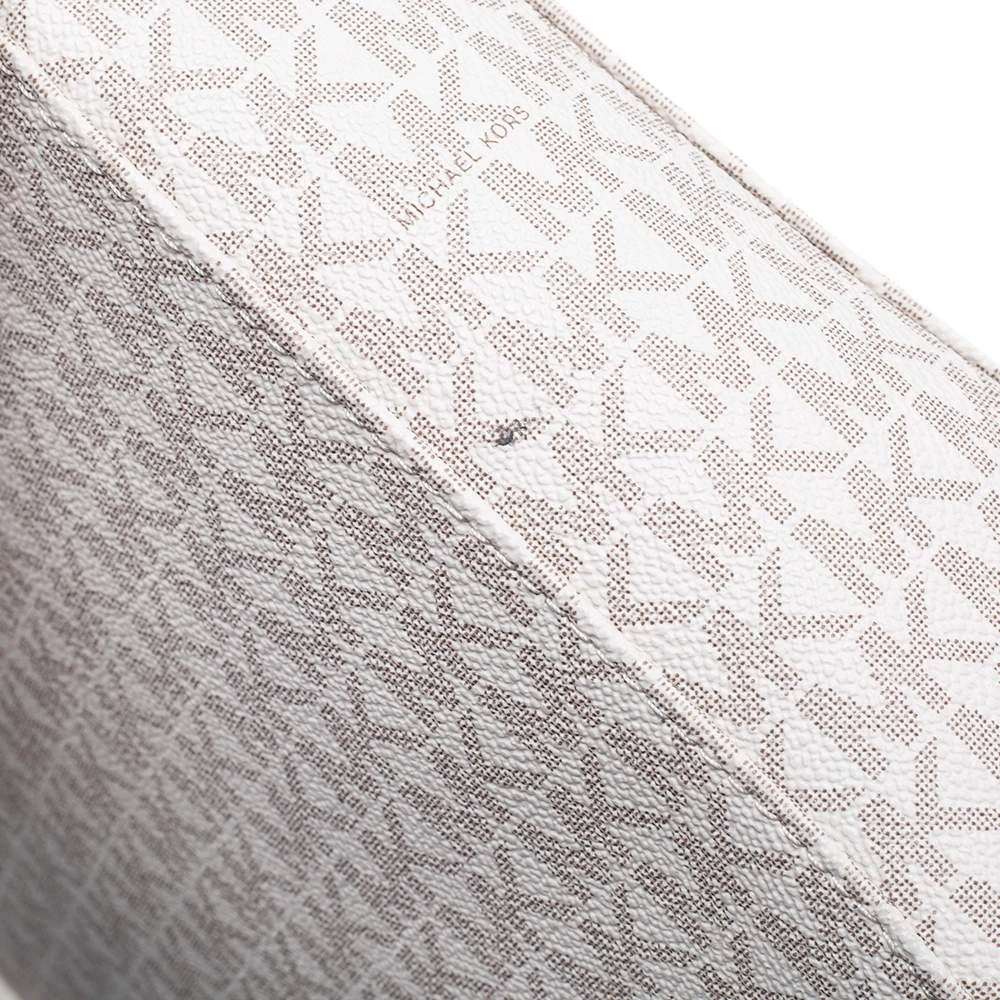 This Michael Kors messenger bag is a smart creation. From its design to its structure, this white signature-coated canvas Jet Set bag exudes charm and an ergonomic style. It flaunts a shoulder strap and a spacious interior to hold all your essentials.