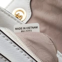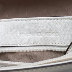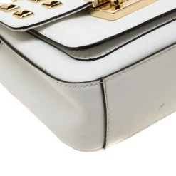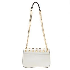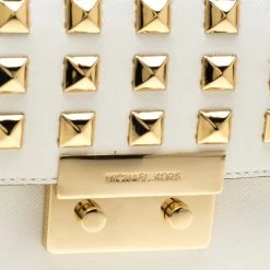 Fall in love with this Sloan bag from Michael Kors. Crafted from white leather the bag is enhanced with gold-tone studs. It has a spacious fabric-lined interior that has two zip pockets. This beauty is complete with dual chain link handles.