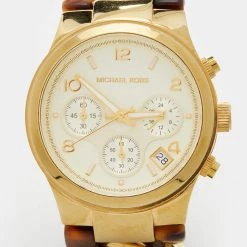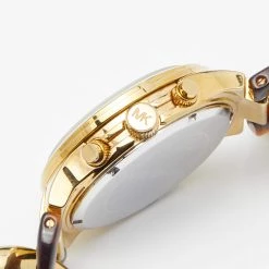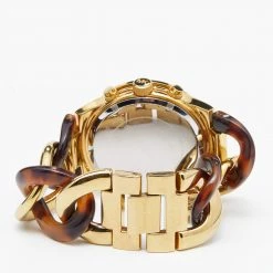 Designed with a fine blend of luxury and craftsmanship, this watch from Michael Kors is sure to delight your style. In a gold-plated stainless steel case, the yellow dial comes with index and Arabic numeric hour markers, a date window, three hands, and minute markers around the outer rim. The watch is water-resistant up to 50 meters, and it is held by a lovely bracelet featuring a twisted design of gold-plated stainless steel and acrylic.
