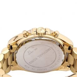 Set to shine on your wrist, this Michael Kors watch comes in a delighting gathering of the finest features. It has been wonderfully crafted from yellow gold-plated stainless steel and designed with a smooth bezel. The glass protects the matching dial that has Roman numeral and index hour markers, three subdials, and a date window. Lastly, the creation is armed with a water resistance of 100 meters and secured by a fold-over clasp.