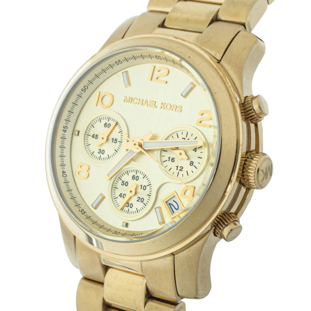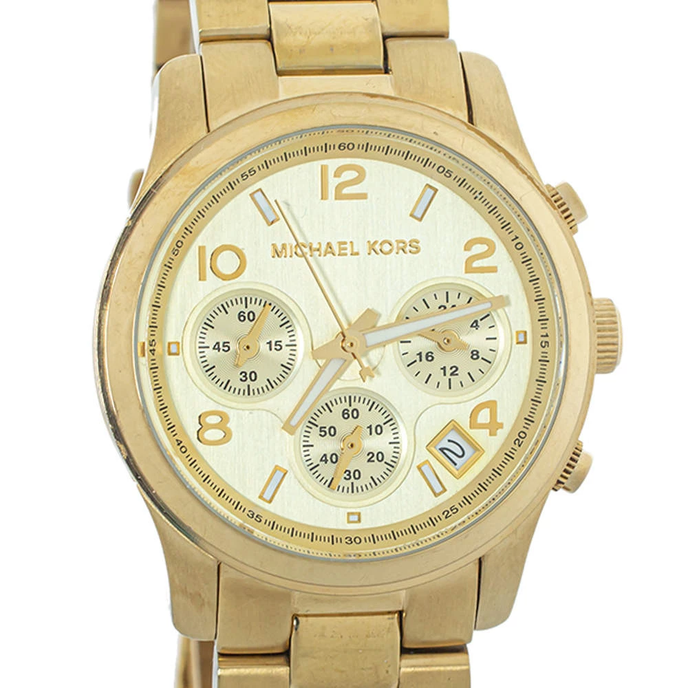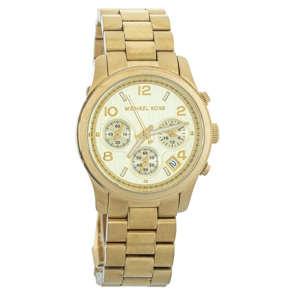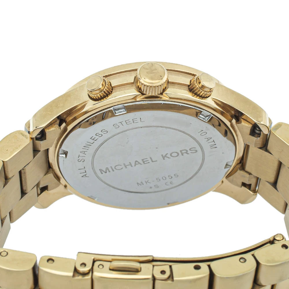 Elegant design and subtle aesthetics define this exquisite watch from the house of Michael Kors. It has been crafted from gold plated stainless steel and detailed with a yellow dial with Arabic numeral hour markers and three sub-dials. The watch is water-resistant up to 100 meters and is equipped with a date window and a clasp with a push-button. The efficient timepiece has been assembled with precision and expertise so that the end result is one you will love to flaunt.