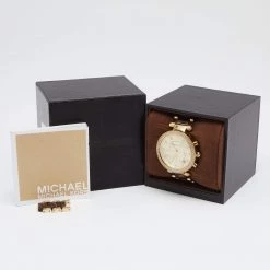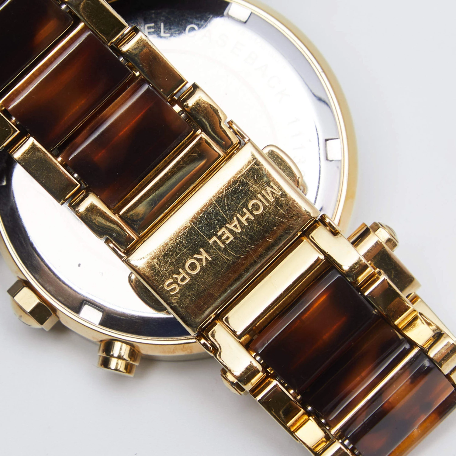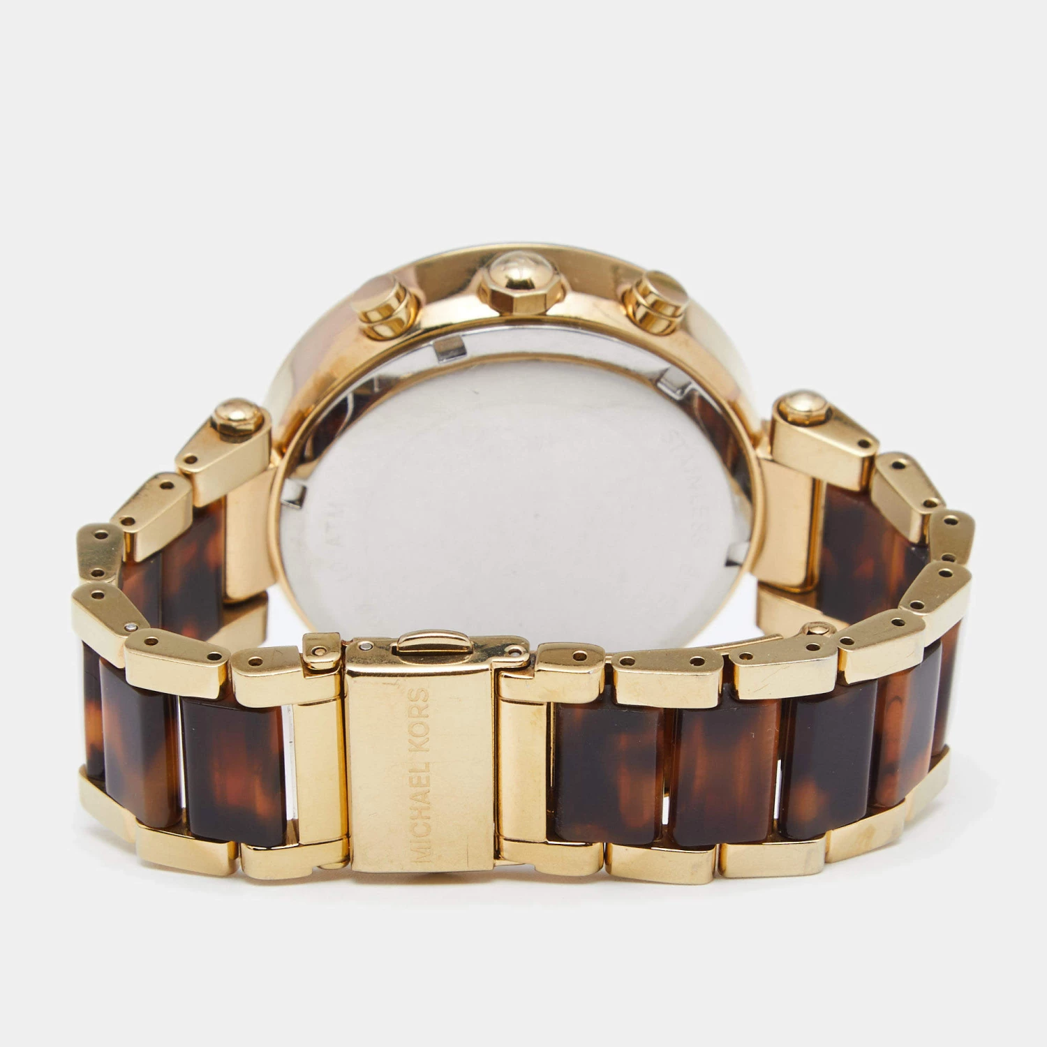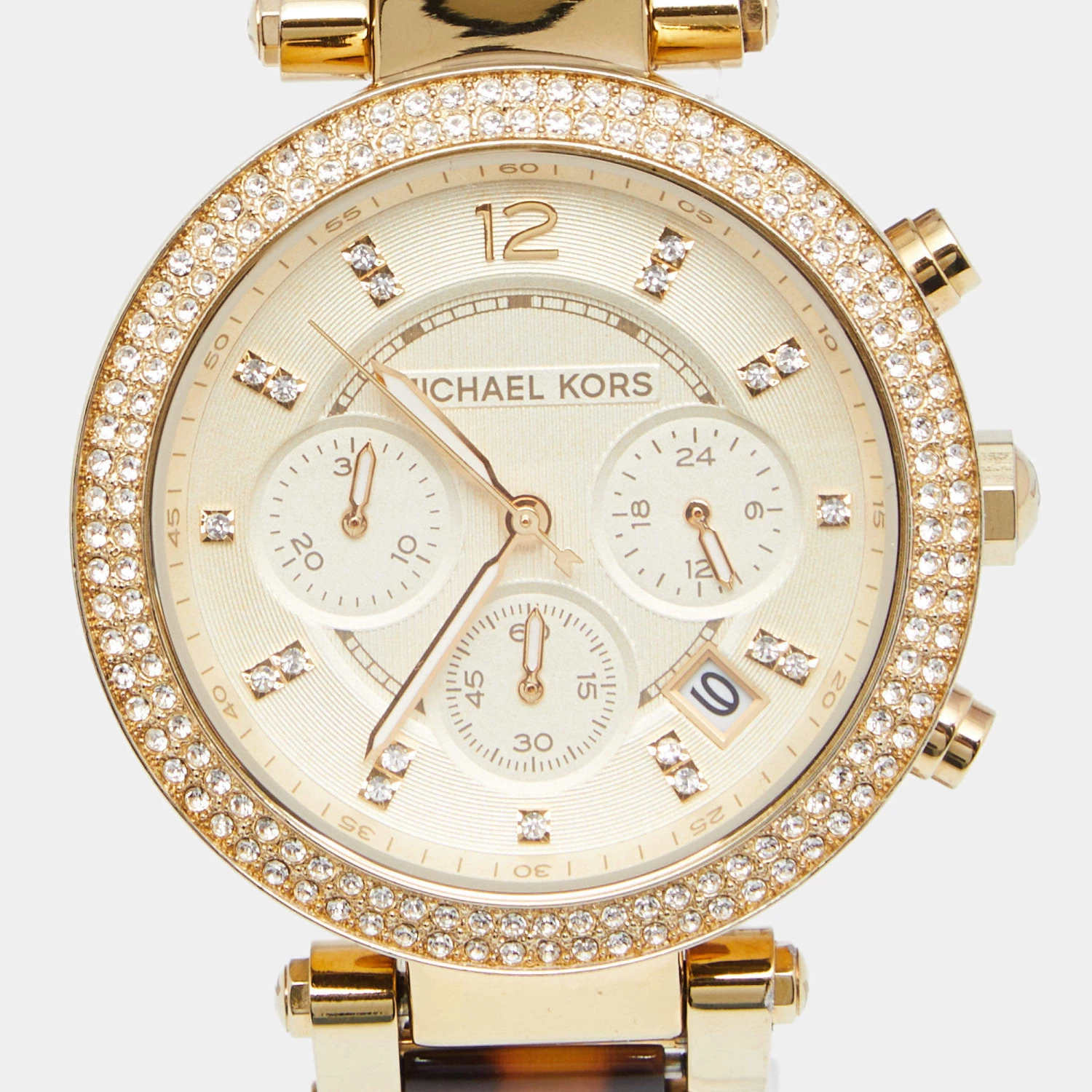 Set to shine on your wrist, this Michael Kors watch comes in a delighting gathering of the finest features. It has been wonderfully crafted from tortoise acetate, gold-plated stainless steel and designed with a bezel decorated with crystals. The scratch-resistant mineral glass protects a yellow dial that has crystal hour markers, a date window and three sub-dials. Lastly, the creation is topped by a water resistance of 100 meters and held by a bracelet with a push-button release.
