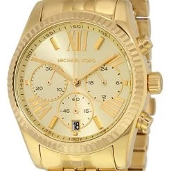 Constructed with a gold plated steel linked bracelet and a case with a fluted chic bezel, this Michael Kors Lexington wristwatch is perfect for everyday chic and stylish wear. With a yellow gold dial, this watch is completed with three sub dials and roman numbered hour indexes.