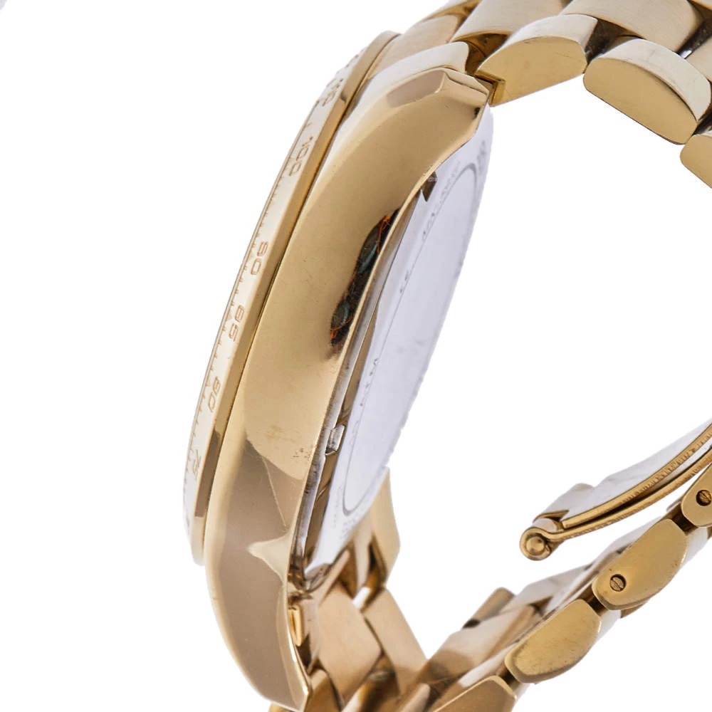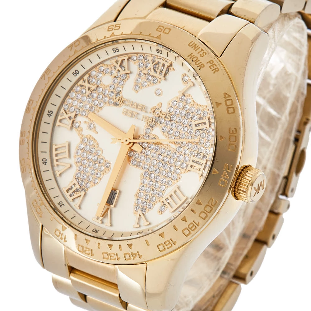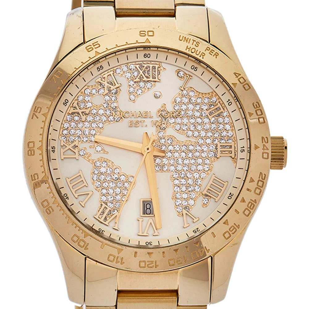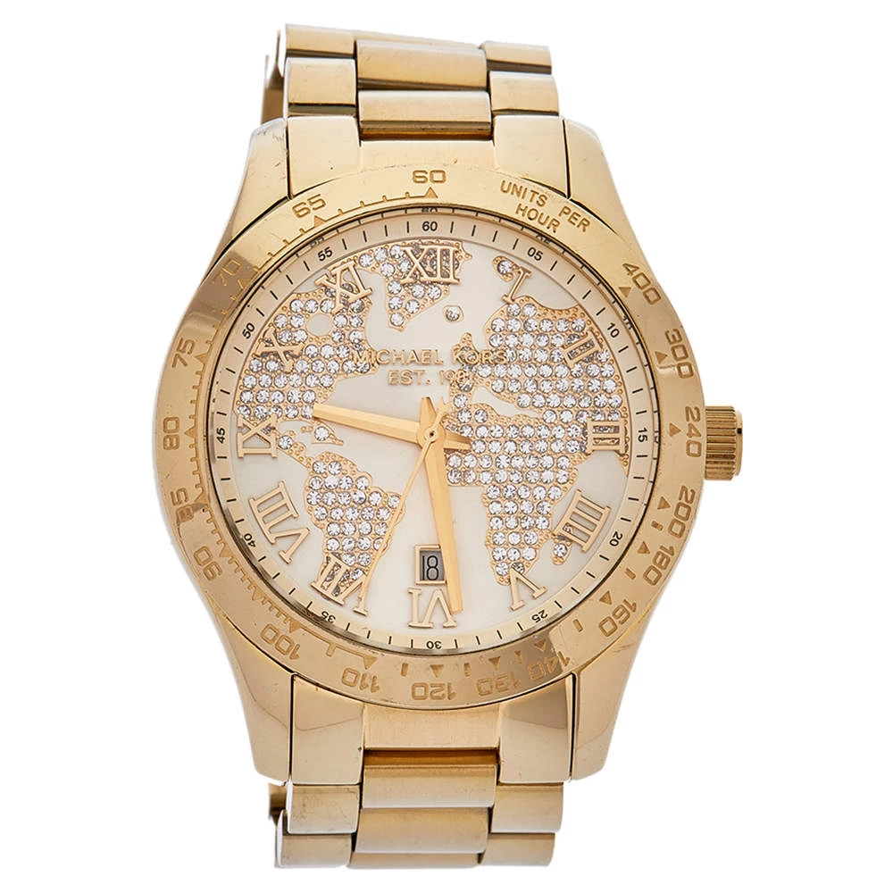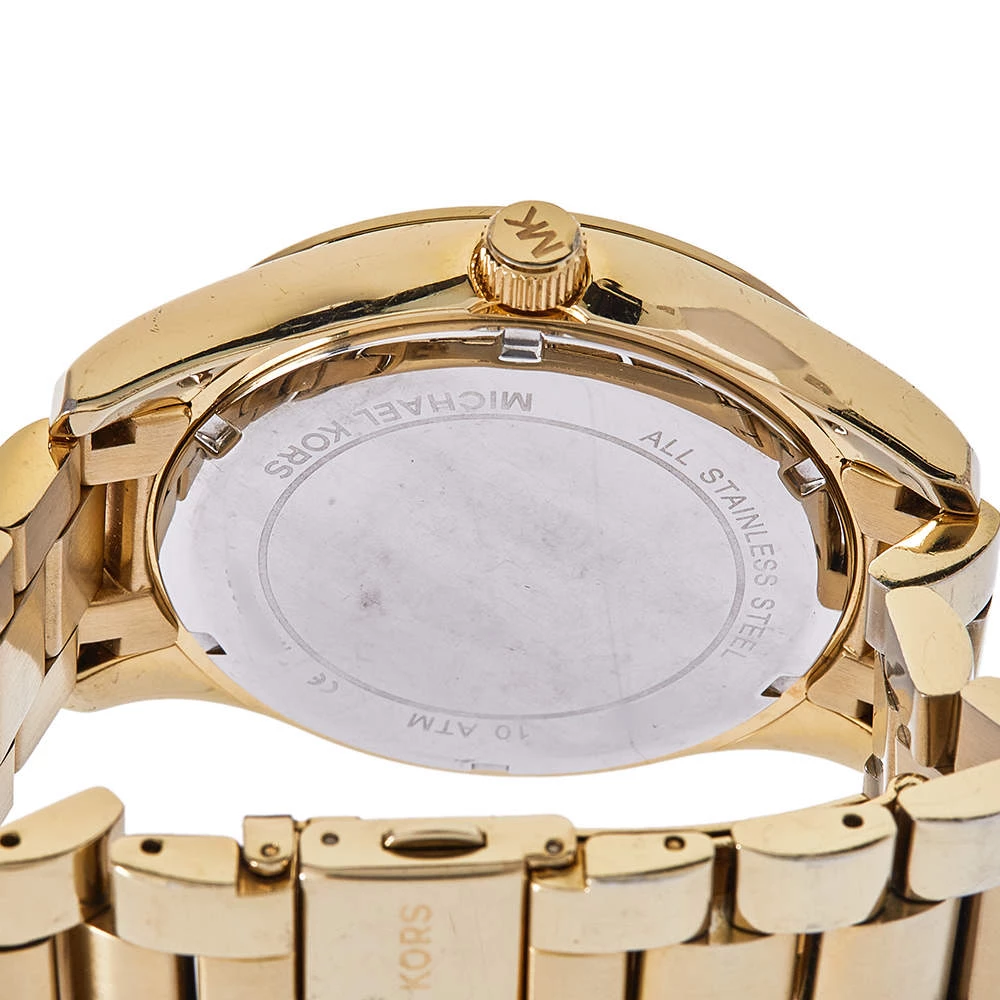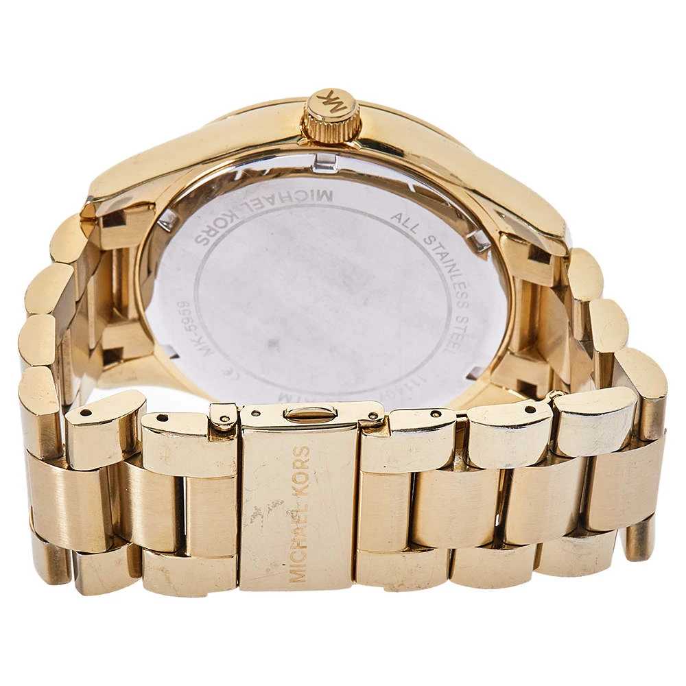 Michael Kors’ Layton MK5959 is a fine watch for everyday use. Designed using gold-tone stainless steel, the round-shaped case has a crystal-embellished dial accompanied by Roman numeral hour markers, three hands, and a date window. It is complete with a comfortable bracelet.