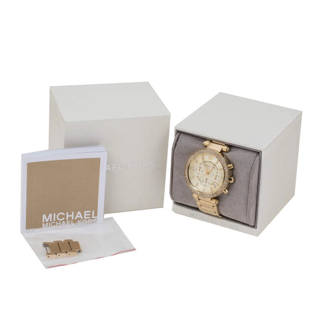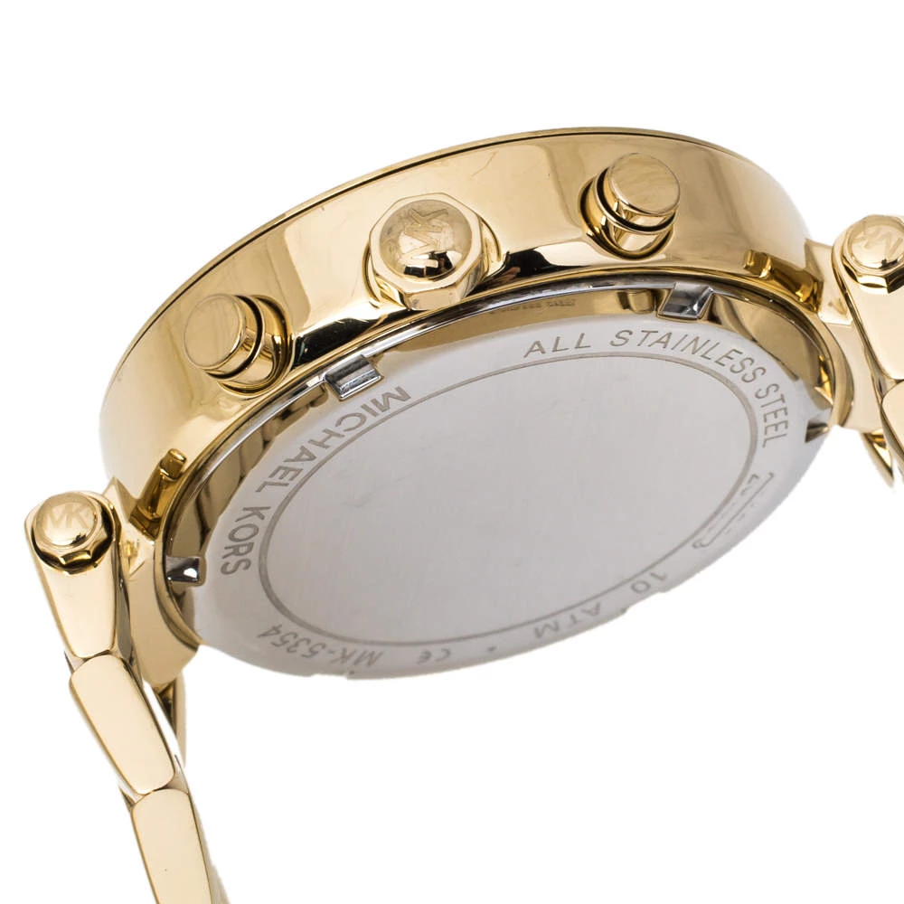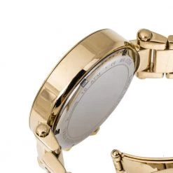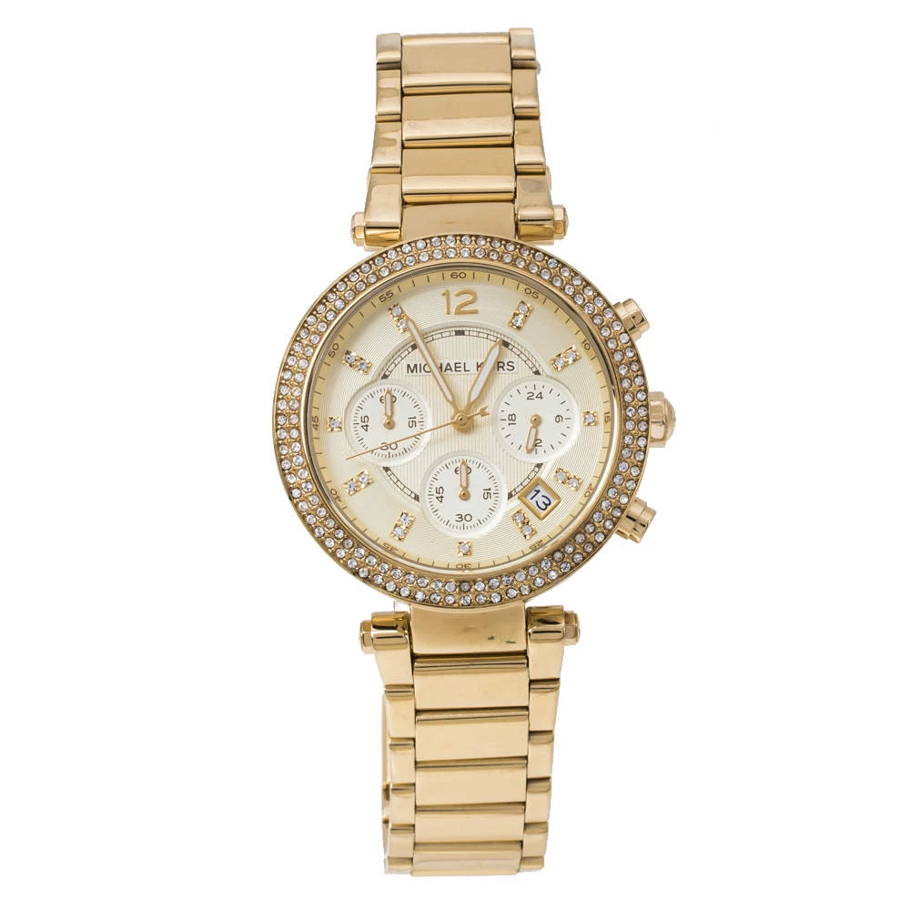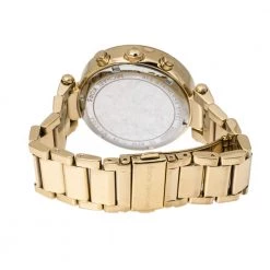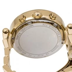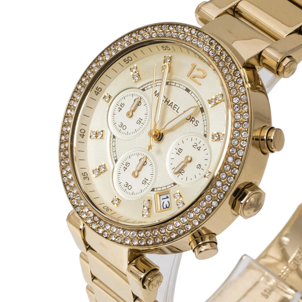 Set to shine on your wrist, this Michael Kors watch comes in a delightful gathering of the finest features. It has been wonderfully crafted from gold-tone stainless steel and designed with a bezel decorated with crystals. The scratch-resistant mineral glass protects a dial that has diamond hour markers, three hands, three subdials for the chronograph functions, and a date display window. Lastly, the creation is topped by a water resistance of 100 meters and held by a bracelet with a push-button release.