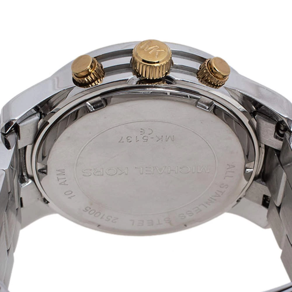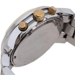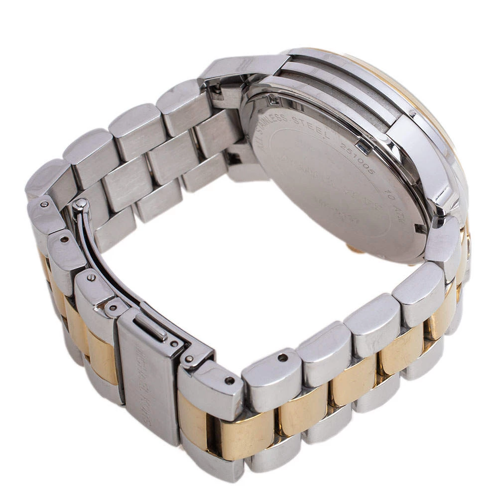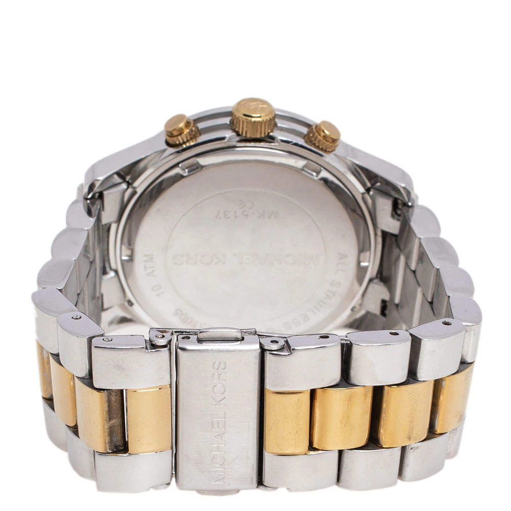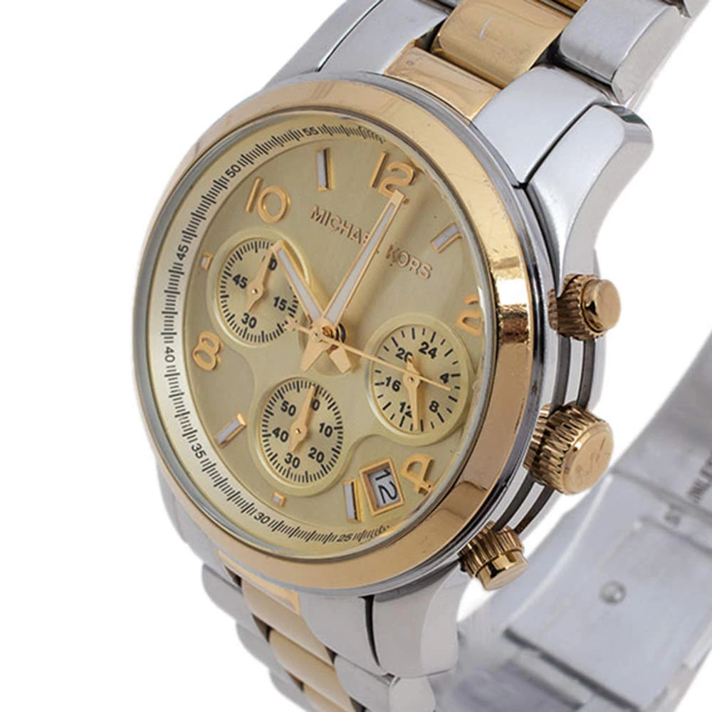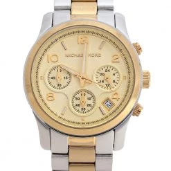 Designed with a fine blend of luxury and craftsmanship, this Runway MK5137 watch from Michael Kors is sure to delight your style. Made from two-tone stainless steel, it has a yellow gold dial with a date window and three sub-dials. The smooth bezel, 100 meters water resistance, and push-button clasp make the Quartz timepiece ready to be yours.