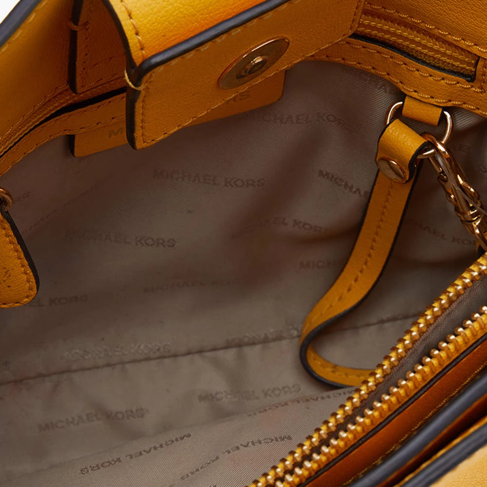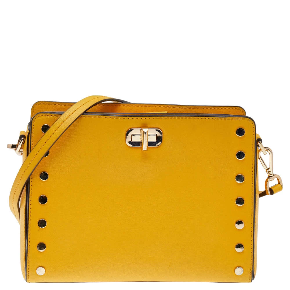 Made by Michael Kors, this handbag is a perfect balance of elegance and practical utility. This striking leather bag is designed with stud embellishments, a turn lock to the front, and a shoulder strap. The nylon-lined interior of the bag offers ample room for all your essentials. Attain a metropolitan, smart look when you couple this yellow bag with your favorite outfit.