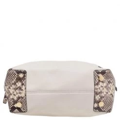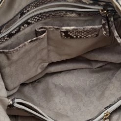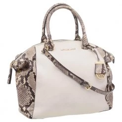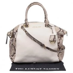 The Riley satchel from Michael Michael Kors presents a beautiful style with its uniquely carved exterior. Externally, it is made using beige-black python-embossed leather and leather and shows delicate gold-toned embellishments. Give your daily items a stylish space as you carry this satchel.