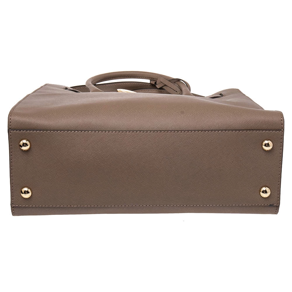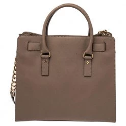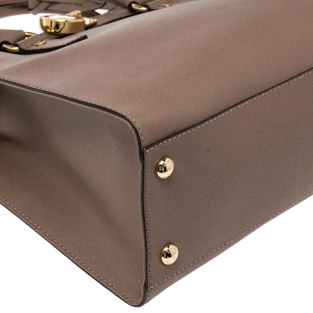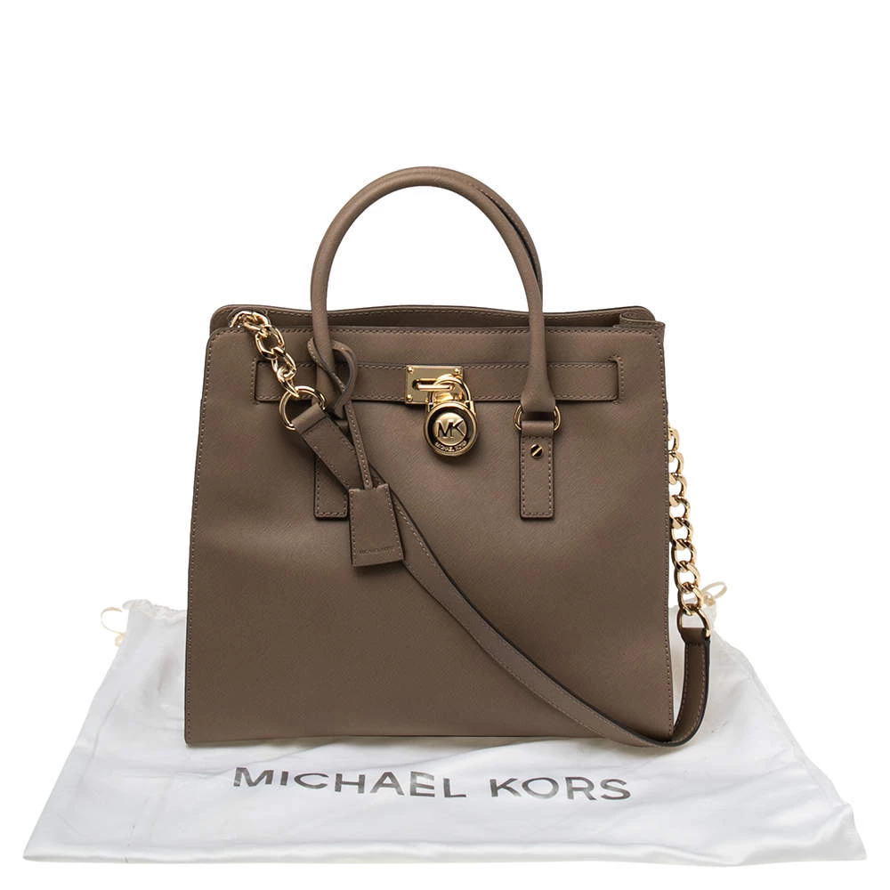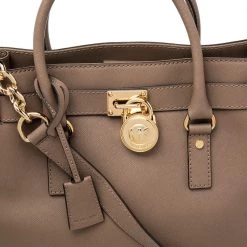 This Hamilton tote is from MICHAEL Michael Kors. It is crafted from beige leather and decorated with an engraved padlock on the front. The bag has two handles, a shoulder strap, and a spacious nylon interior. This creation is ideal for everyday use.