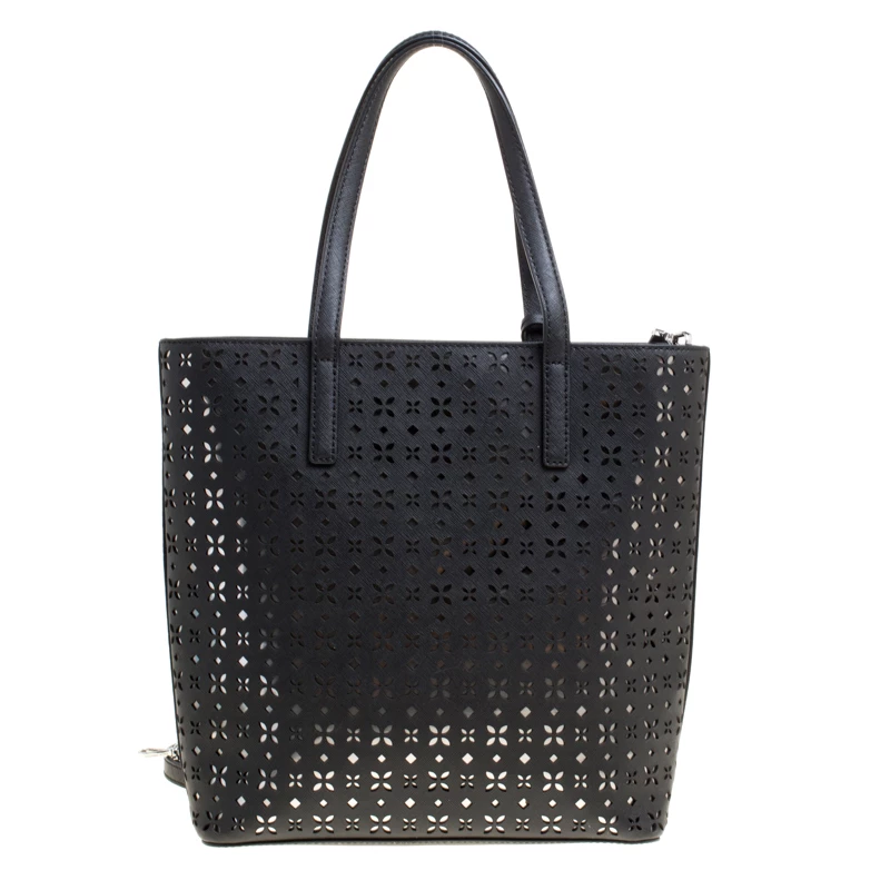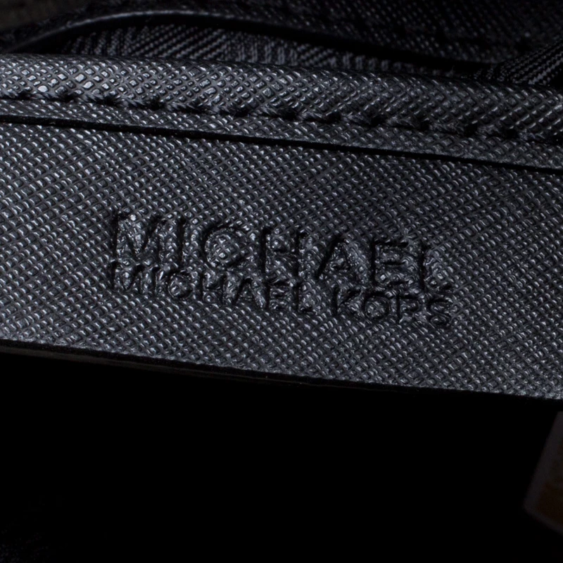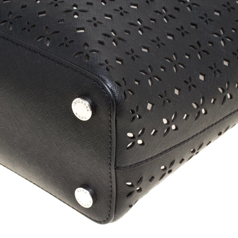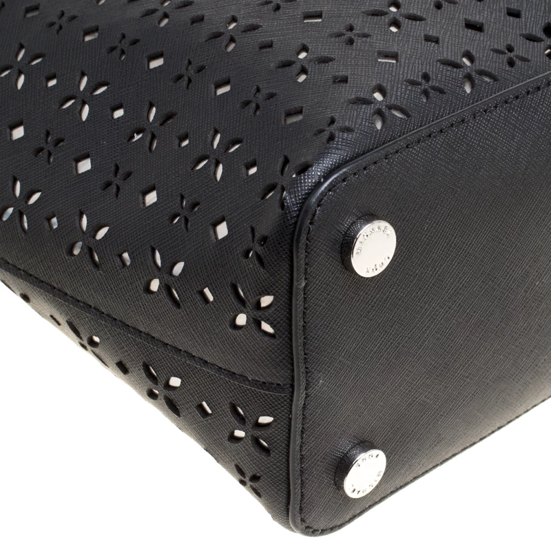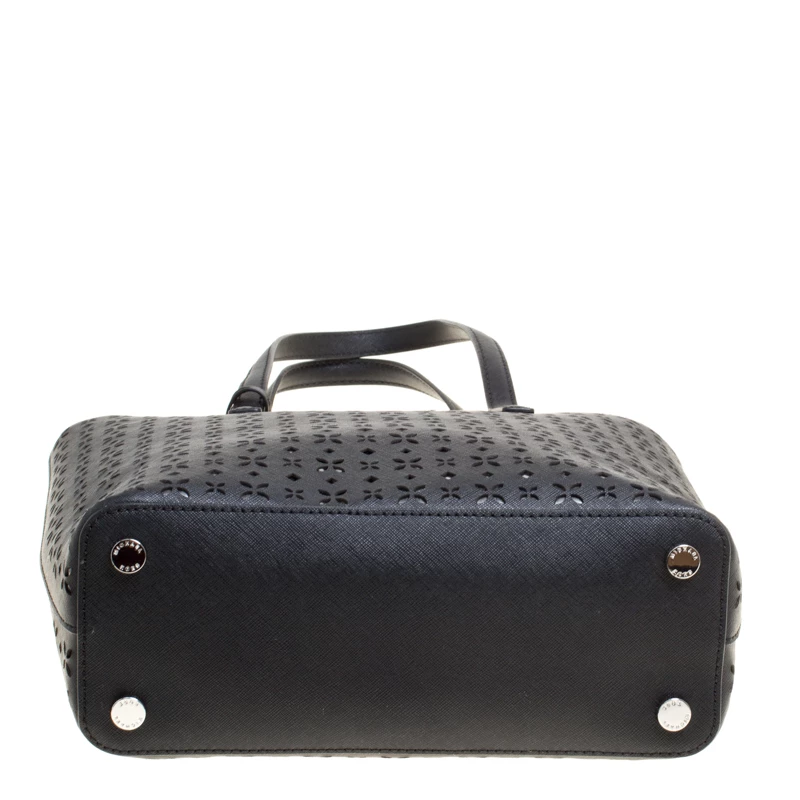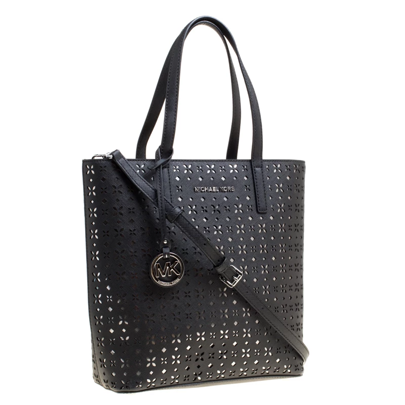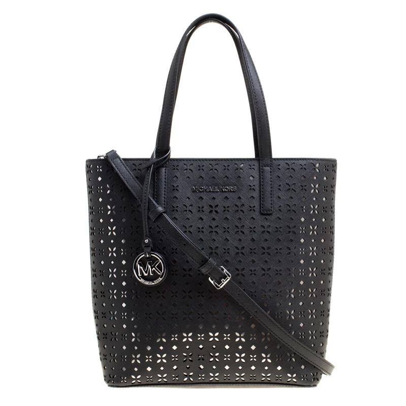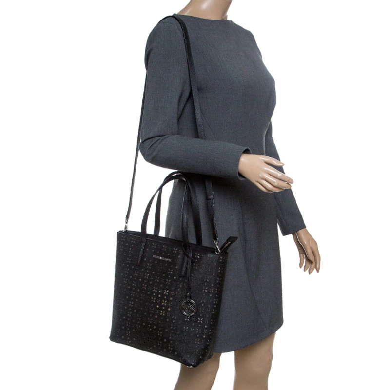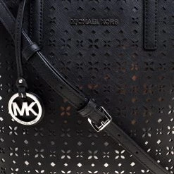 This tote from Michael Michael Kors is a creation meant to assist you with style and ease. It comes crafted from black leather covered in laser cuts and accompanied by an MK tag. Two handles are provided for you to carry it, and a spacious fabric interior is to house your belongings.