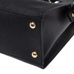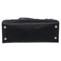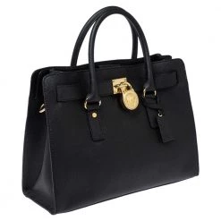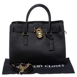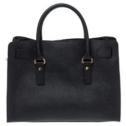 This Hamilton tote is from Michael Kors. It has been crafted from leather in a black shade and decorated with an MK padlock on the front. The bag has two handles, a shoulder strap, and a spacious fabric interior. This creation is ideal for everyday use.