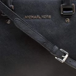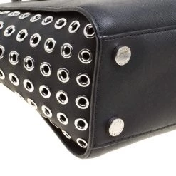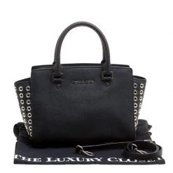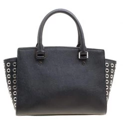 This adorable Selma tote from Michael Michael Kors is both elegant and fashionable. Crafted from black leather, the bag features a detachable shoulder strap along with two top handles. The fabric lined interior houses a zip pocket and will hold your essentials. This exquisite bag, styled with pretty eyelets, will complete all your evening ensembles.