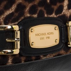 Be the trendsetter this season by adorning this classy bag from Michael Michael Kors. The bag is crafted from leather and features a leopard print calfhair flap. It is held by dual chain handles and flaunts belt detailing on the front. The nylon lined interior is well-sized.