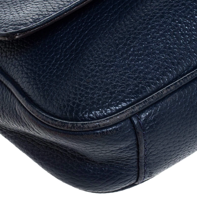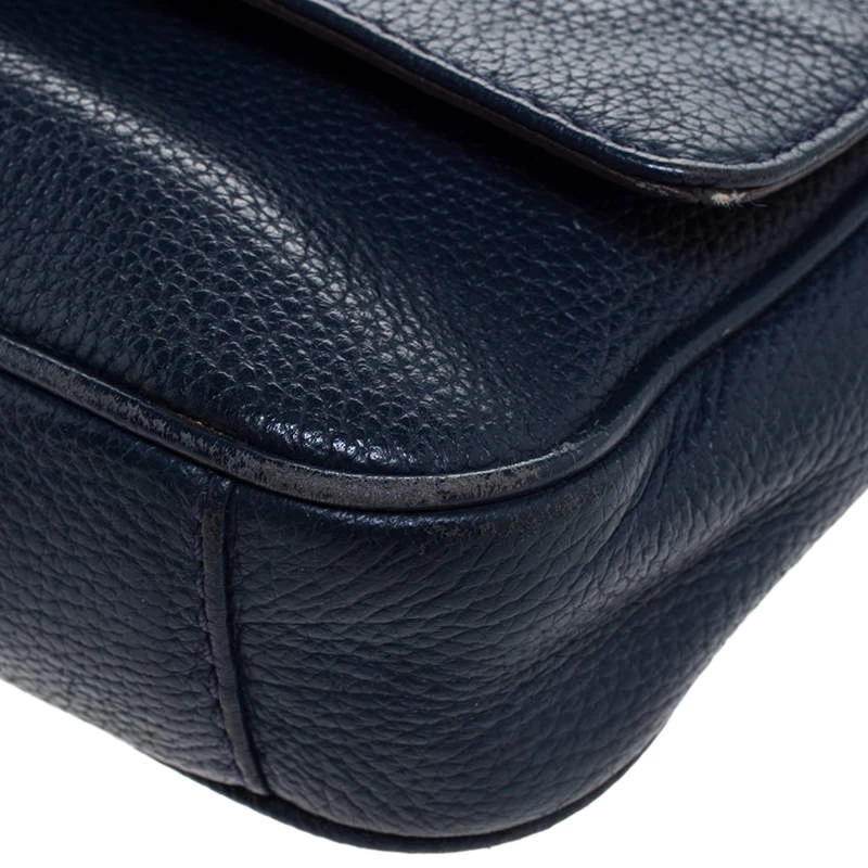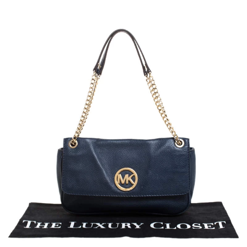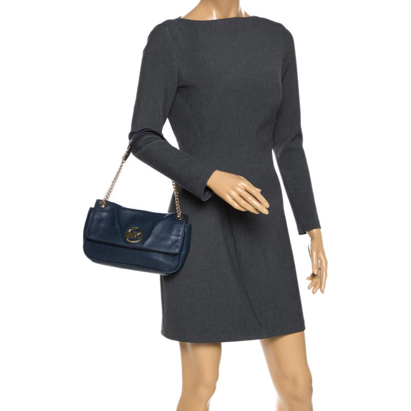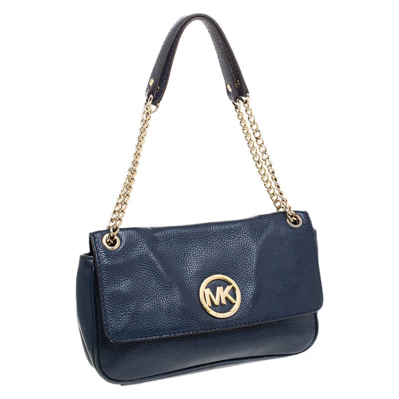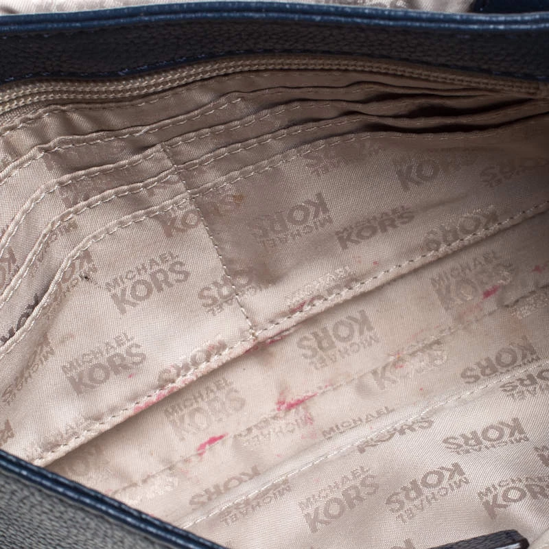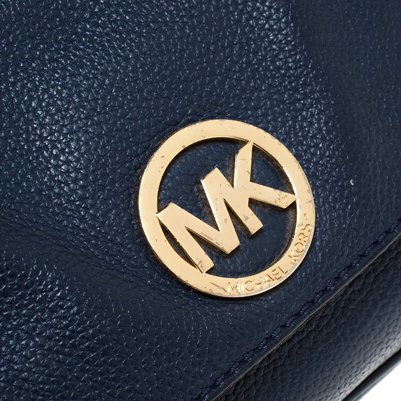 Upgrade your look with this Michael Kors handbag instantly. Crafted from quality leather, it comes in a lovely shade of blue. It has a front flap with the MK logo that opens to a nylon-lined interior with several card slots and a zip pocket. It is finished with dual handles and gold-tone hardware.
