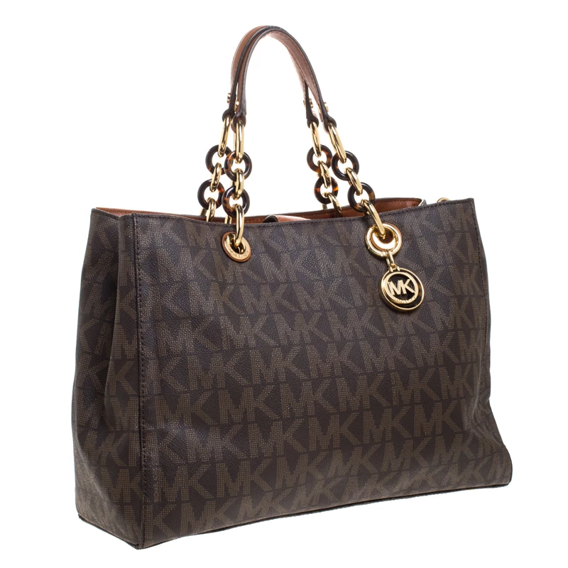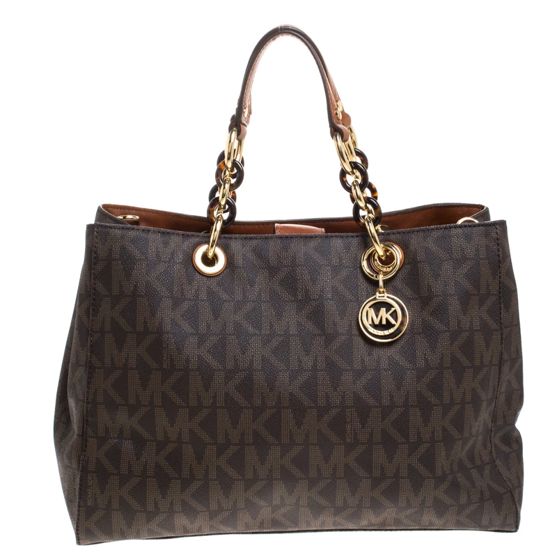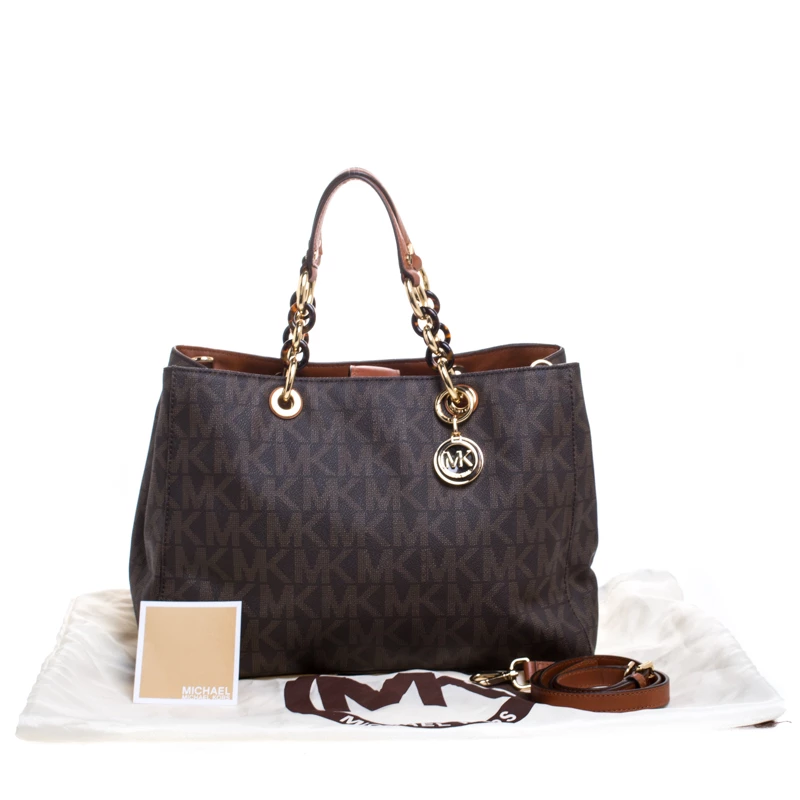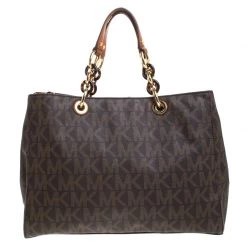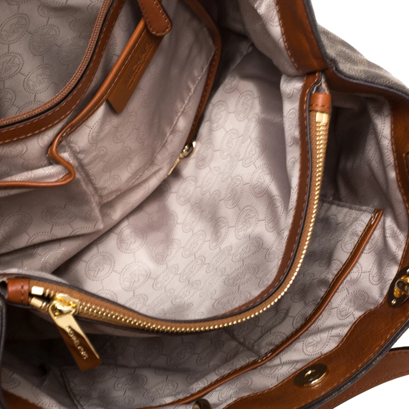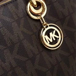This Cynthia tote by Michael Kors is a bag ready to blend in with the busy life of the women of today. Meticulously crafted from signature coated canvas, it features a brown hue and two handles for you to parade it. The bag is equipped with a spacious nylon-lined interior with enough space for all your essentials. Complete with gold-tone hardware and their MK charm, this bag will make an ideal buy.