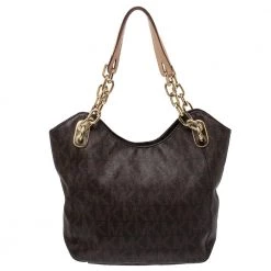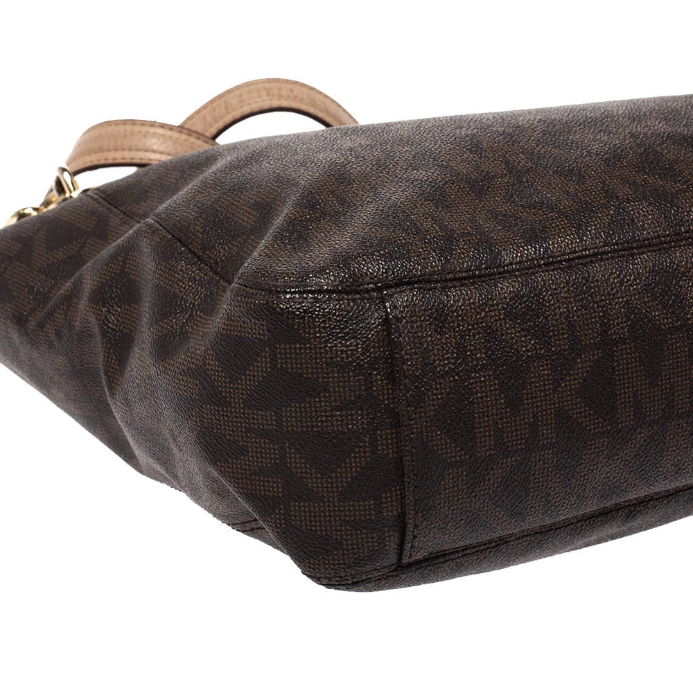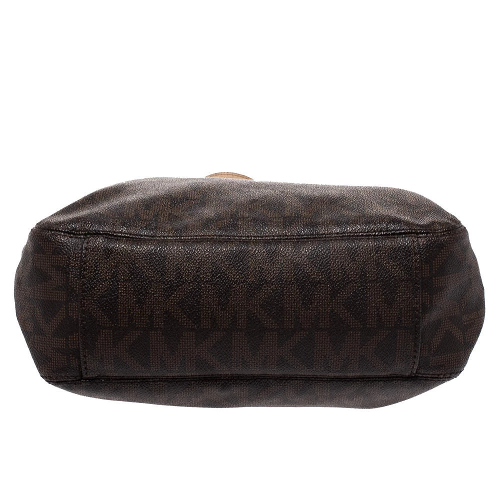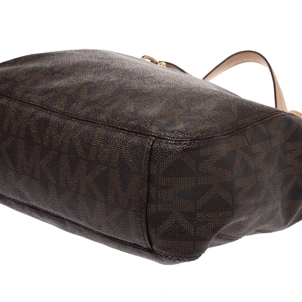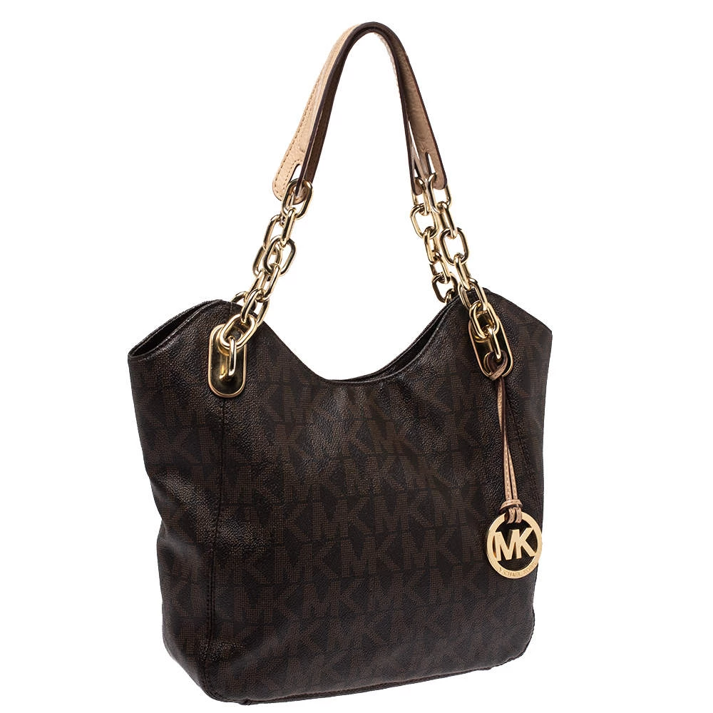 Crafted from signature canvas, this brown Michael by Michael Kors bag opens to a spacious nylon-lined interior housing a zip pocket. The bag is equipped with dual top handles and a gold-tone MK charm. Swing this beauty wherever you go to lend your outfit the appropriate measure of class and style.