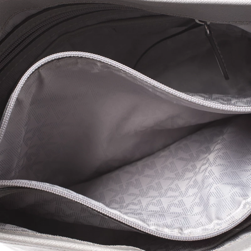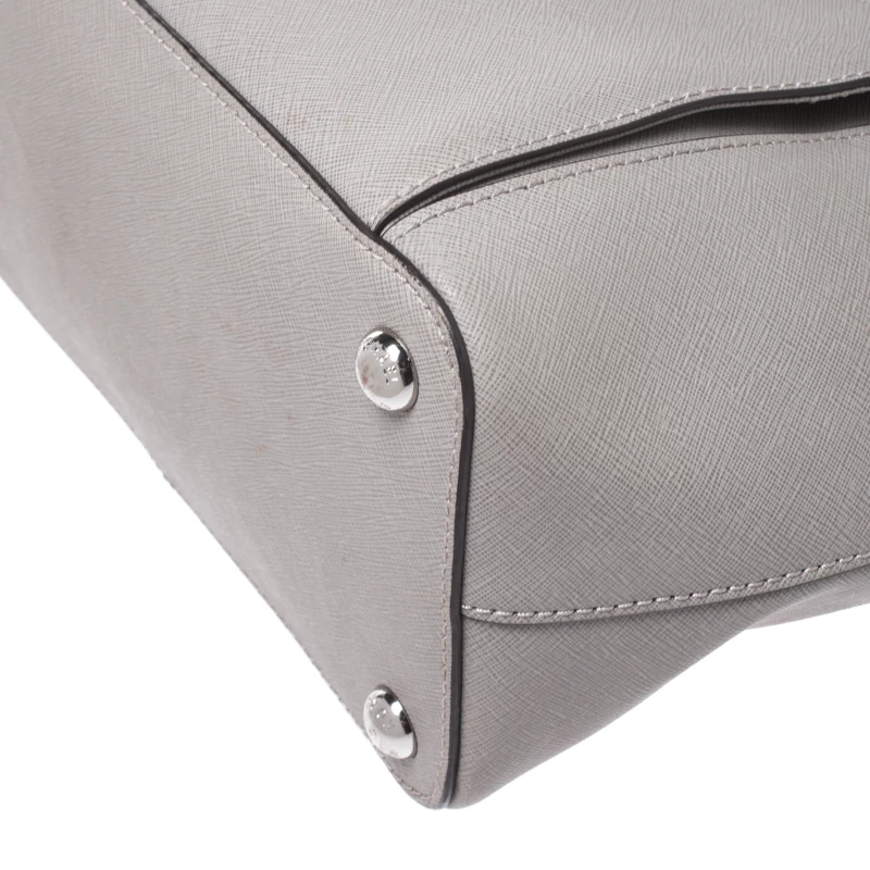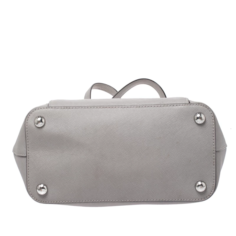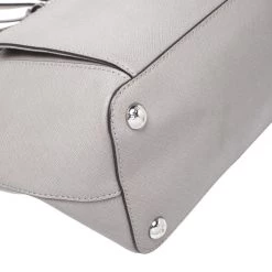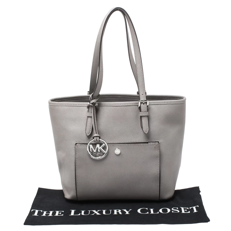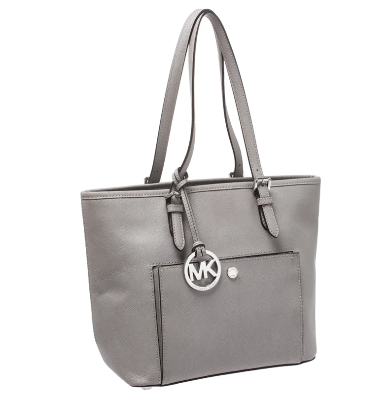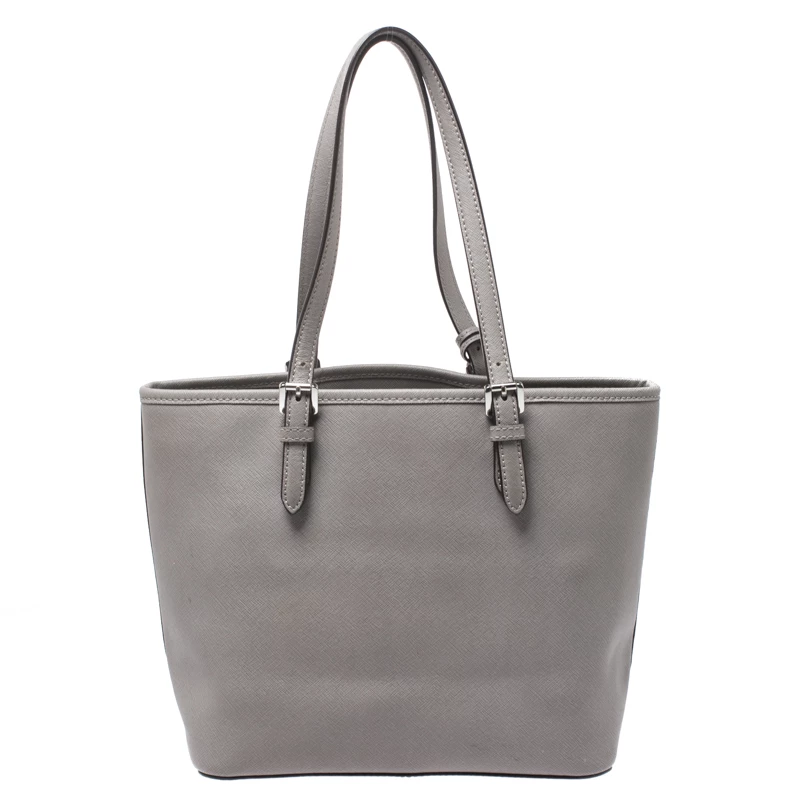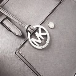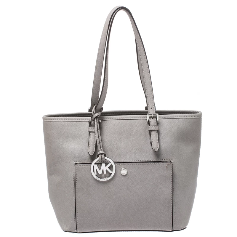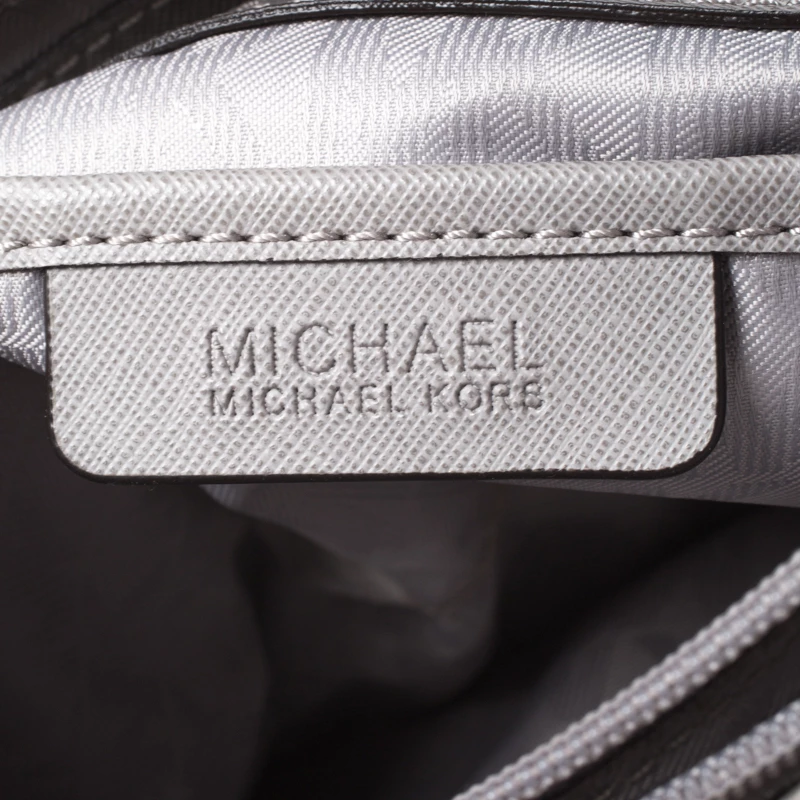 This tote from Michael Kors is a creation meant to assist you with style and ease. It comes crafted from grey leather and accompanied by an MK tag and a front pocket. Two handles are provided for you to carry it, and a spacious nylon interior is to house your belongings.