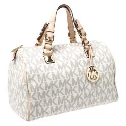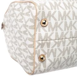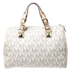A truly posh and elegant piece to add to your collection. This Boston bag by MICHAEL Michael Kors is crafted from signature coated canvas and styled with beige leather trims. It features a top zip closure, dual handles, and a spacious fabric-lined interior to house your essentials. This bag works well for all occasions.