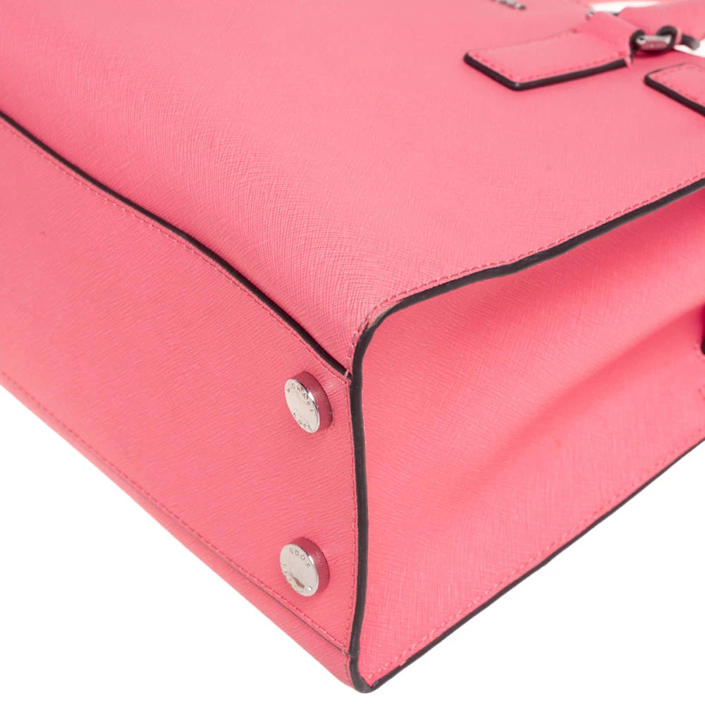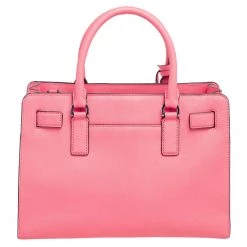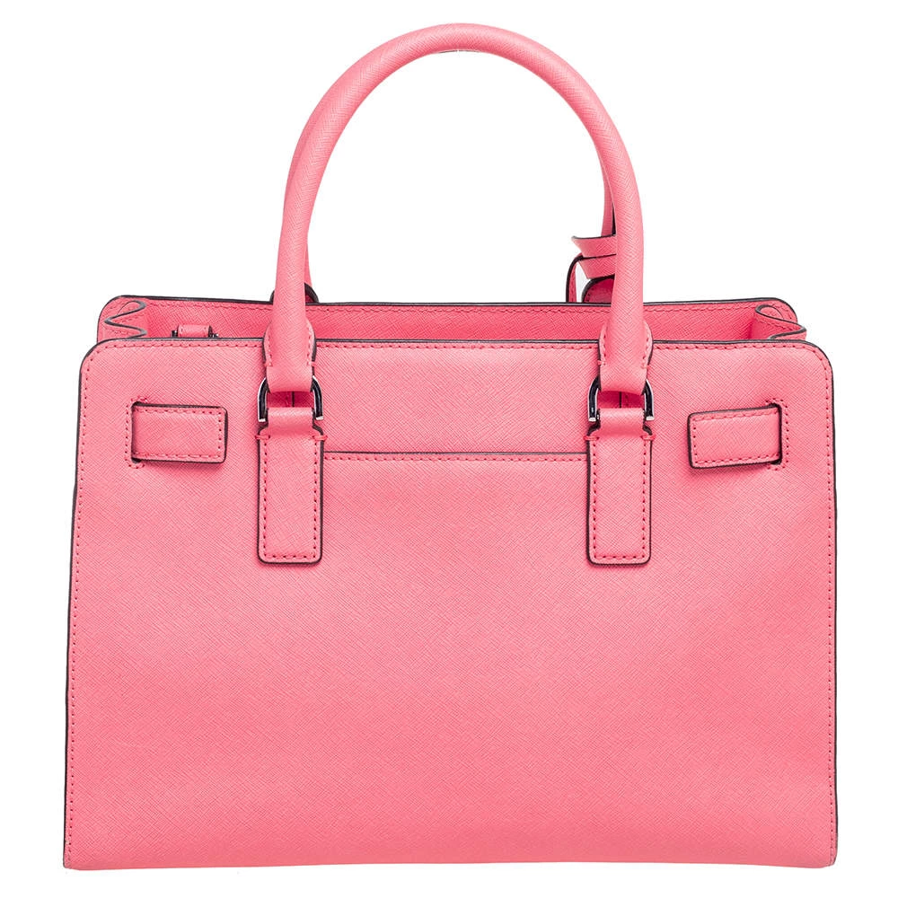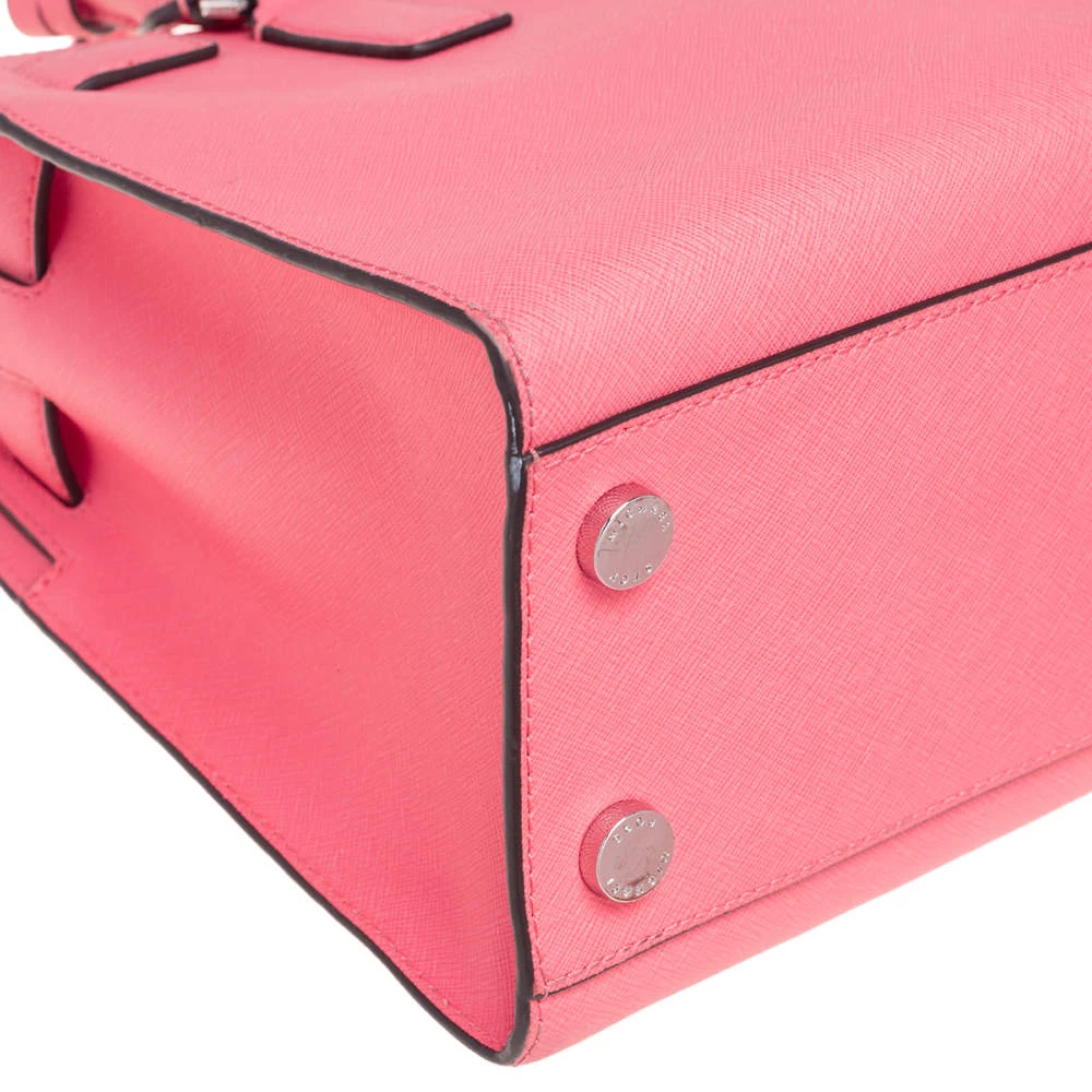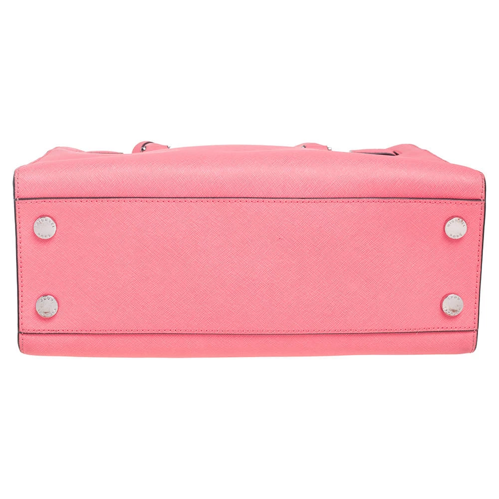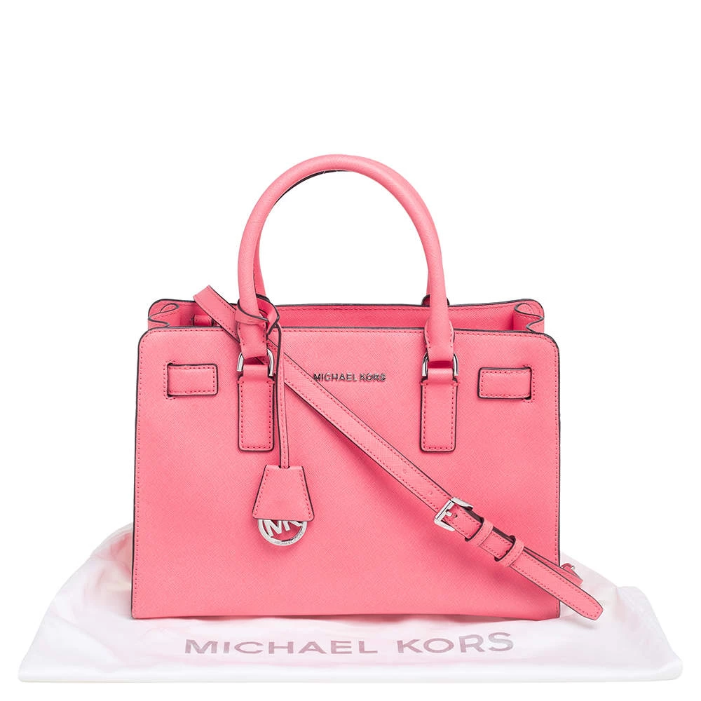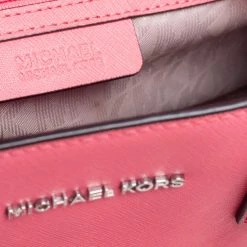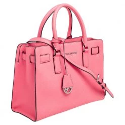 This elegant MICHAEL Michael Kors Dillon bag deserves to be in your closet. High in appeal, the bag features dual handles, a shoulder strap, and an MK charm. It’s crafted from neon pink Saffiano leather and the nylon-lined interior houses pockets.
