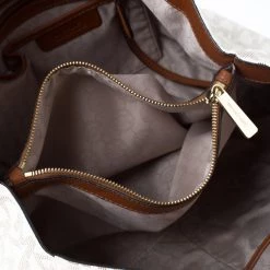 This Cynthia tote by MICHAEL Michael Kors is a piece all fashionistas must look out for! Meticulously crafted from signature coated canvas, it features an off white hue and two handles for you to parade it. The bag is equipped with a spacious fabric-lined interior that has a zip compartment. Complete with gold-tone hardware, this bag will make an ideal buy.