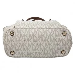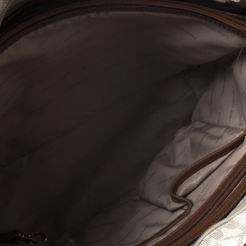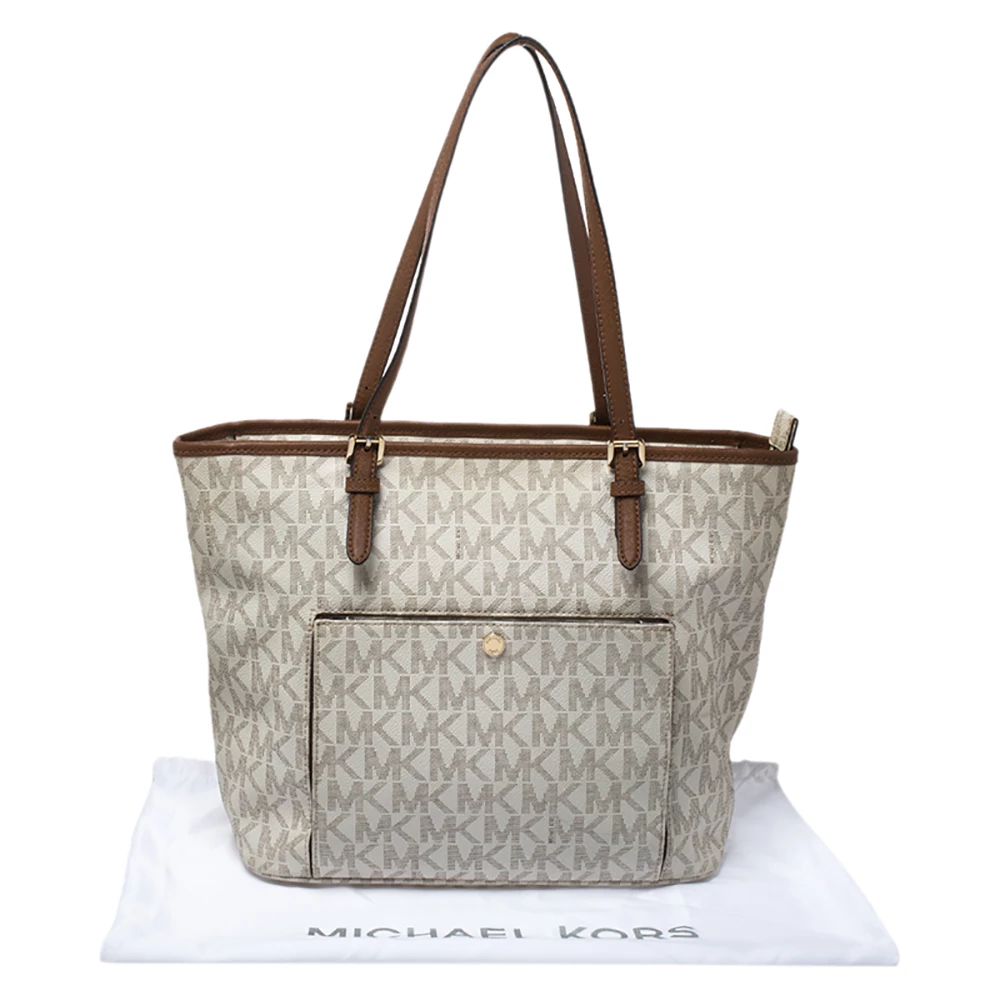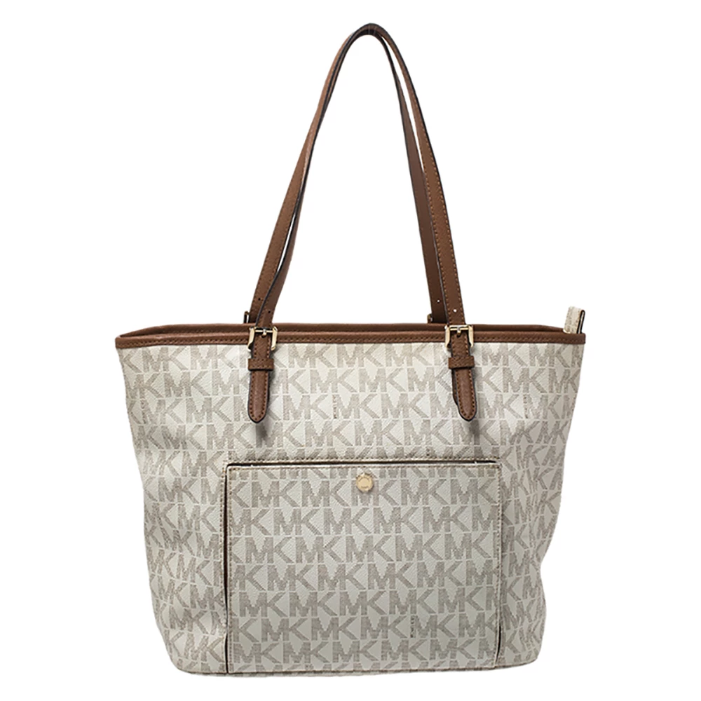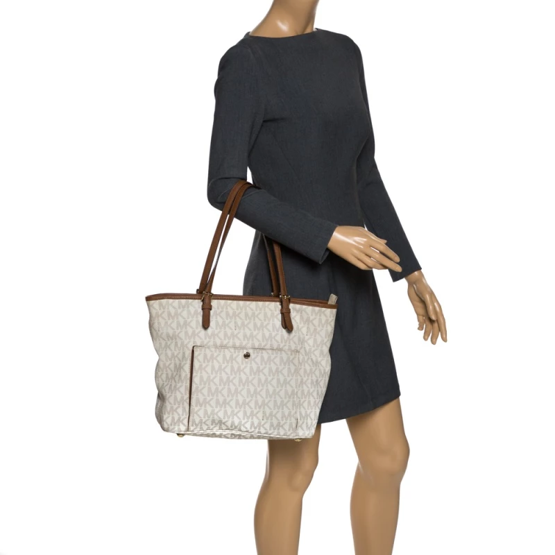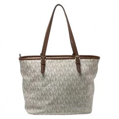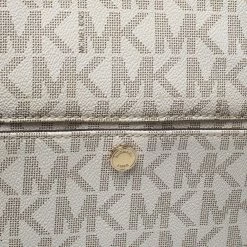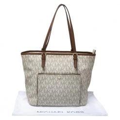 This tote from Michael Kors is a creation meant to assist you with style and ease. It comes crafted from off-white signature canvas and accompanied by an MK tag and a front pocket. Two handles are provided for you to carry it, and a spacious nylon-lined interior to house your belongings.