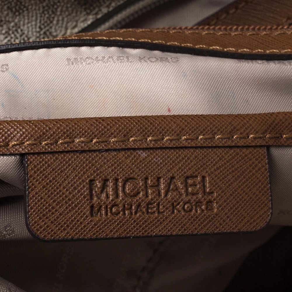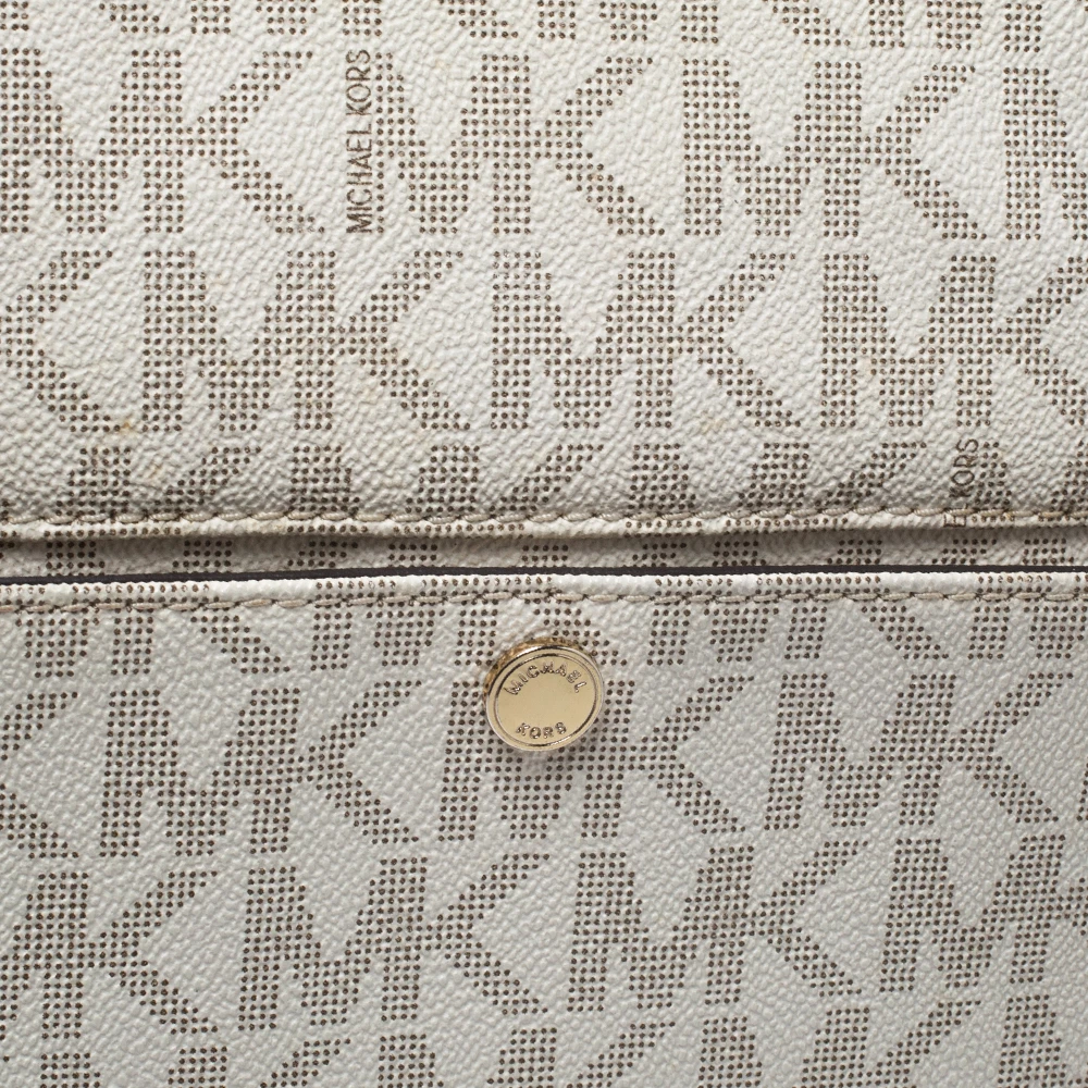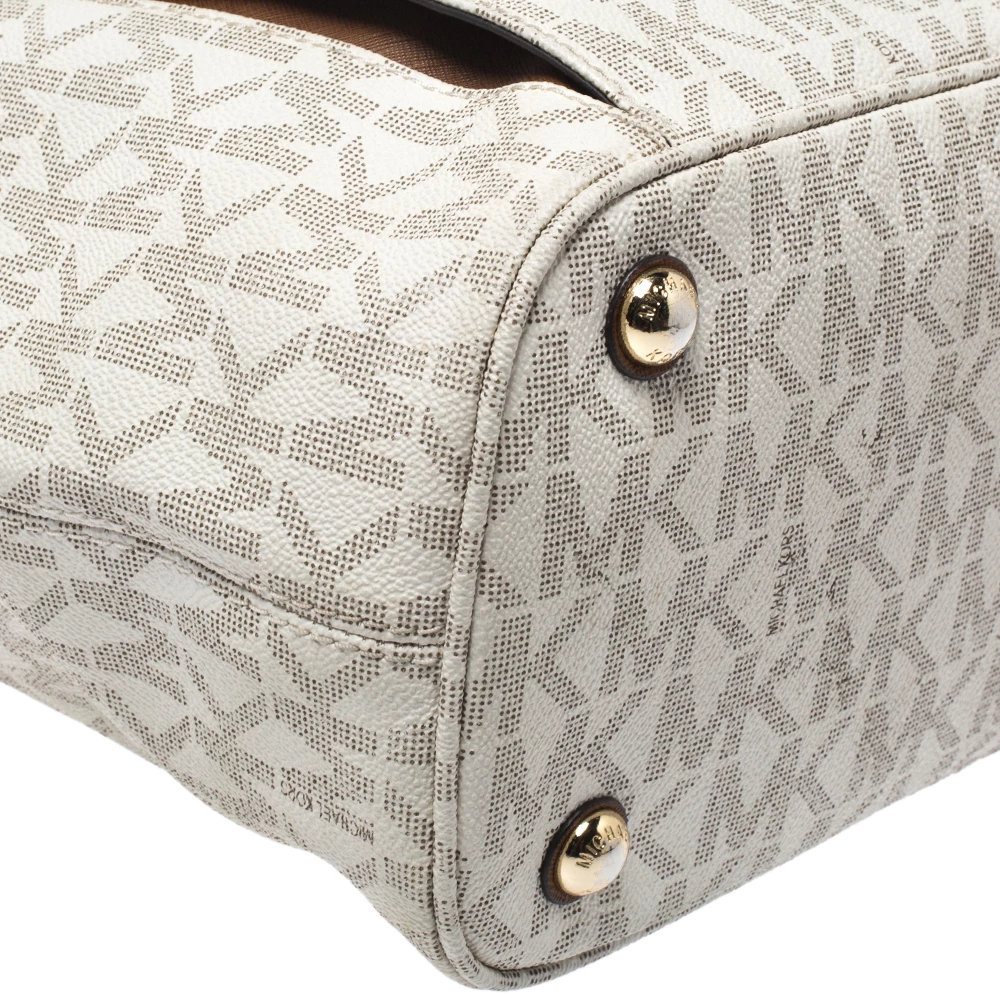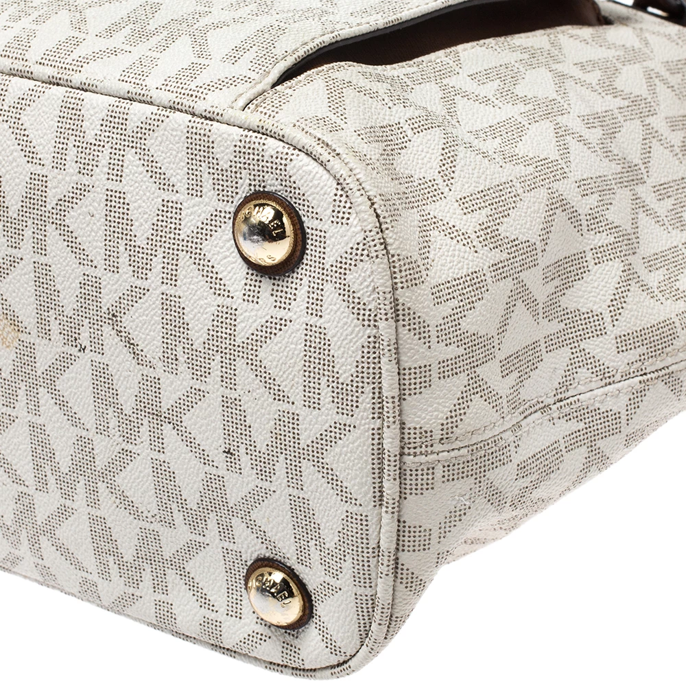This tote from Michael Kors is a creation meant to assist you with style and ease. It comes crafted from off-white signature canvas and accompanied by an MK tag and a front pocket. Two handles are provided for you to carry it, and a spacious nylon-lined interior to house your belongings.