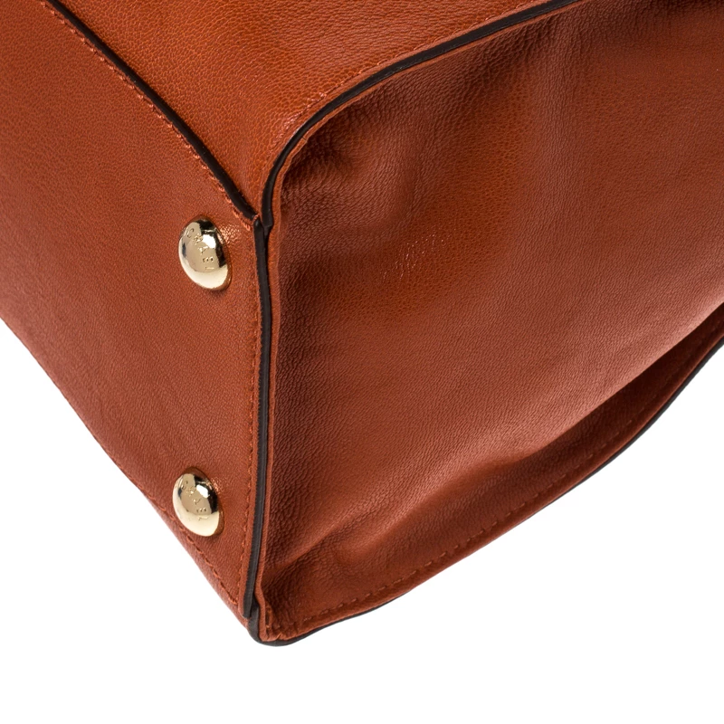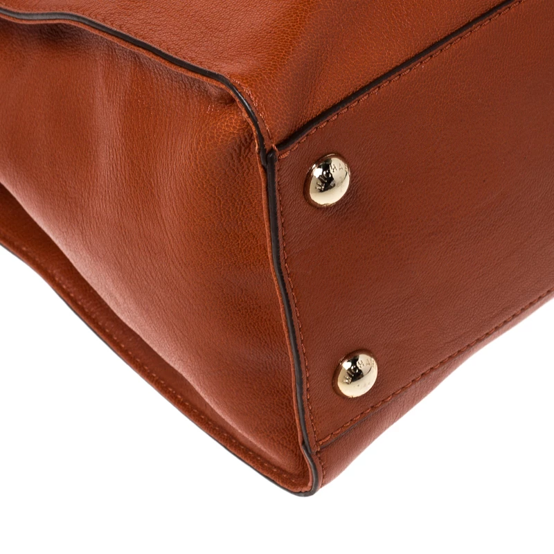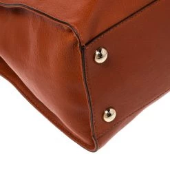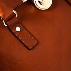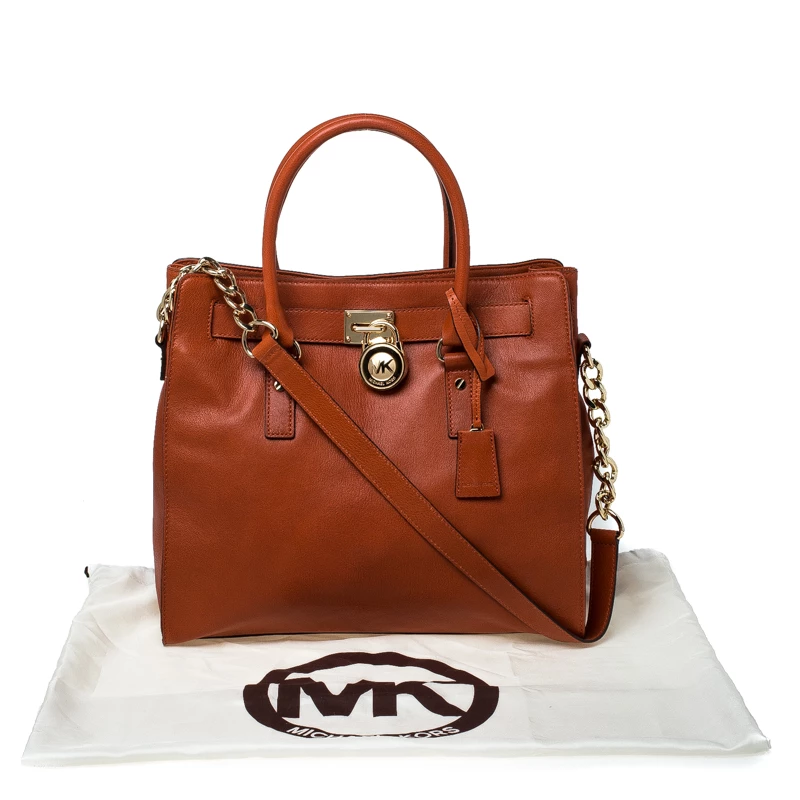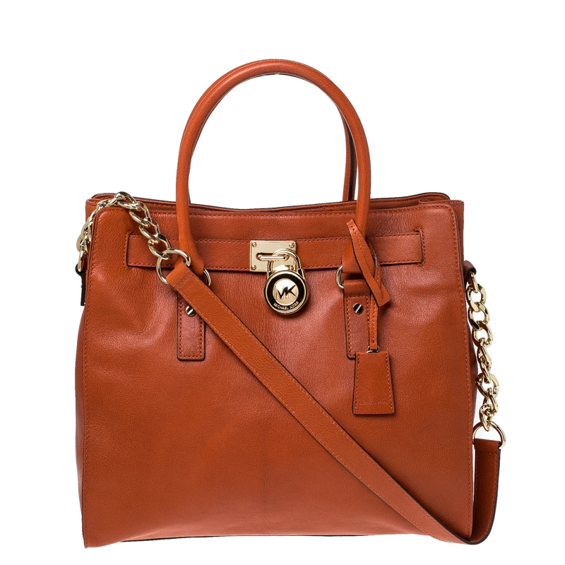 This Hamilton tote is from Michael Kors. It has been crafted from leather in an orange shade and decorated with a MK padlock on the front. The bag has two handles, a shoulder strap, and a spacious nylon interior. This creation is ideal for everyday use.