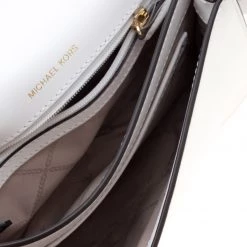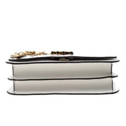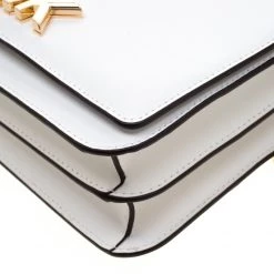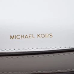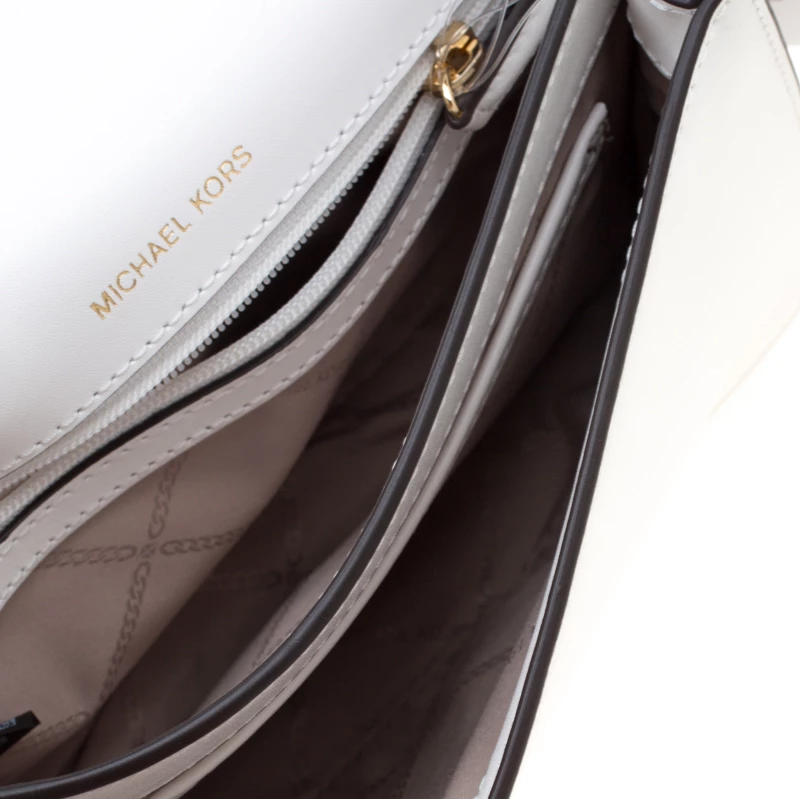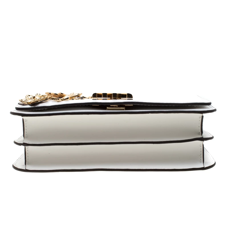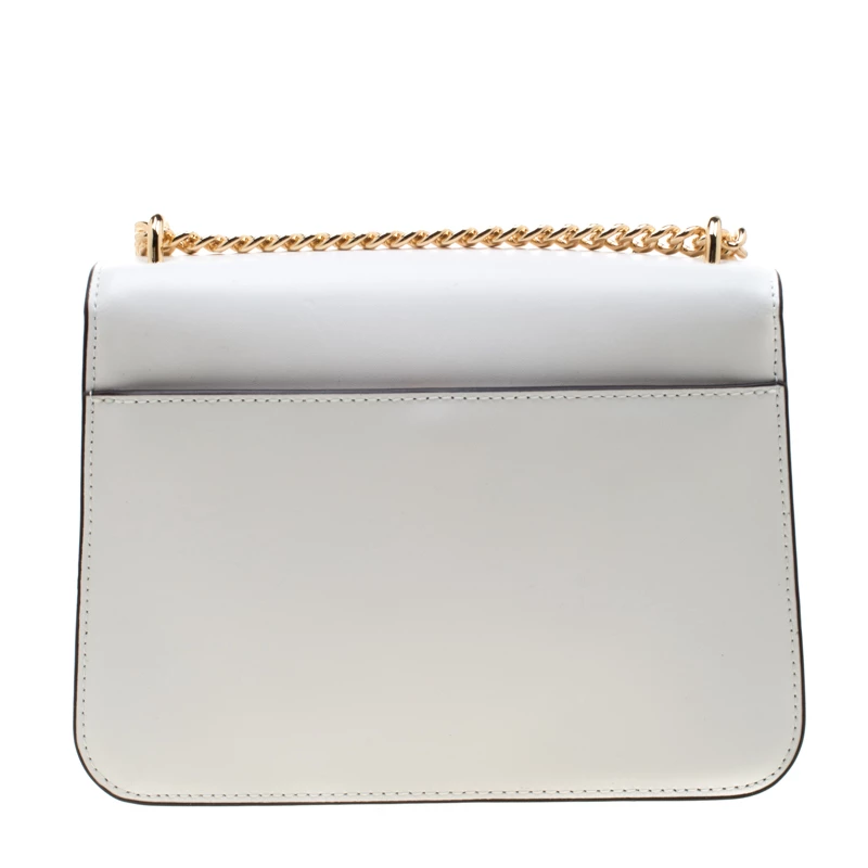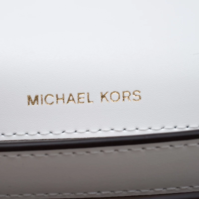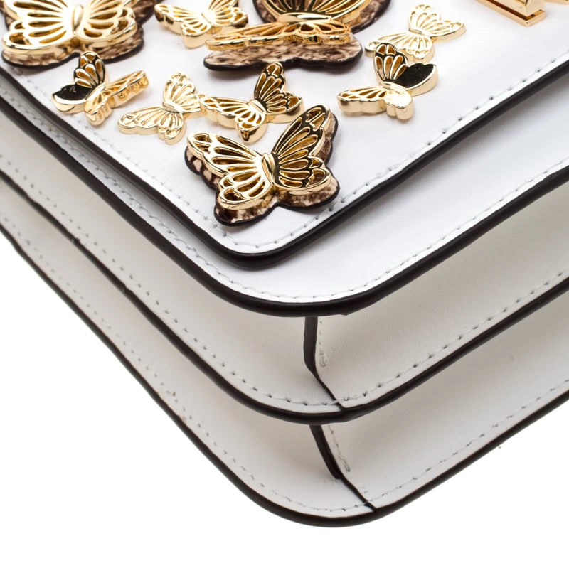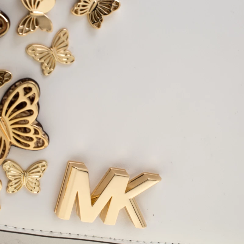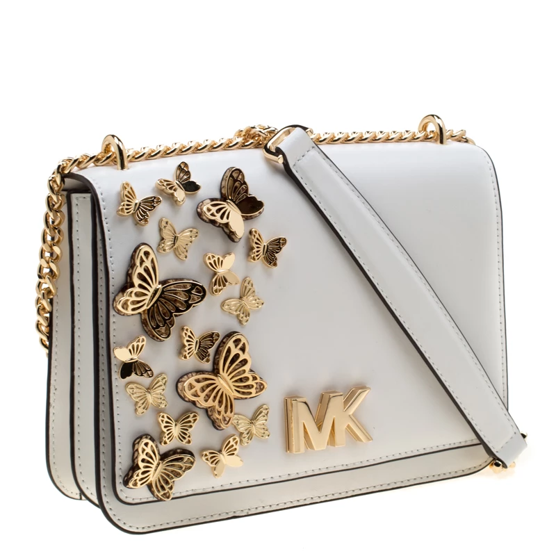 This Mott Butterfly bag by Michael Michael Kors is chic and eye-catching. This bag is crafted from white leather and features gold-tone butterfly appliques on the front flap. It has a sleek design and a gold-tone chain link with a leather shoulder rest. The bag boasts a spacious, fabric-lined interior housing a slip and a zip pocket. Make a style statement and feel flawless when carrying this bag.